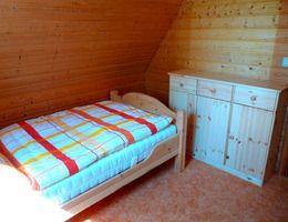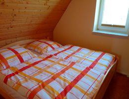 Die Schlafzimmer befinden sich im Dachgeschoss und sind über eine recht steile Treppe zu erreichen. Eines der Schlafzimmer ist eingerichtet mit einem Doppelbett, einer Kommode und einem Hocker. Das zweite Schlafzimmer hat zwei Einzelbetten, auch eine Kommode und einen Hocker. Zwischen den beiden Zimmern im kleinen Flur gibt es eine Kleiderstange.