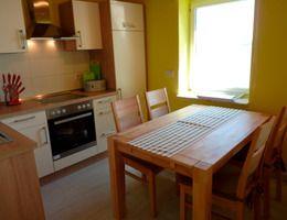 Der Wohnraum mit integrierter offener Küche hat zwei Couchen, einen Flachbildfernseher und einen Esstisch mit Stühlen. In der Küche finden Sie einen Backofen, ein Cerankochfeld, einen Geschirrspüler, einen Kühlschrank mit Tiefkühlfach, eine Kaffeemaschine, einen Wasserkocher und einen Toaster.