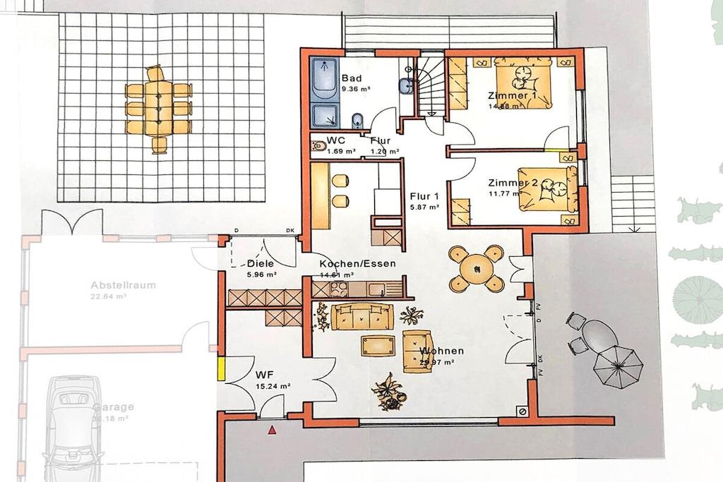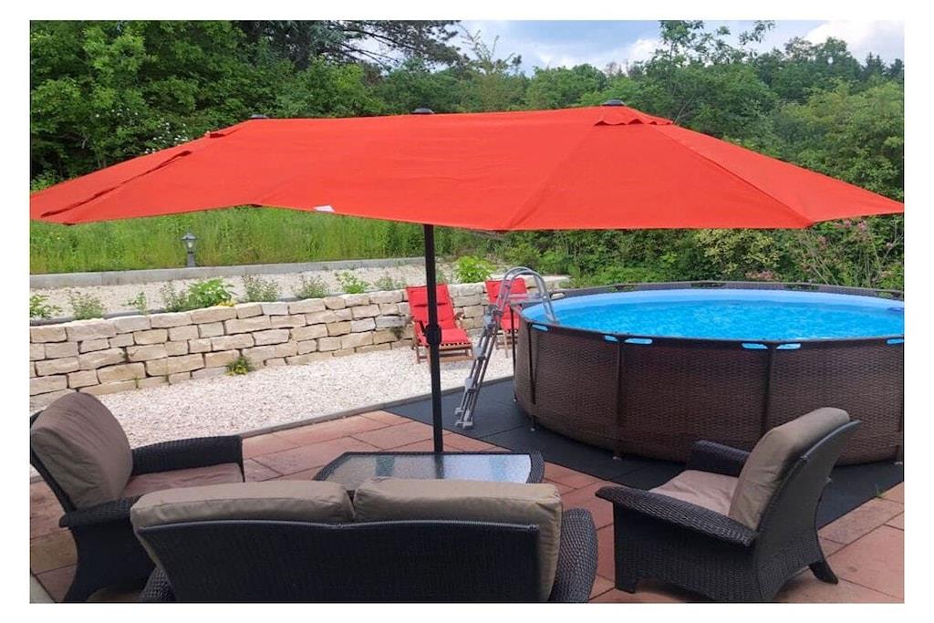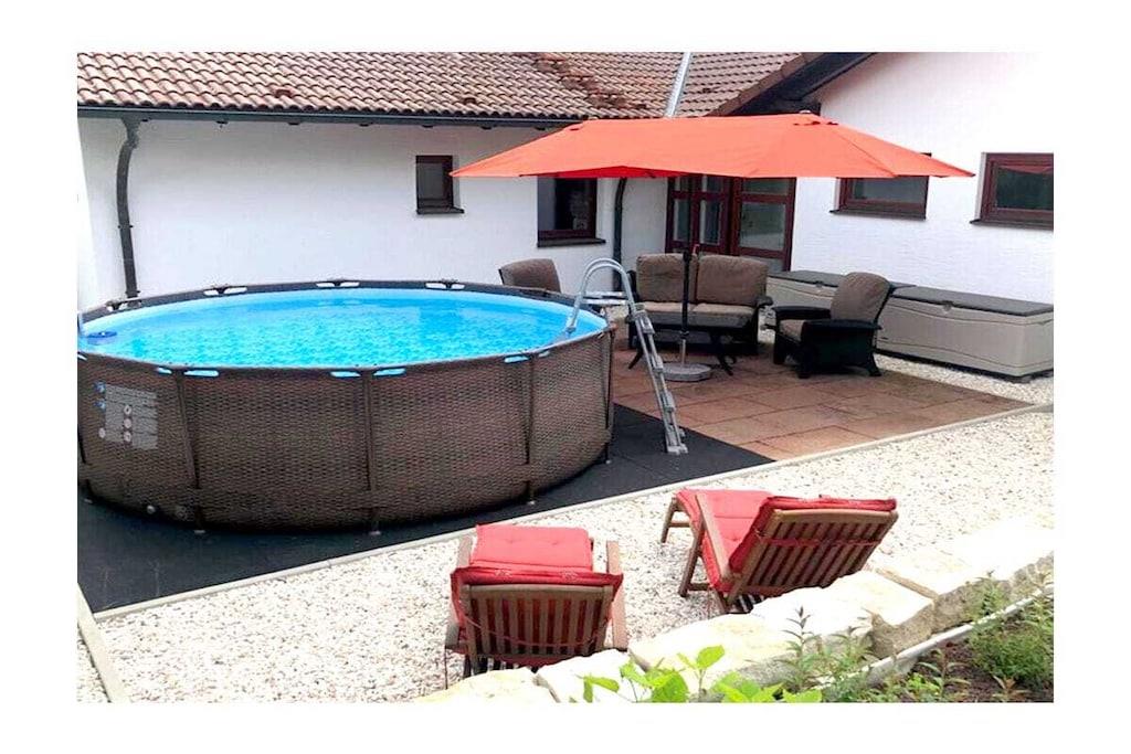Stueetage: (entre, Køkken(kakkelovn, kogeplade, elkedel, brødrister, kaffemaskine, ovn, opvaskemaskine , køleskab, fryser, varme, ), stue / spisestue(enkeltsovesofa, Fjernsyn, spisebord, varme), soveværelse(dobbeltseng, Fjernsyn), soveværelse(dobbeltseng, Fjernsyn), badeværelse(badekar, bruser, håndvask, bidet, vaskemaskine, varme, føntørrer, Håndklæder inkl.), toilet(håndvask, toilet, varme, Håndklæder inkl.)) terrasse, terrasse, havemøbler, solstole, grill, Parasol, swimmingpool
