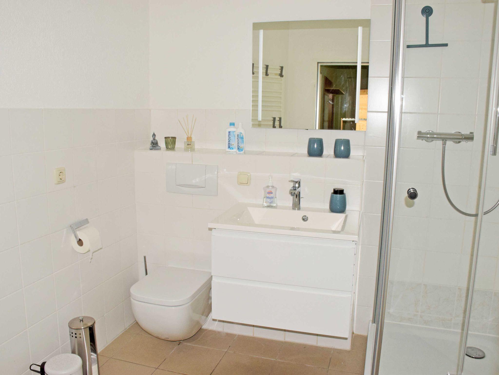 Das große Bad ist mit ebenerdiger Dusche, Waschtisch und WC ausgestattet. Ebenfalls vom Flur aus erreichen Sie die hell und modern eingerichtete Küche mit kleinem Esstisch und einer Küchenzeile mit Cerankochfeldherd-Backofen,Spülmaschine, Kühl- und Gefrierschrank und Mikrowelle. Wasserkocher, Toaster und Kaffeemaschine gehören selbstverständlich ebenfalls zur Ausstattung.