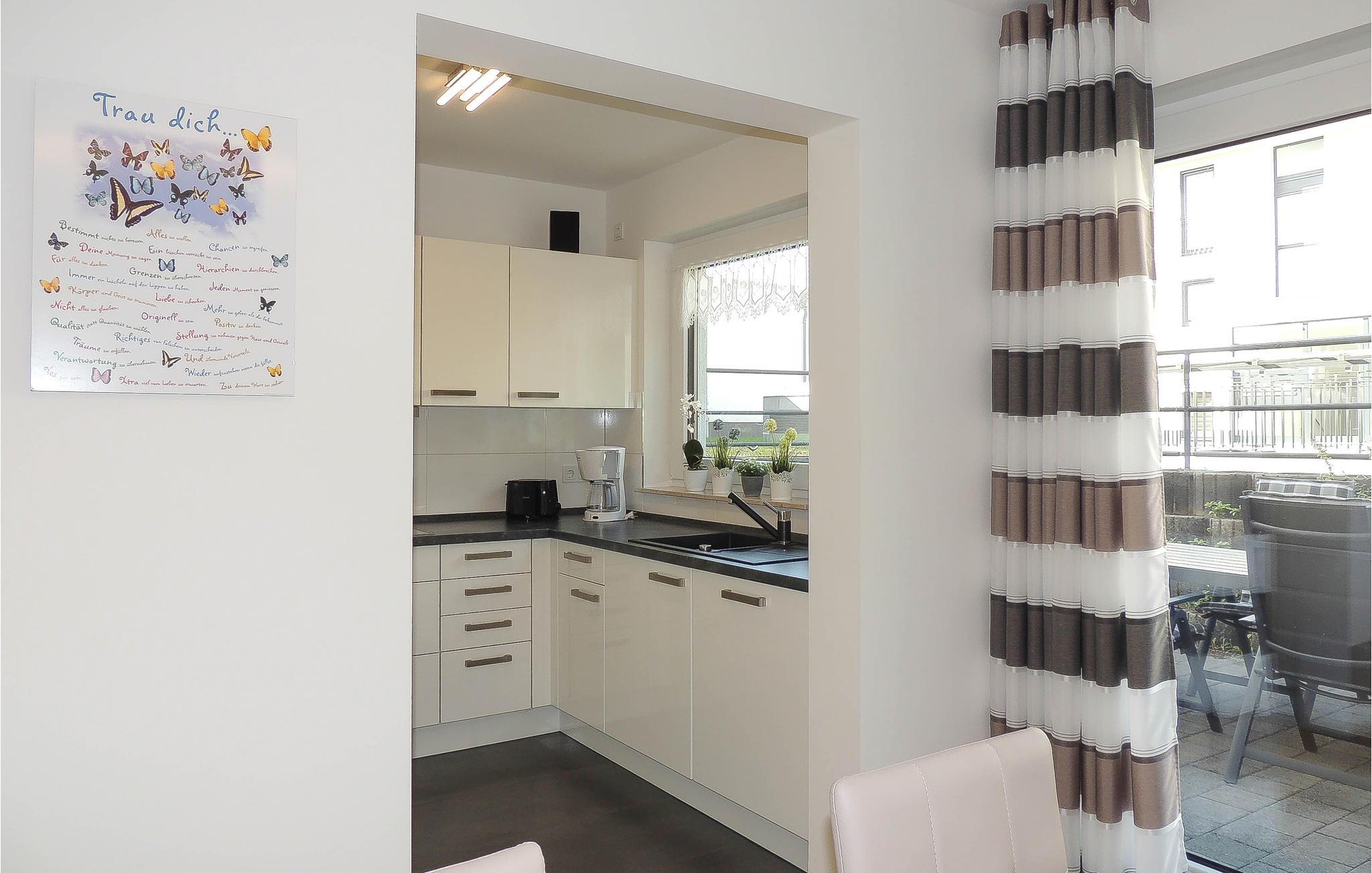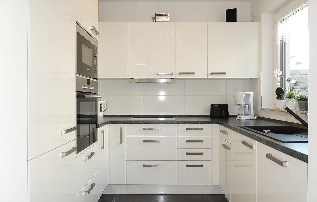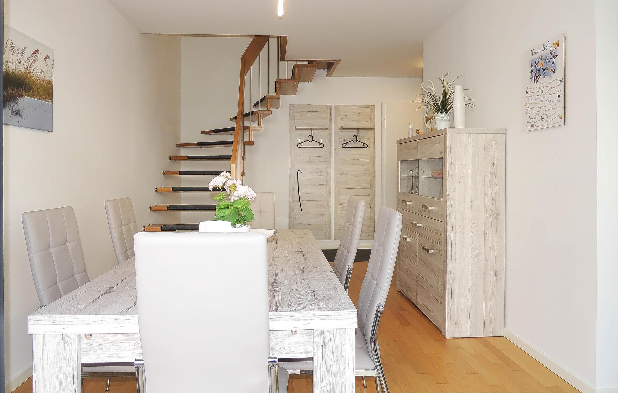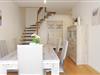 Det moderne køkken er udstyret med alle bekvemmeligheder. Fra spisestuen fører en trappe op til øverste etage, hvor de to soveværelser (med mørklægnings-rullegardiner) og badeværelset ligger.