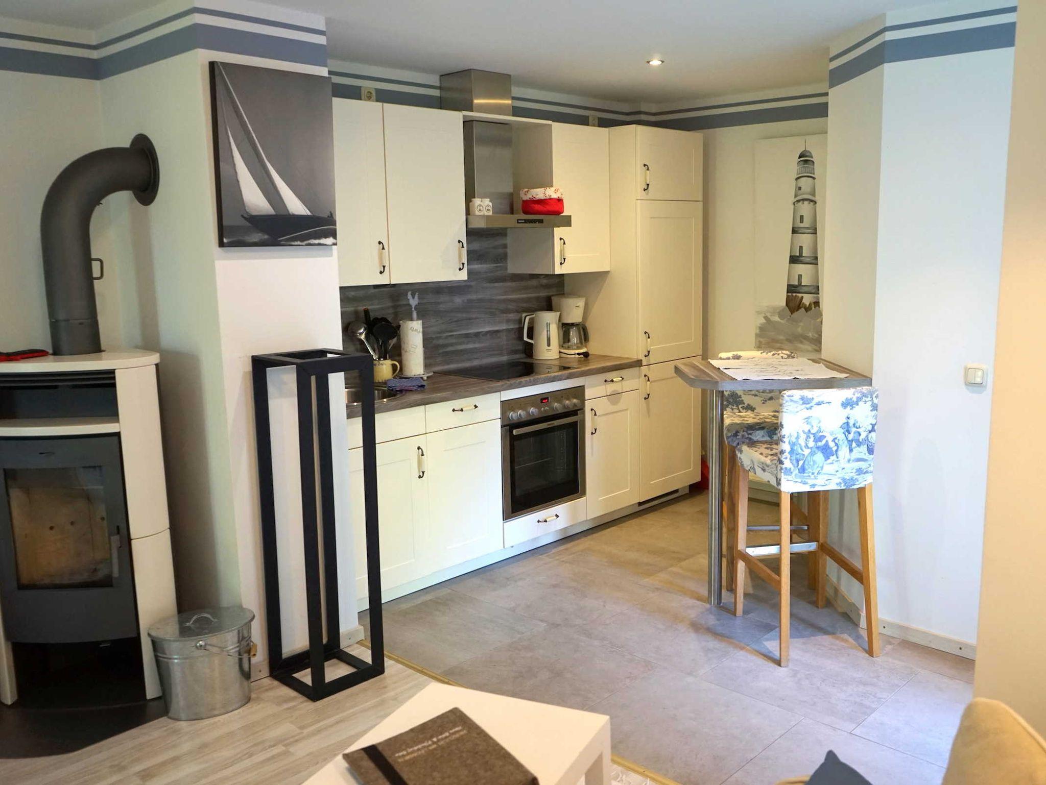 • Küche mit Kaffeemaschine, Toaster, Wasserkocher, Geschirrspüler, E-Herd und Kühlschrank