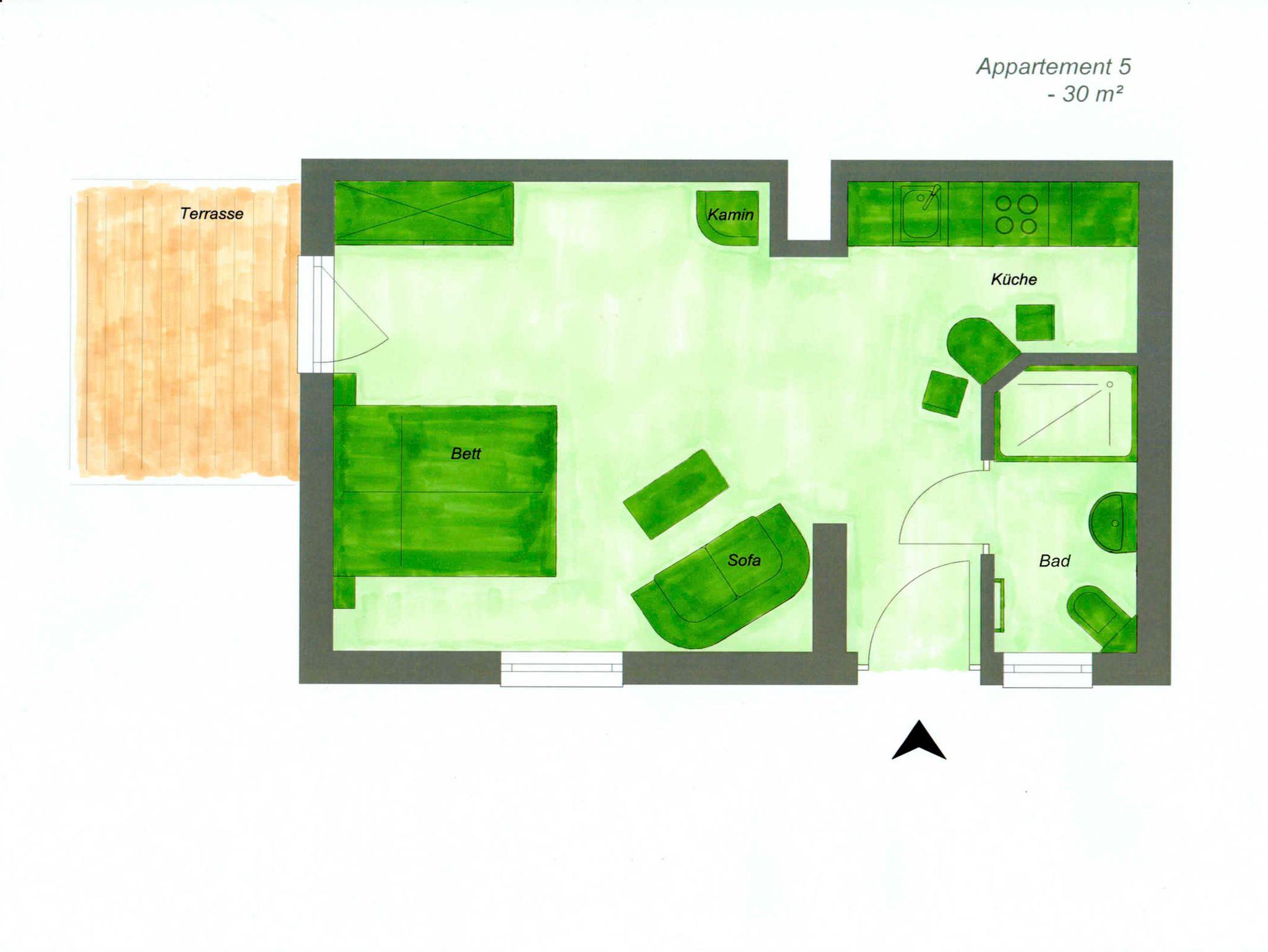 Das Appartement Nr. 5 mit ca. 30 m² hat die folgende Ausstattung: