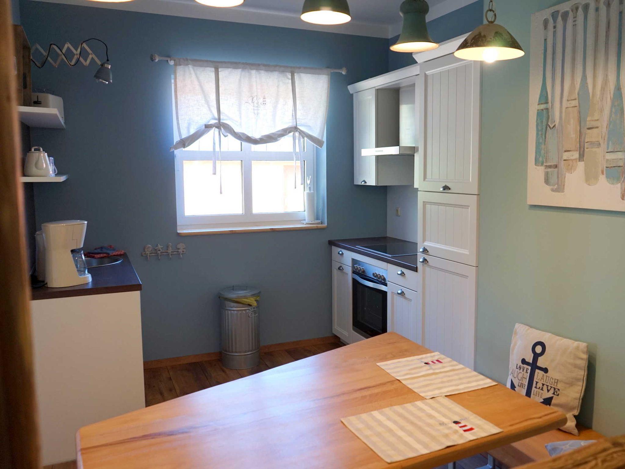 • Küche mit Kaffeemaschine, Toaster, Geschirrspüler, E-Herd, Kühlschrank