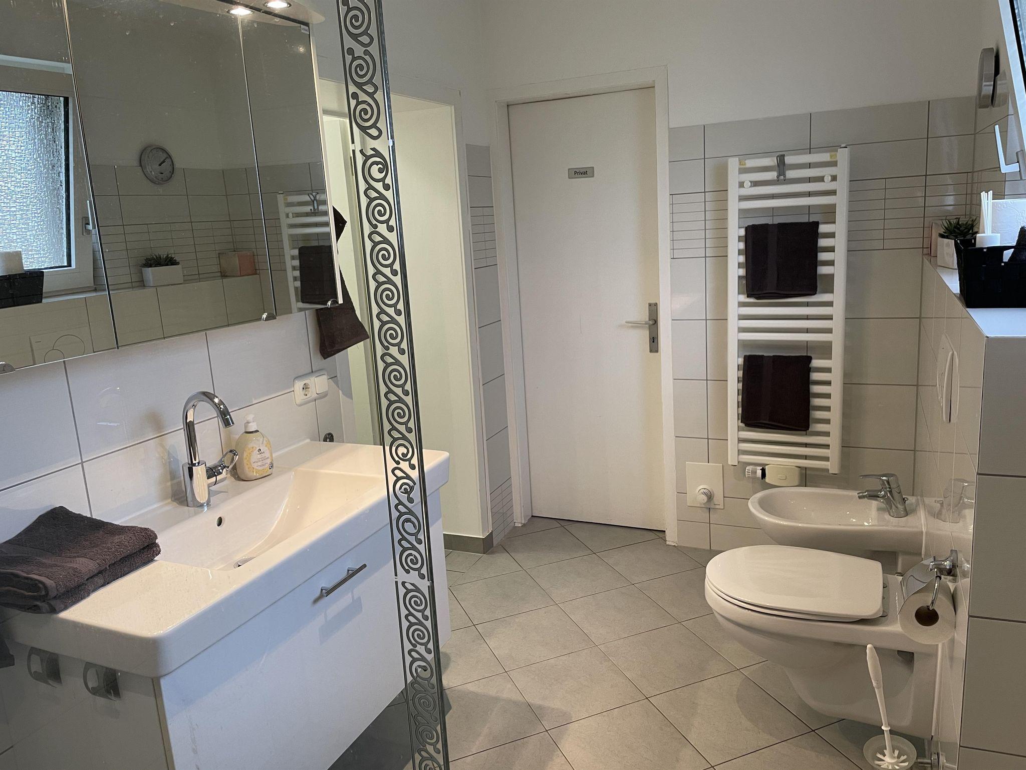 Vom Essbereich aus führt ein separater Flur in das frisch sanierte Badezimmer mit einer ebenerdigen Dusche, einem WC, einem Bidet und einem großen Waschbecken. Dank des Fensters im Badezimmer ist immer ausreichend frische Luft vorhanden.