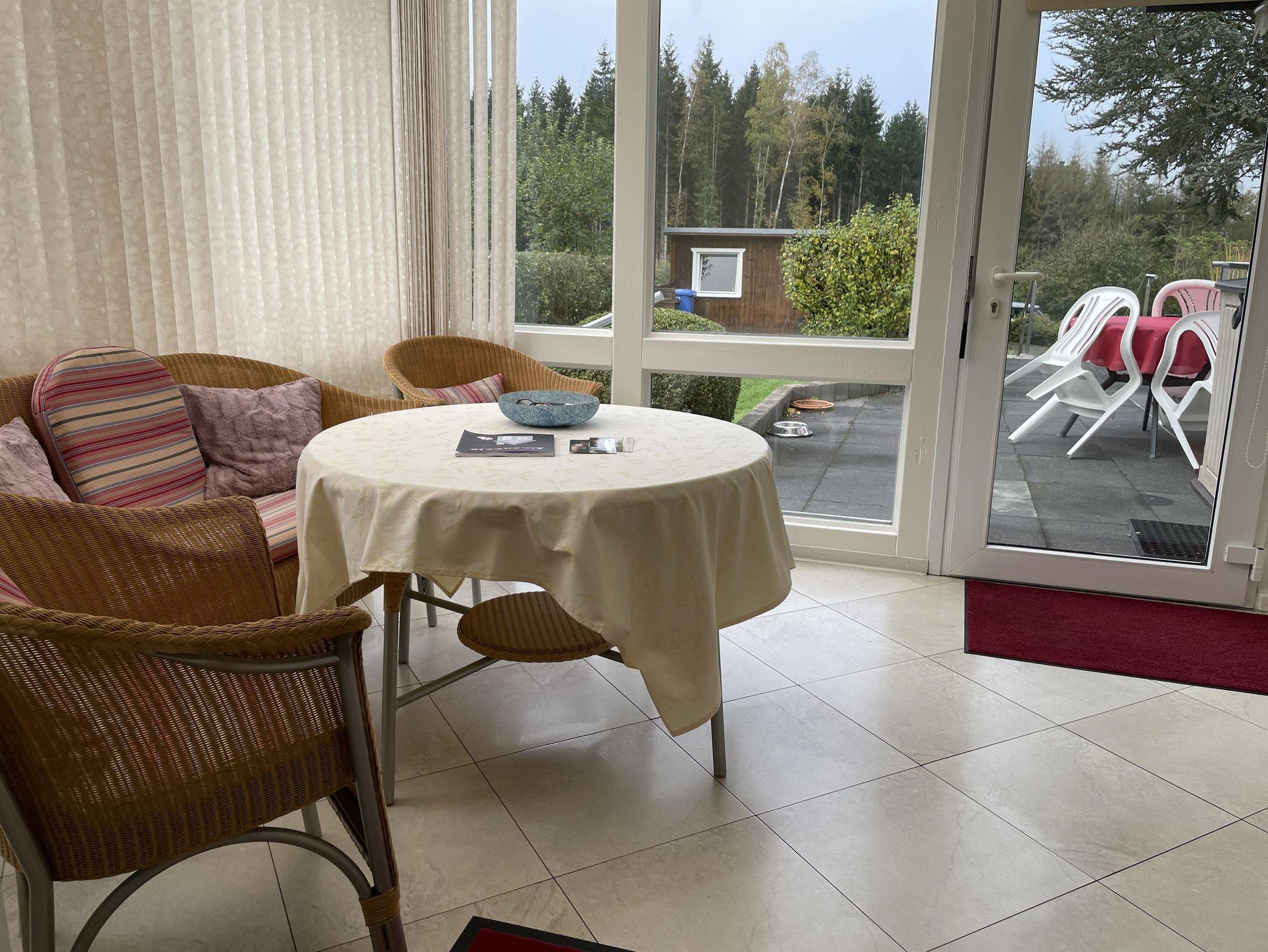 Das Wohnzimmer hinter dem Wintergarten ist mit einer einladenden roten Ledercouch ausgestattet und bietet den idealen Ort für Fernsehabende oder Spieleabende mit der Familie. Von hier aus genießen Sie einen wunderschönen Blick auf den Garten, den Grillplatz und den majestätischen Bismarckturm. Jedes Detail in unserem Ferienhaus wurde mit Liebe gestaltet, um eine perfekte Wohlfühlatmosphäre zu schaffen.