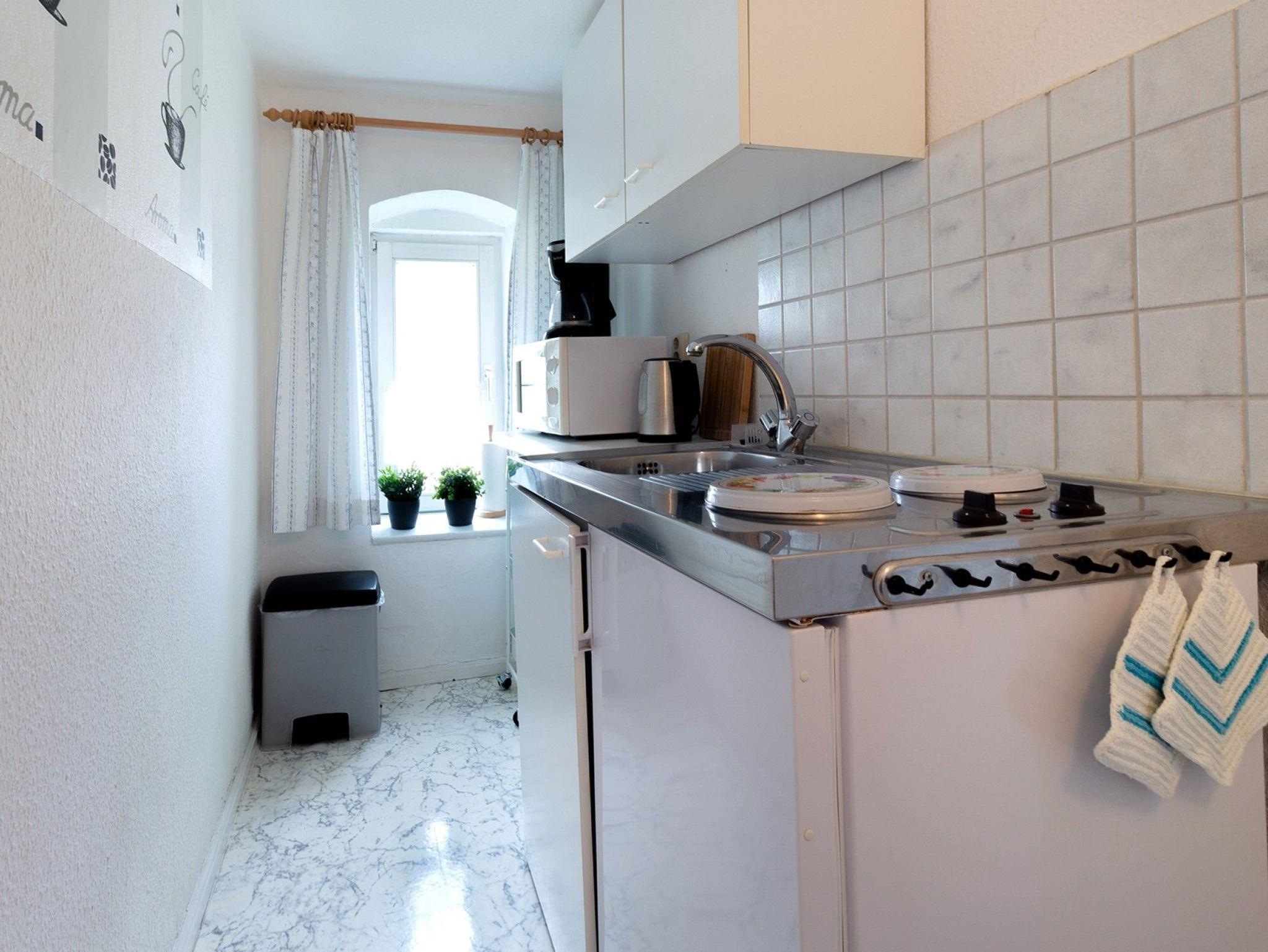 • kleine separate Küche mit 2-E-Platten, Kühlschrank und Mikrowelle