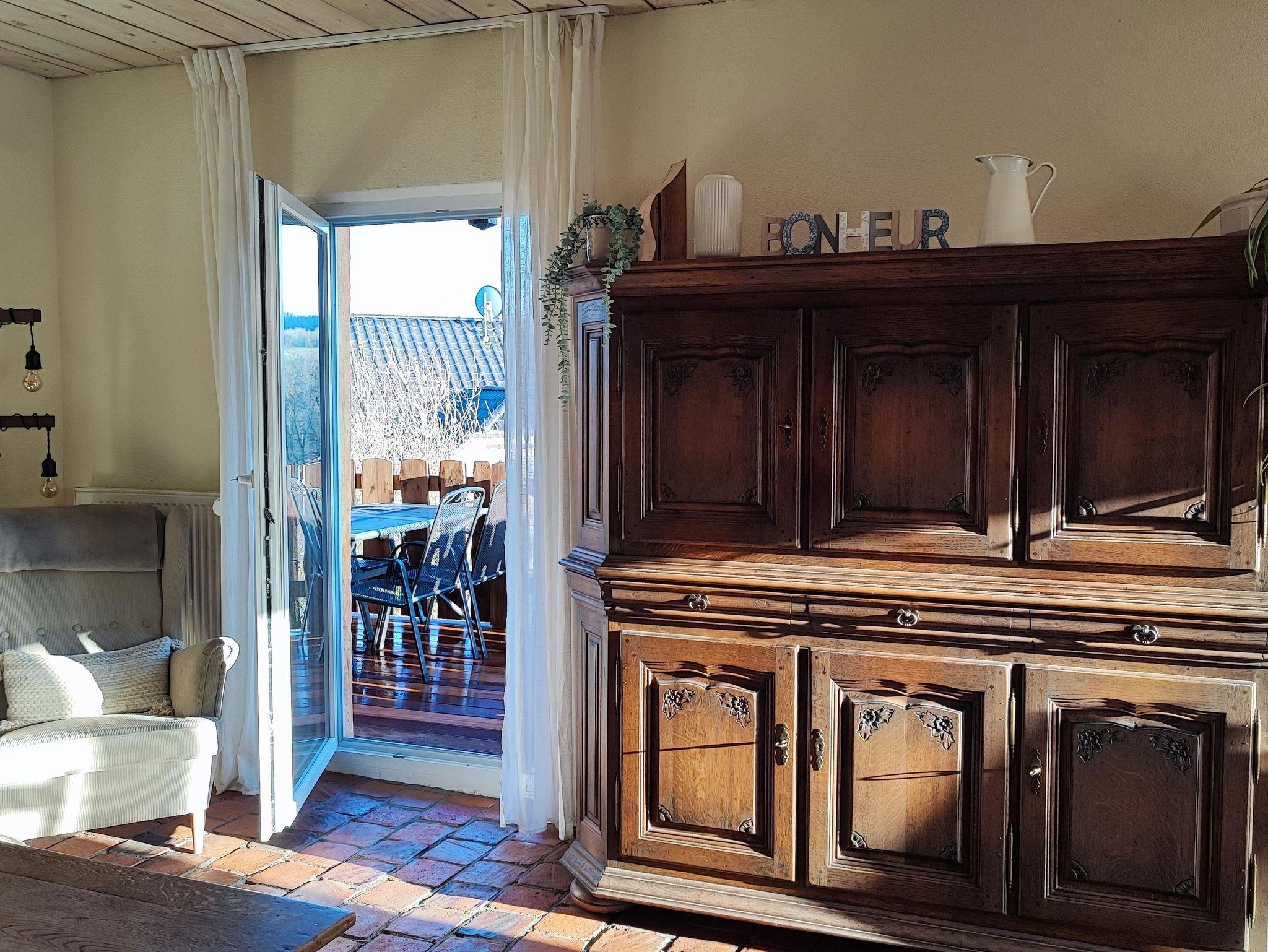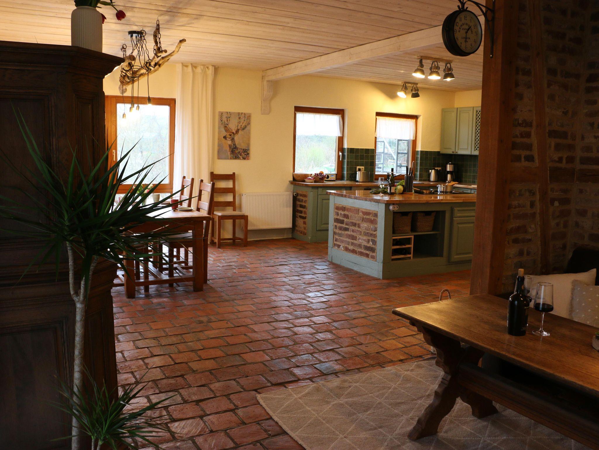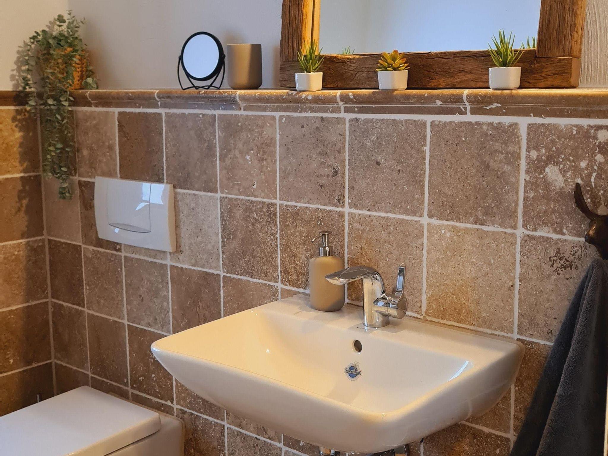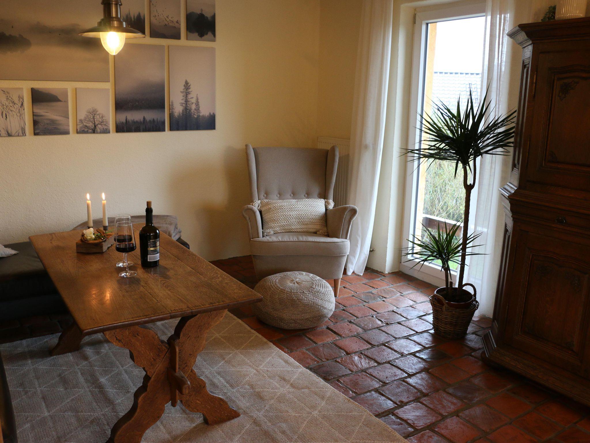Im Jahr 1999 bauten wir diesen Gebäudeteil zu einer Mietwohnung aus. Zwischen dem Obergeschoss und dem Dachgeschoss wurde eine Zwischendecke eingezogen und es wurde ein komplett neues Dach aufgesetzt. 2021 begannen wir dann, diese Wohnung vollständig zu renovieren und zu einer neuen Ferienwohnung umzubauen. Auch hierbei legten wir wieder großen Wert auf natürliche Baustoffe sowie auch auf die Wiederverwertung alter Baustoffe: Sämtliche Wände wurden mit Lehmputz neu verputzt, der große Wohn-, Ess- und Küchenbereich wurde mit jahrhundertealten Tonfliesen neu gefliest, im Flur wurden ausgebaute Zementfliesen aus einem alten Westerwälder Fachwerkhaus neu verlegt und im Wohnzimmer wurde eine Fachwerkwand als Raumteiler bestehend aus alten Balken aus unserem Scheunenabriss sowie alten Ziegelsteinen aus einem Hausabriss erstellt. Auf die Nachhaltigkeit legten wir auch bei der Küche großen Wert, denn auch hier haben wir eine ältere Einbauküche mit massiven Eichenfronten wieder zu neuem Leben erweckt: Eingerahmt in Balken aus unserem Scheunenabriss, zum Teil mit den alten Ziegeln ausgemauert und vollständig mit Kreidefarbe versehen sieht sie aus wie neu. Des Weiteren kamen bei der Wohnungsrenovierung Antikmarmor- bzw. Travertinmarmorfliesen in verschiedenen Farben und Größen zum Einsatz (Schlafzimmer und Bad).