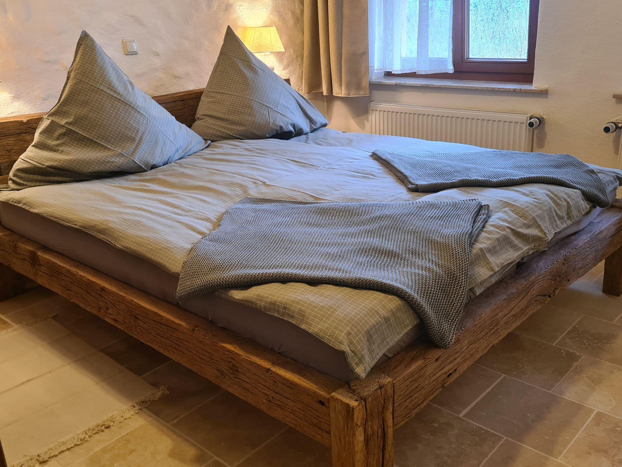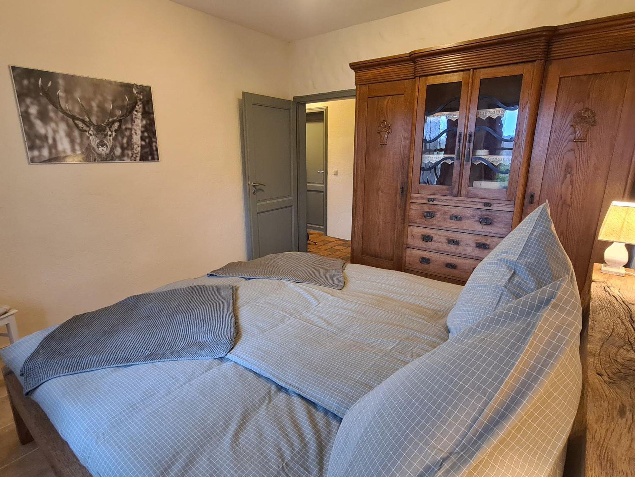 Der Heuboden verfügt über 2 Schlafzimmer. In dem etwas größeren Schlafzimmer befindet sich ein 180 x 2 m großes Doppelbett aus Eichenholz, welches aus dem Rückbau eines alten Bootsstegs wiederverwendet wurde. In dem antiken, handgefertigten großen Eichenschrank finden Sie auf jeden Fall Platz genug zur Unterbringung Ihrer Kleidungsstücke.