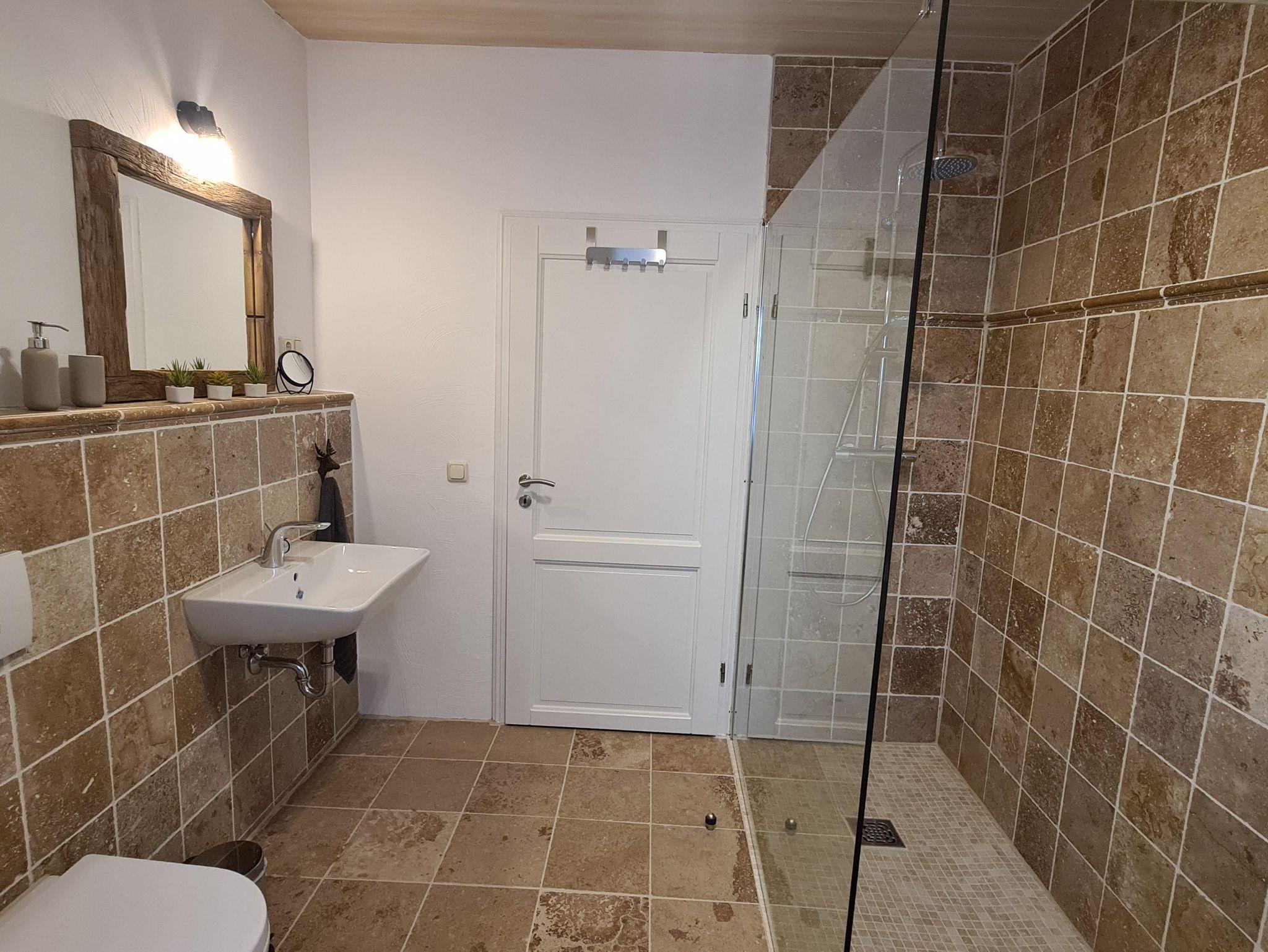 Vervollständigt wird der Heuboden durch das mit Antikmarmor in warmen Farben geflieste Badezimmer, welches u.a. über eine große, bodentiefe Dusche verfügt.