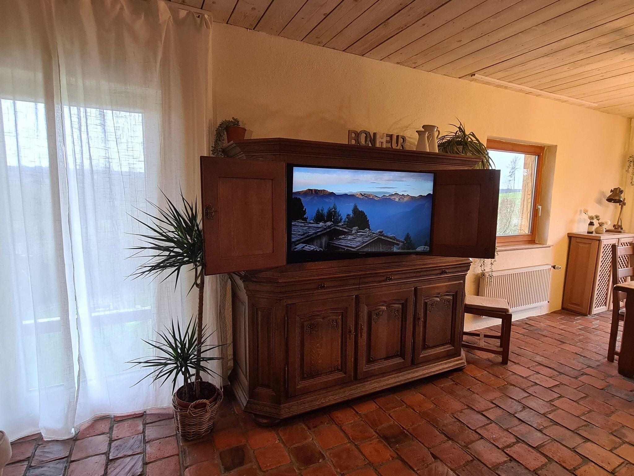 In dem an den Essbereich ebenfalls offen angrenzenden Wohnzimmer können Sie es sich auf der Ledercouch oder aber auf dem Sessel bequem machen. Von dort aus können Sie gemütlich fernsehen, den 107 cm großen Fernseher haben wir in dem großen Eichenschrank „versteckt“.
