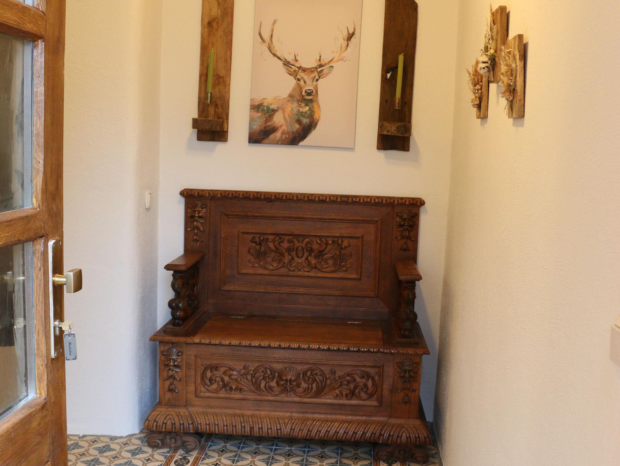 Der Heuboden empfängt Sie mit einem kleinen (aber feinen) Flur, dessen Boden mit historischen Zementfliesen aus einem alten Fachwerkhaus von der Westerwälder Seenplatte gefliest ist. Auf der antiken Truhenbank können Sie Platz nehmen, um sich z.B. bequem die Schuhe anzuziehen. Eine kleine Garderobe vervollständigt den Flur.