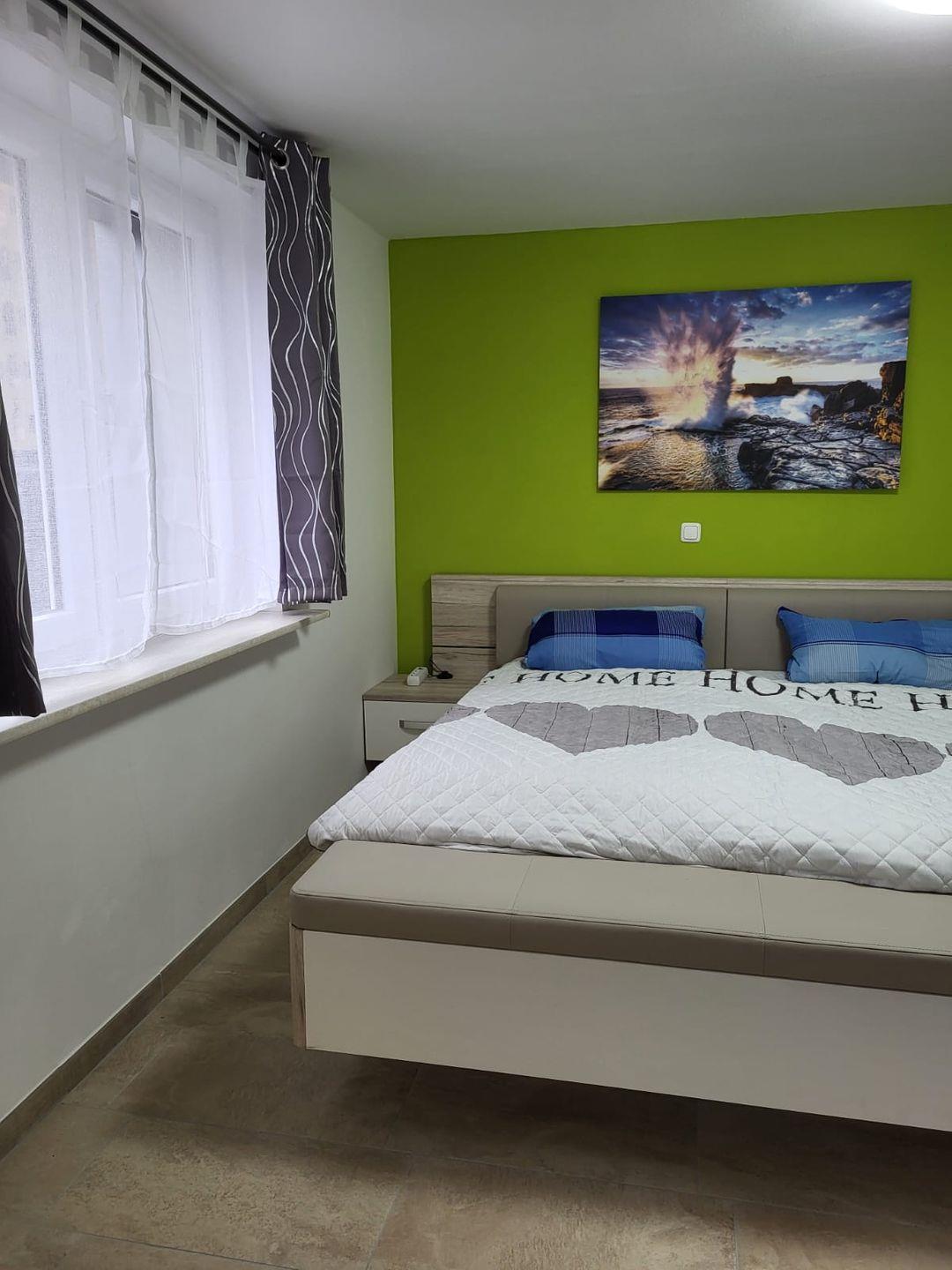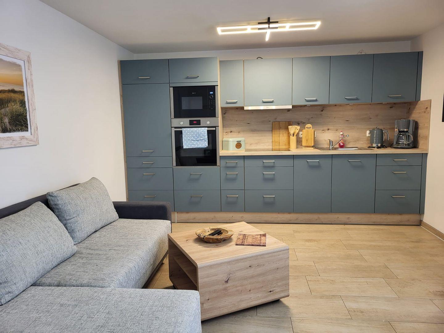 Die Ferienwohnung hat eine Wohnfläche von 42qm. Es gibt ein Schlafzimmer mit Doppelbett und großem Kleiderschrank. Die Ferienwohnung verfügt über 1 Bad mit Dusche und WC. Die Küche ist offen gestaltet und in den Wohnbereich integriert, verfügt über einen Essbereich mit Fernseher und ist ausgestattet mit einem Induktionsherd, Kühlschrank mit Gefrierfach, Geschirrspüler, Mikrowelle, Kaffeemaschine, Toaster, Wasserkocher.