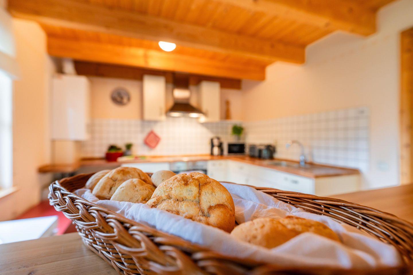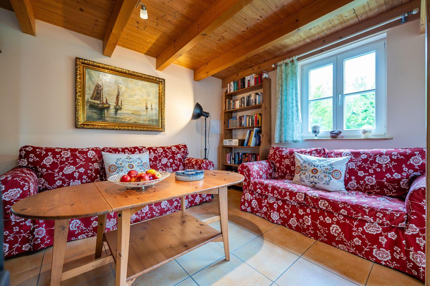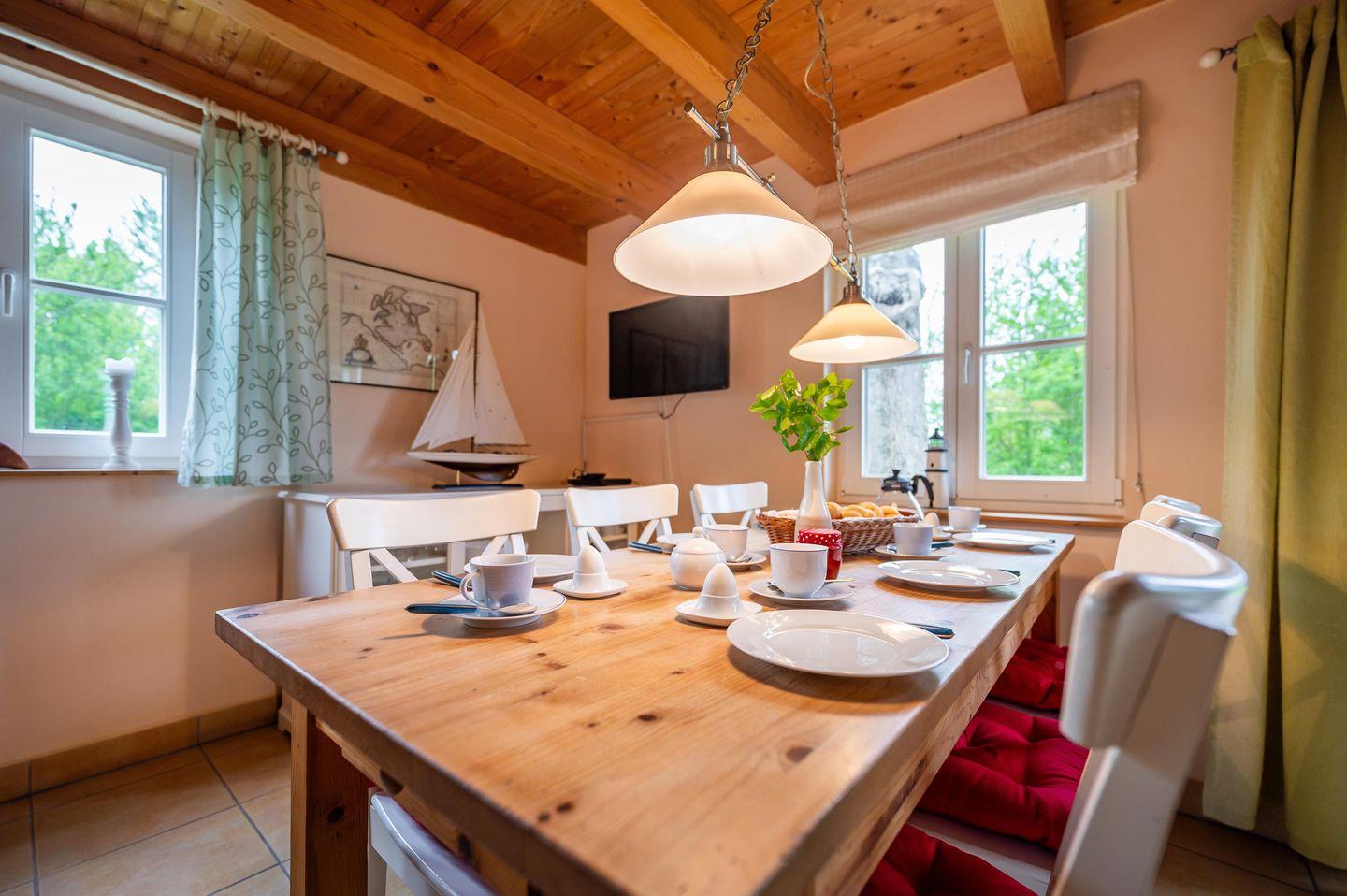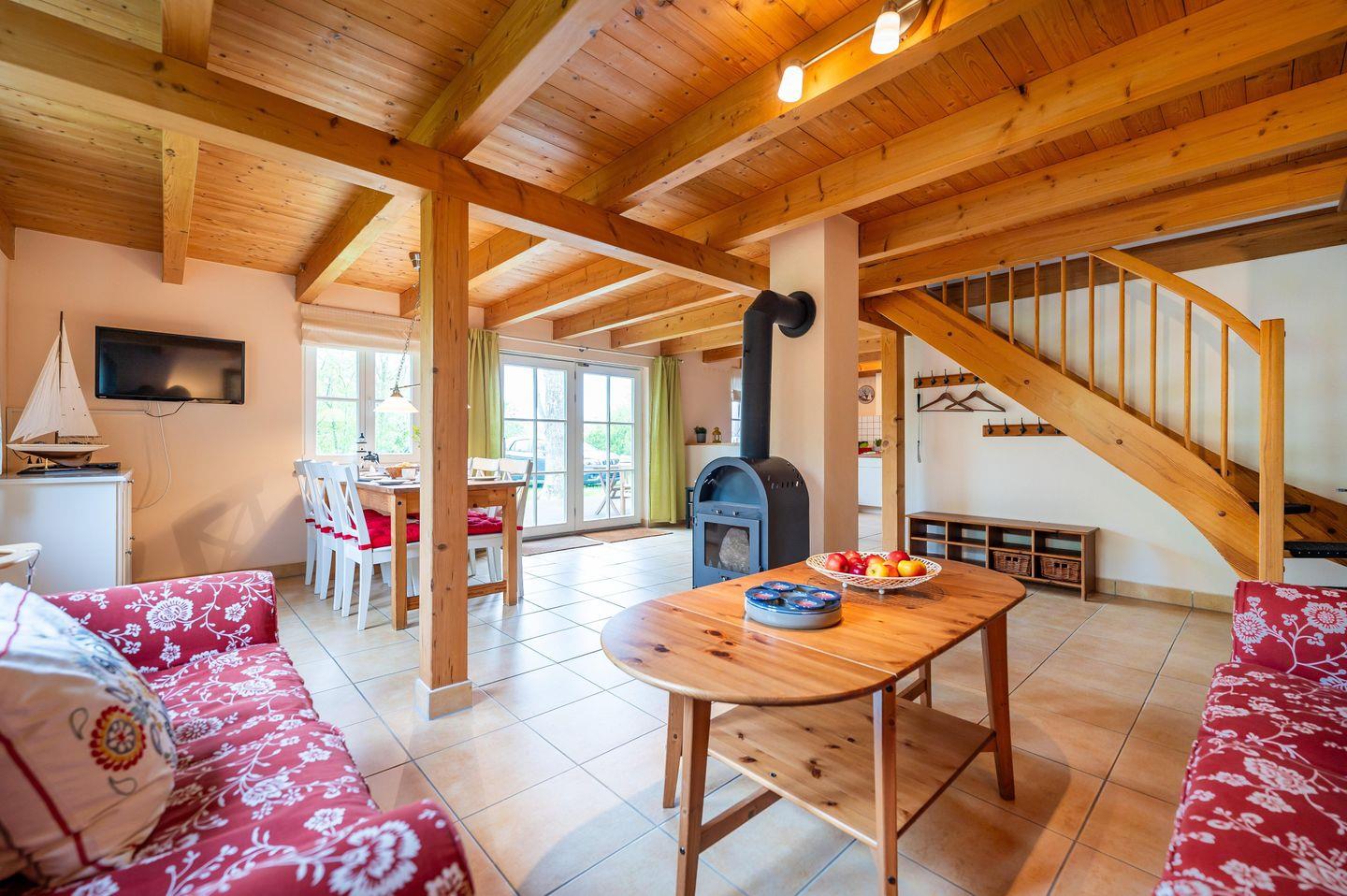Mit seinen offenliegenden Deckenbalken, der Sofaecke und einem großen Esstisch ist das Schwedenhaus auch im Winter oder an einem Regentag ein gemütlicher Rückzugsort.