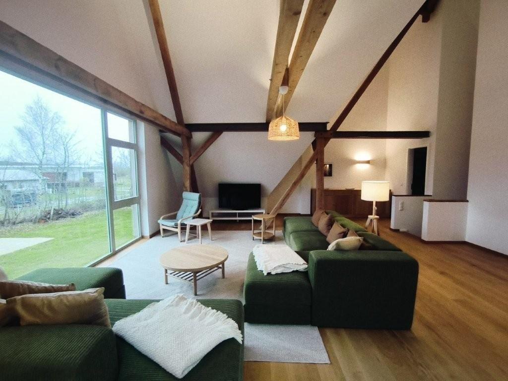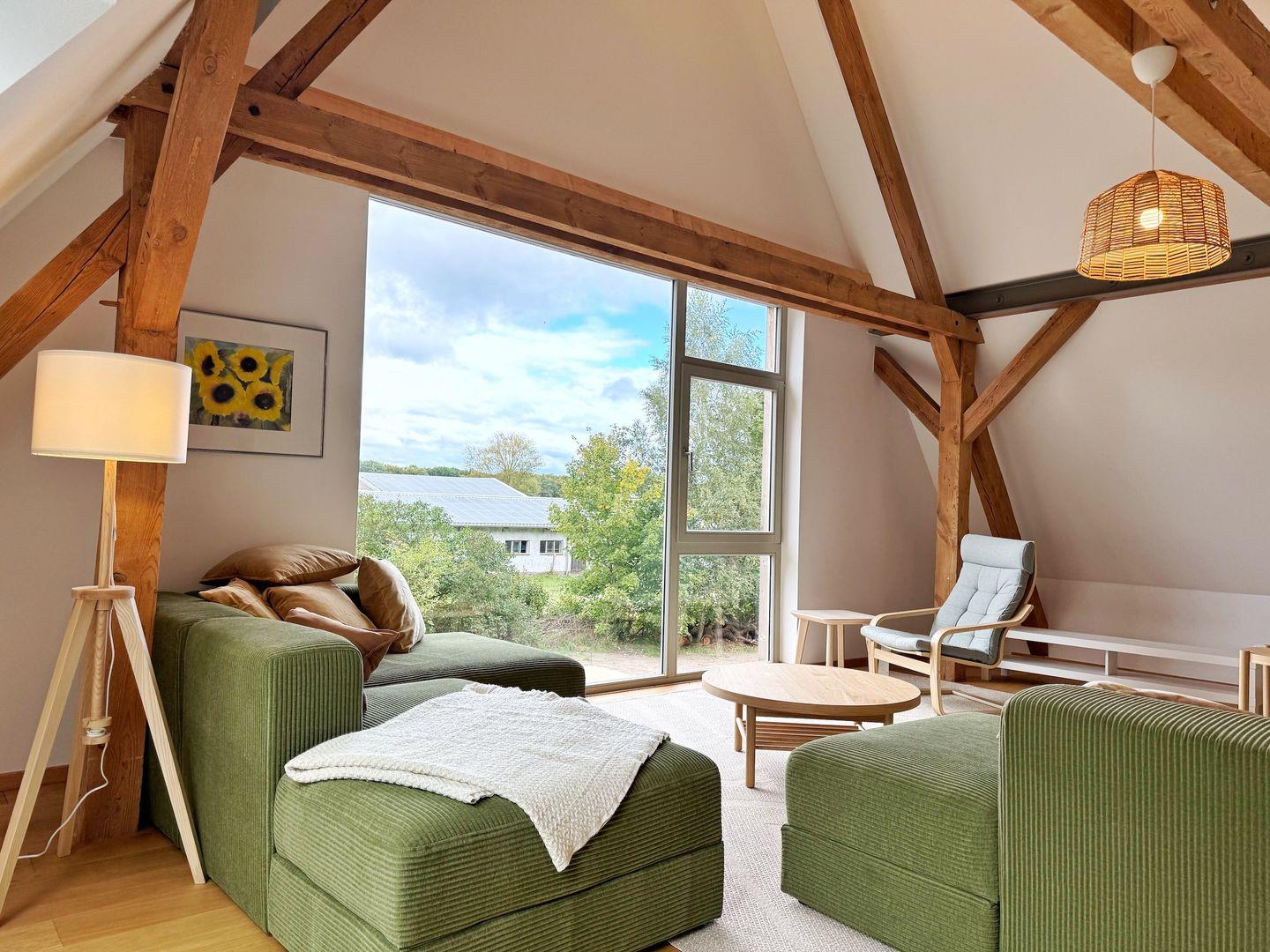 Das Wohnzimmer befindet sich im Obergeschoss und ist großzügig gestaltet mit freiliegenden Balken und bodentiefen Fenstern. Es gibt eine gemütliche Sofalandschaft und Sessel vor dem Flat-TV.