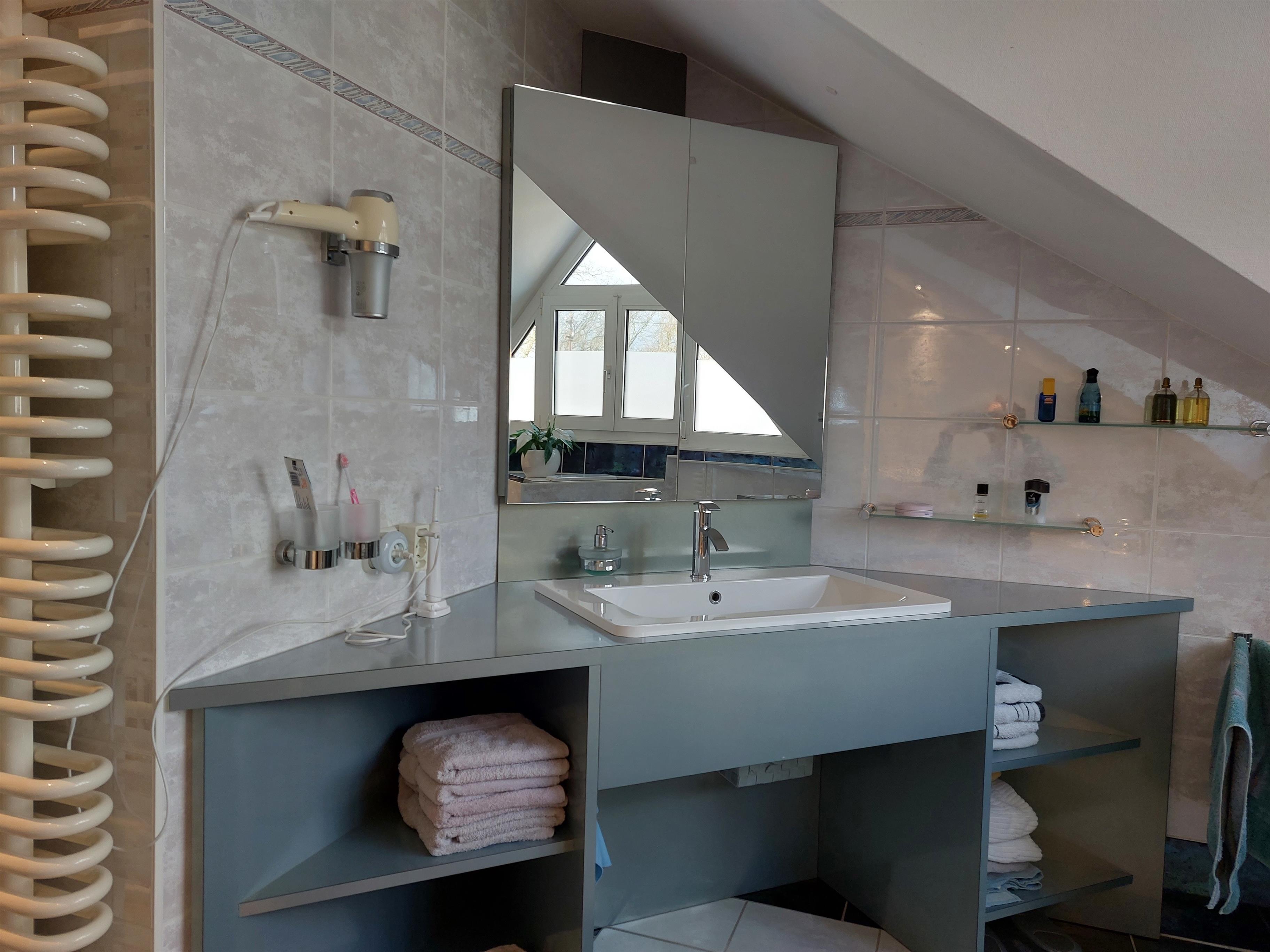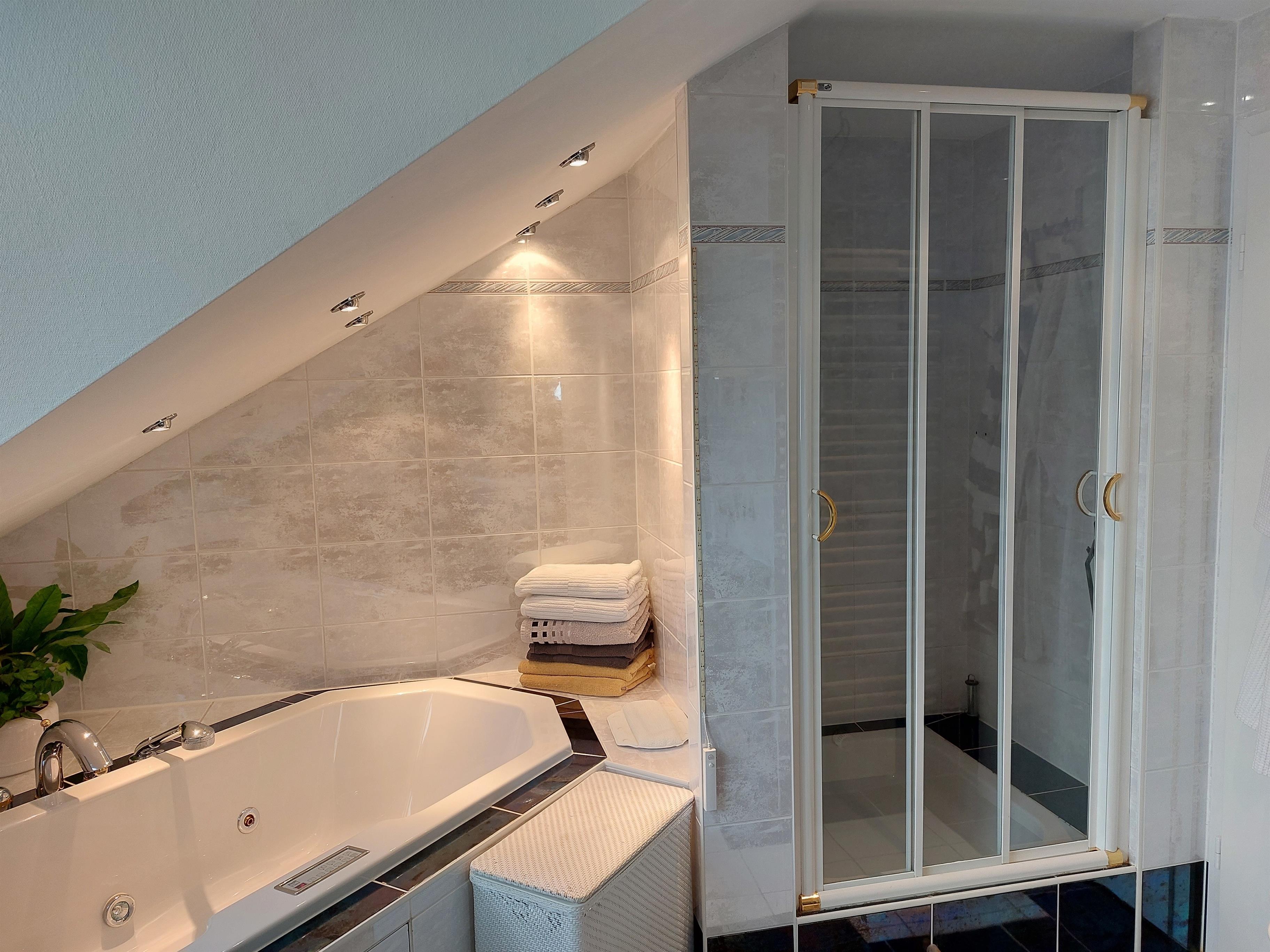Das Badezimmer ist topmodern ausgestattet mit Dusche, Badewanne (Whirlpool) und WC. Eine separate Toilette steht ebenso zur Verfügung.