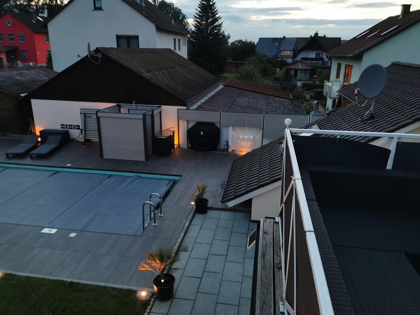 Insgesamt stehen Ihnen 123 m² Wohnfläche mit zur Verfügung, dazu 20 m² Sonnenterrasse sowie ein Balkon mit ca. 8 qm und der gesamte Garten und Poolbereich hinter dem Haus in den reservierten Zeiten zur Mitbenutzung.