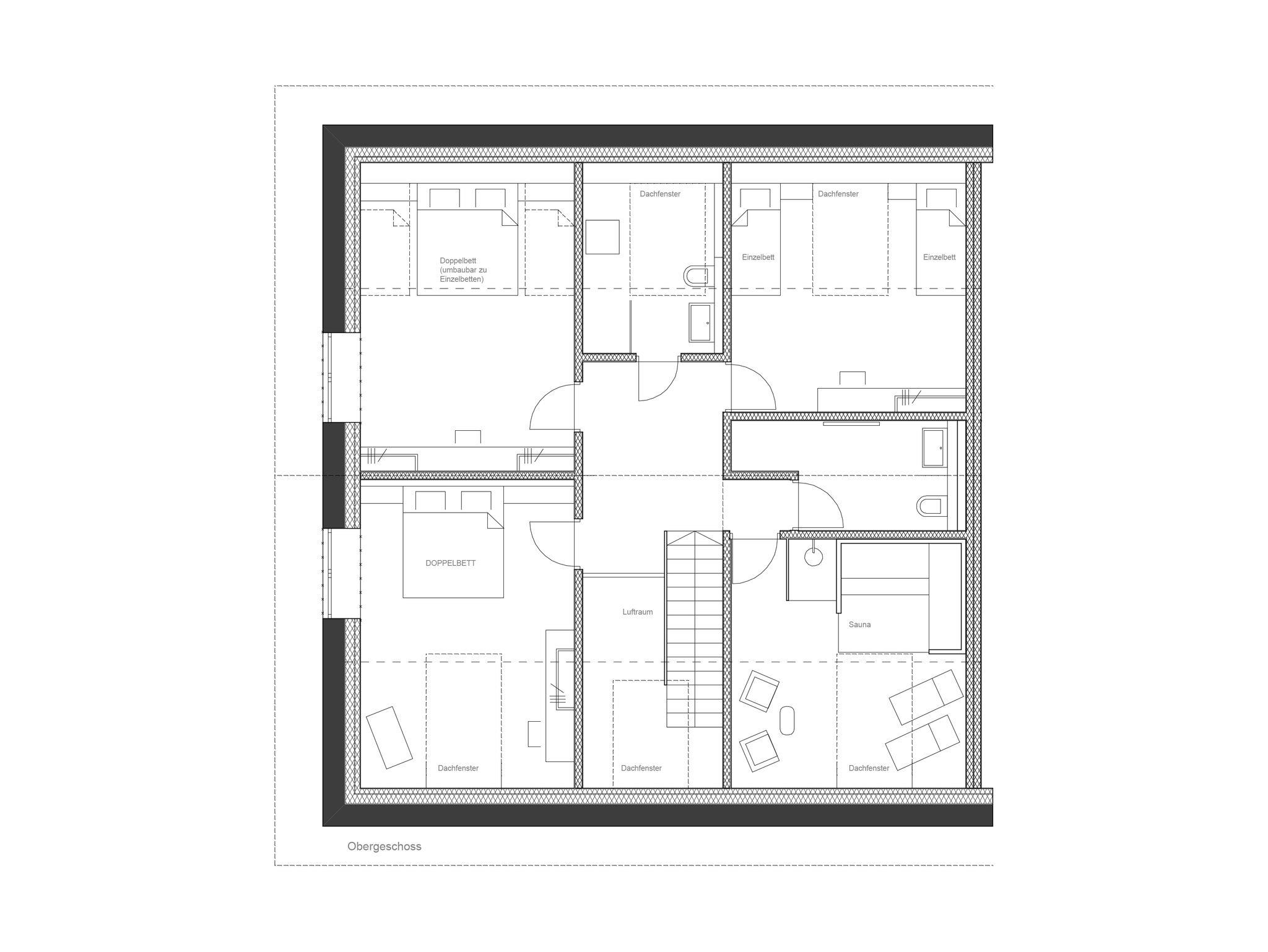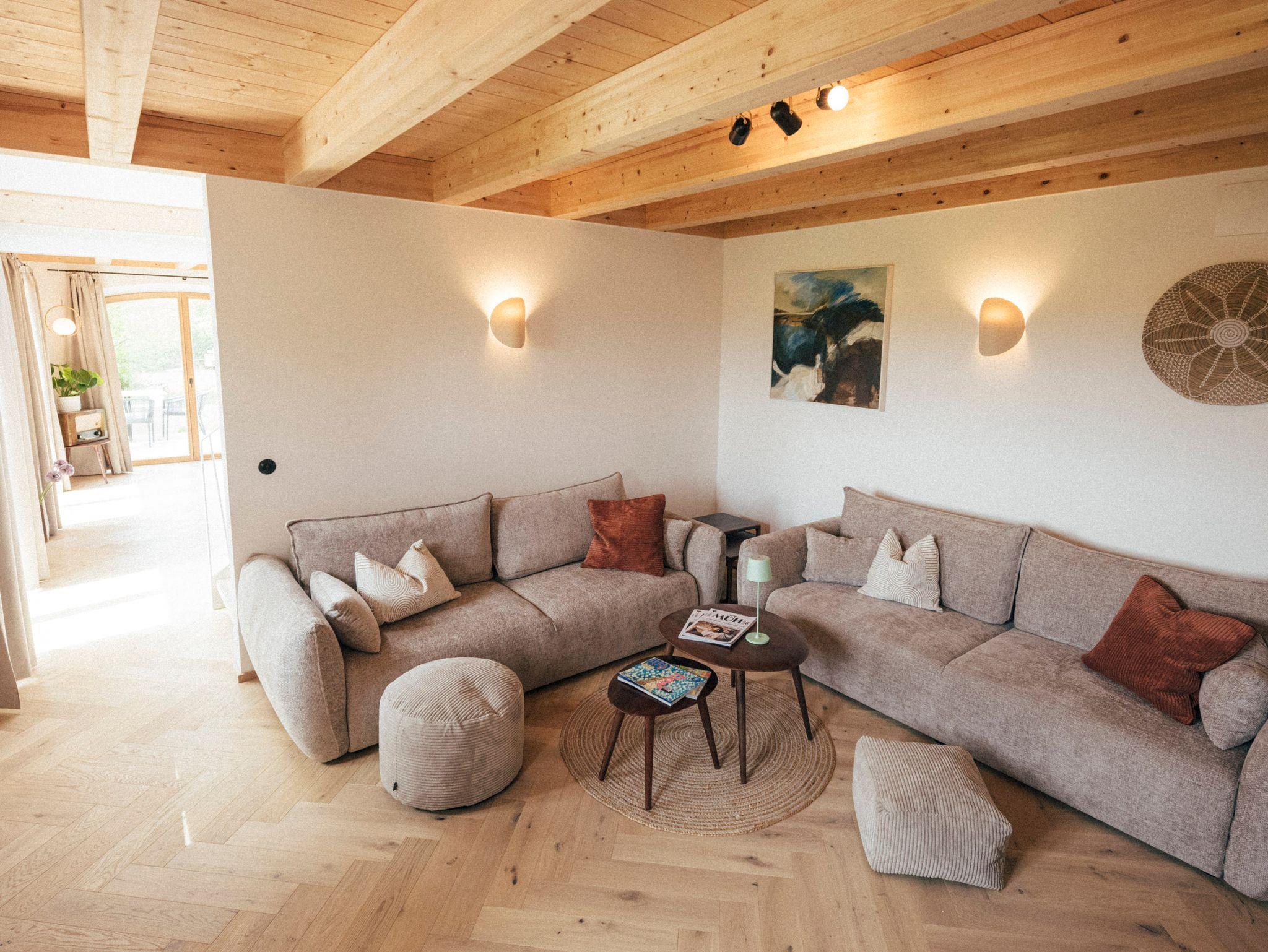 Zwei der Schlafzimmer befinden sich im Erdgeschoss und sind mit einem Doppelbett ausgestattet. Ein Badezimmer befindet sich direkt daneben. Im Erdgeschoß liegt auch die große Wohnküche und der Wohnraum. Im Obergeschoss befinden sich drei Schlafzimmer. Eines davon mit Doppelbett, in einem der Zimmer kann man das Bett als Doppelbett, oder zwei Einzelbetten vorbereiten. Das dritte Zimmer im OG verfügt über zwei Einzelbetten. Zwei der Bäder sind im Obergeschoss, ebenso der Ruheraum mit Panoramasauna.