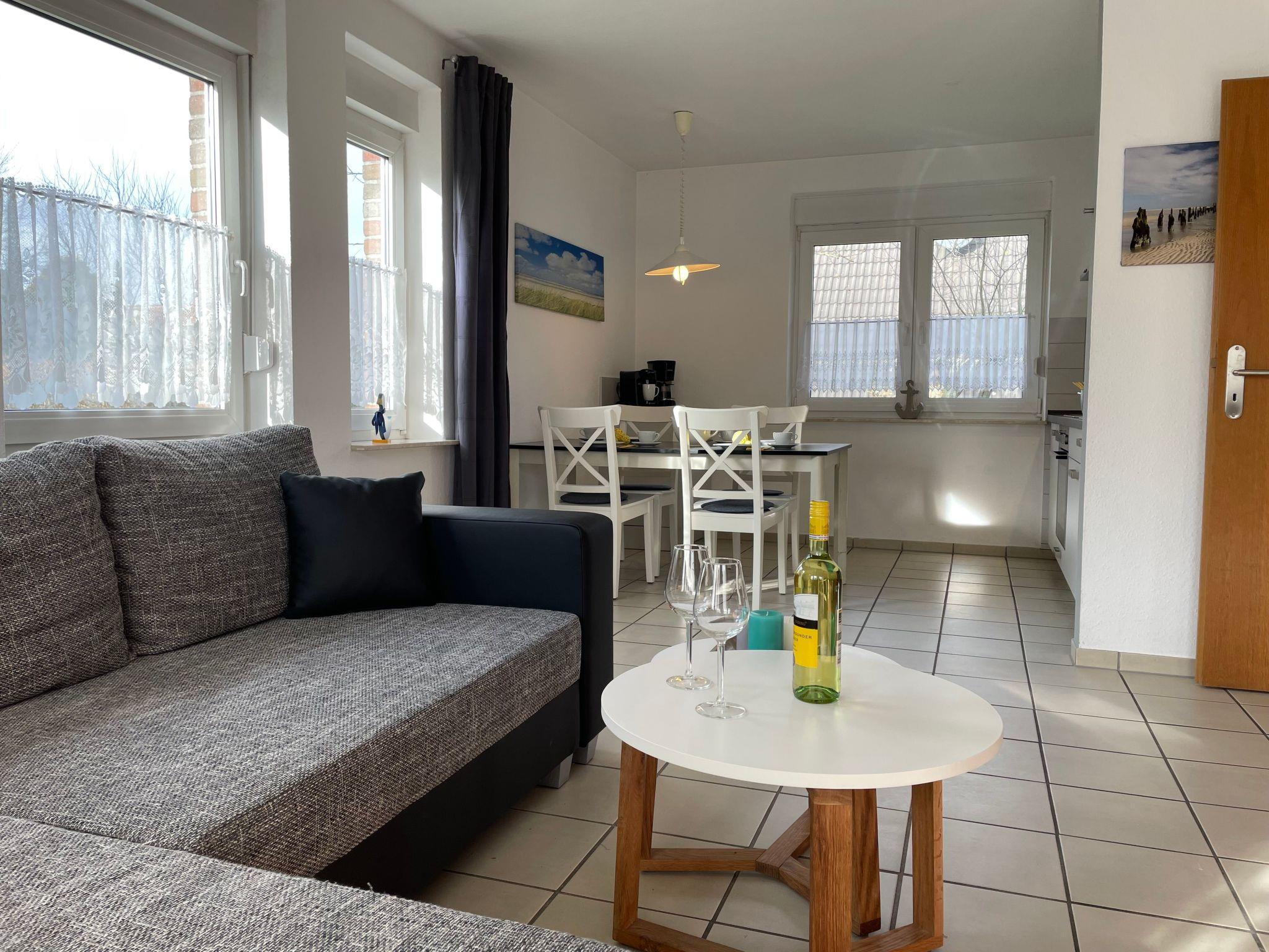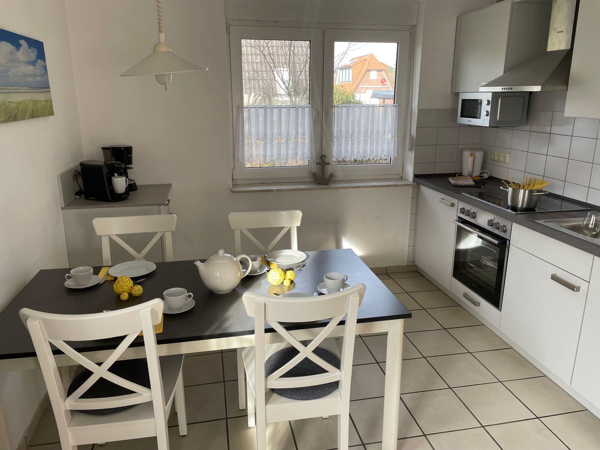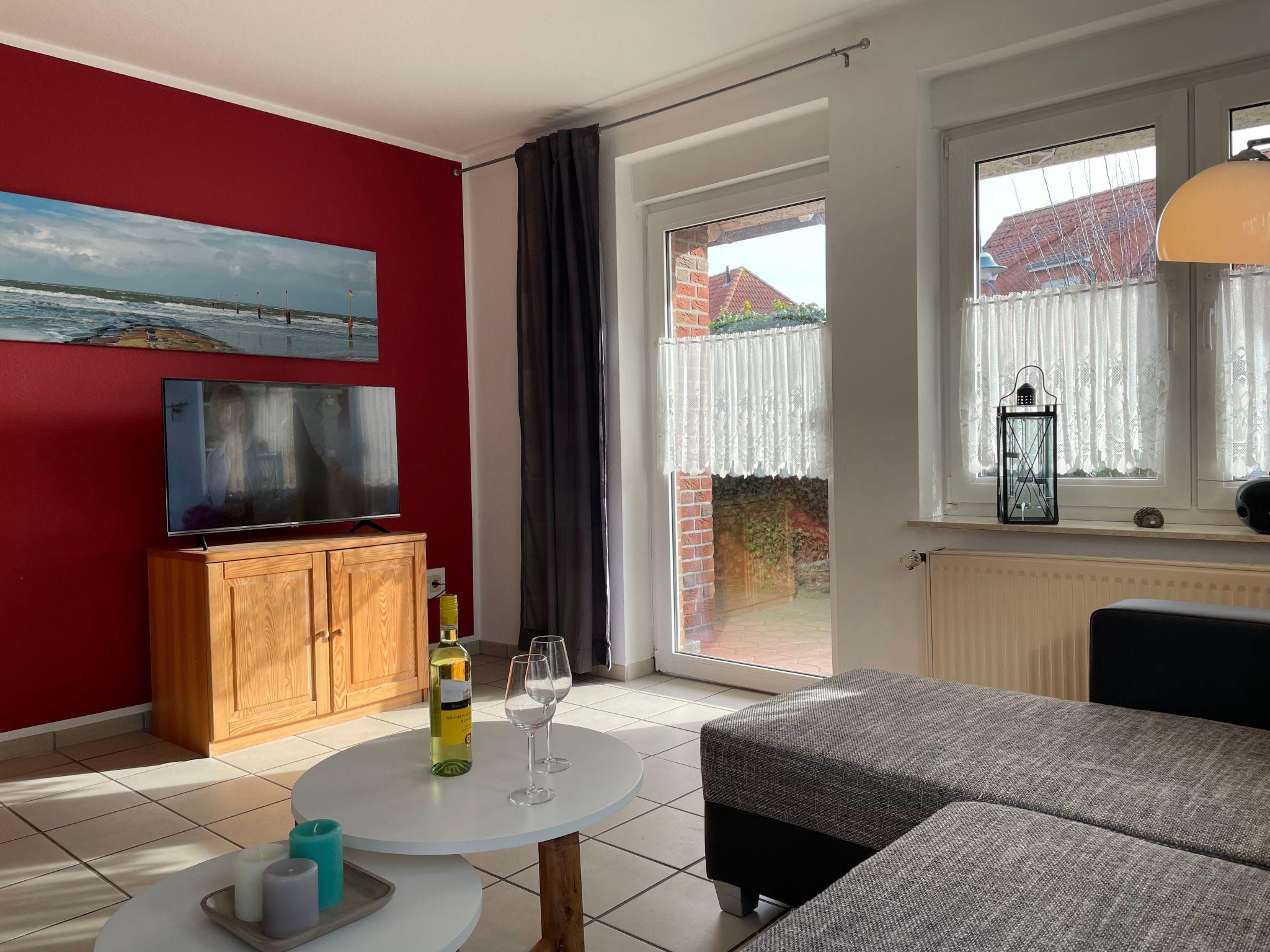 The holiday flat is located on the ground floor of a quiet house with four holiday flats at Kurpromenade 8, a quiet cul-de-sac not far from the maritime marina of Harlesiel. Within walking distance you can reach the beach (distance approx. 400 metres) and the Cliner spring (distance approx. 500 metres) The flat with separate entrance has a light-flooded living room with sofa set and satellite TV, dining area and modern, fully equipped kitchen (with dishwasher and microwave). A highlight of the flat is the sunny south-facing terrace with high-quality garden furniture and its own large garden, which also faces south. In addition to the master bedroom with a cosy double bed, the flat also has a small bedroom with a single bed. A brightly furnished shower room rounds off this well-equipped flat. The flat can be used by up to 4 people and a small child and has its own storage room for pushchairs, bicycles etc. Bed linen and towels must be brought by the tenant and WLAN is available to guests free of chargeShort descriptionOther : Non-smoking houseShort description 1Number of kitchens : 1