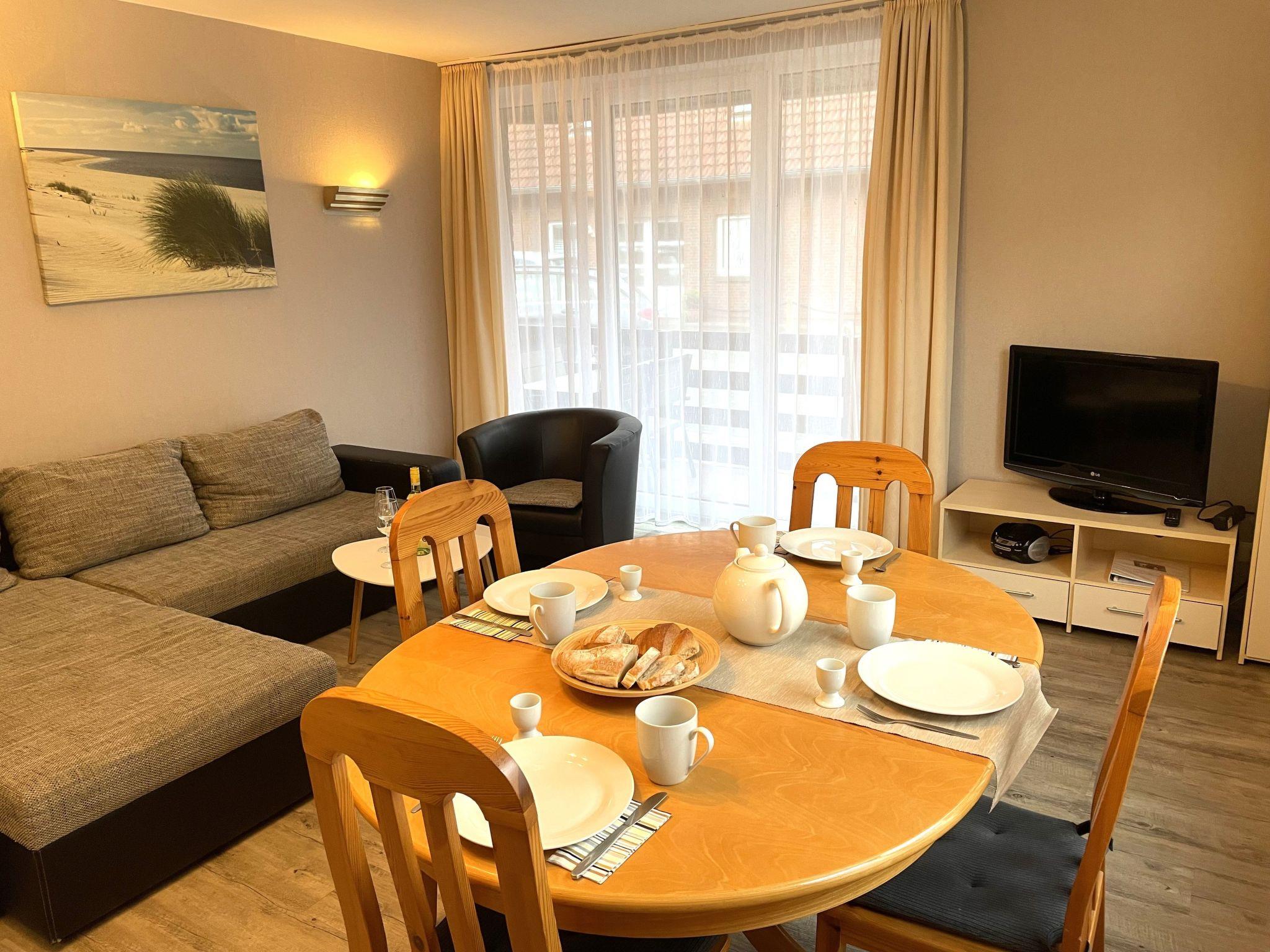Modern, very tastefully and high-quality furnished holiday flat in the best location of the North Sea resort Carolinensiel for up to 4 people with terrace. The flat is in a quiet yet central location in Mühlenblick, close to the 'Cliner Quelle' spa centre, which you can easily reach on foot in just a few steps. The beach, the town centre and the Harle promenade are also within walking distance. The modern and tastefully furnished flat is located on the ground floor of our house "Mühlenblick" and has a bright living room with sofa area and large satellite TV, dining area and well-equipped kitchen (with microwave and dishwasher). The flat also has two bedrooms and a bright and modern bathroom with shower. From the living room you have access to the terrace. A cot and high chair are of course available to our guests. A coin-operated washing machine and a storage room for bicycles, prams etc. are available in the house. There is a car parking space on the property. The flat can be used by up to 4 people and a small child. Brief descriptionOther : Non-smoking houseShort description 1Number of kitchens : 1