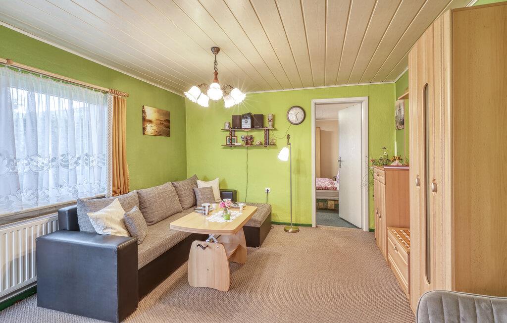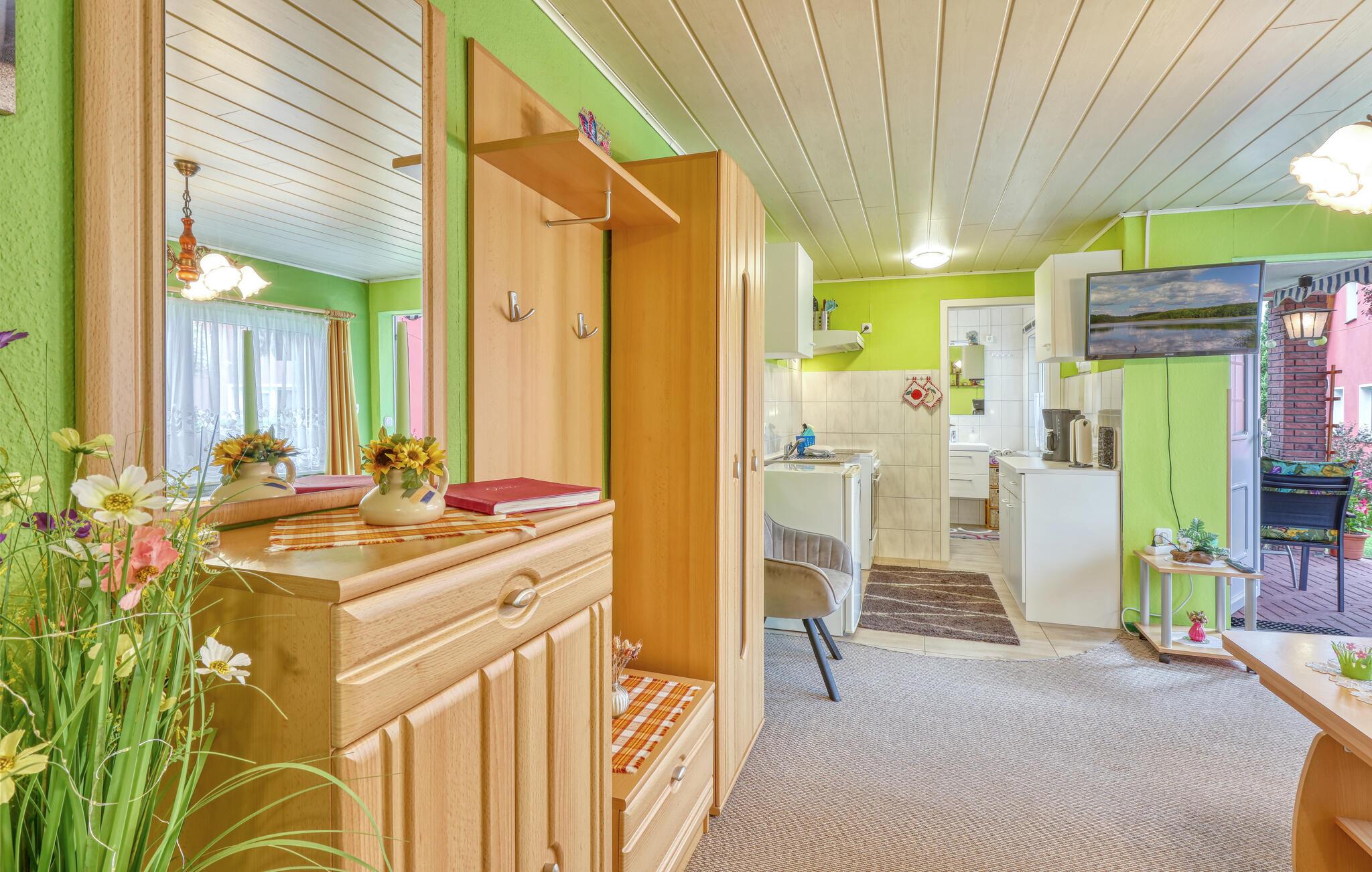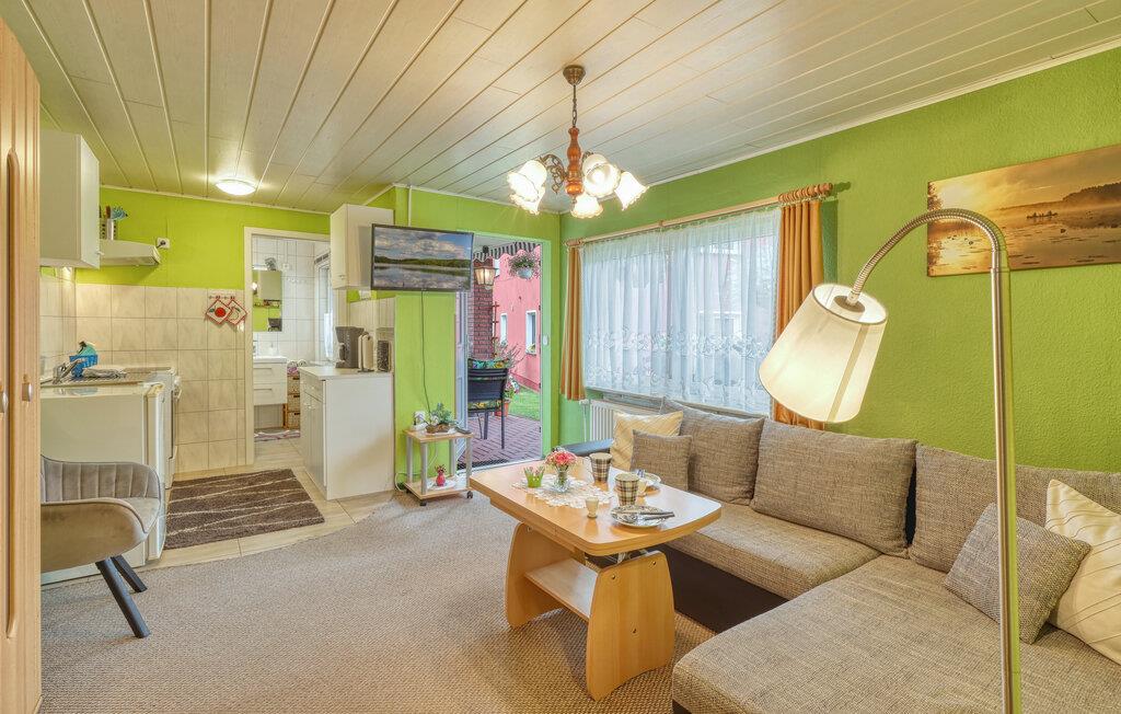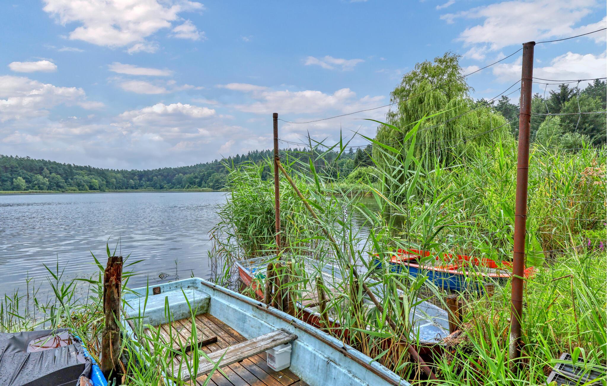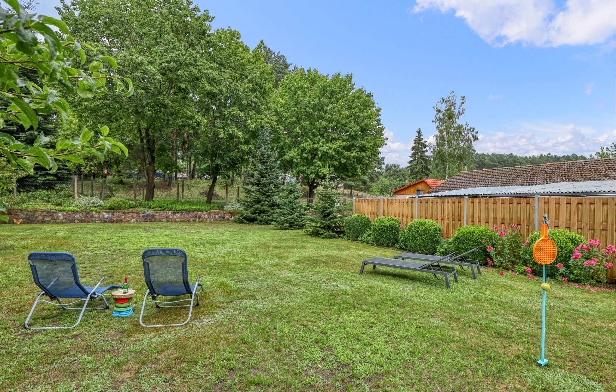 Kun ca. 100 m fra Globsowsøen ligger de to sommerhuse på ejerens velholdte beboelsesejendom. Badepladsen ligger cirka 200 m væk. Dette hus er udstyret med en stue (polstrede møbler, satellit-tv, radio), et soveværelse (1 dobbeltseng, 2 polstrede liggestole), et åbent tekøkken (elkomfur med ovn, køleskab, diverse køkkenmaskiner) og et badeværelse med bad/toilet. Boligen kan opvarmes centralt. WiFi er også tilgængeligt. På det udendørs område er der møbleret terrasse, grill, diverse legeredskaber, parkeringsplads og robåd til fri afbenyttelse. Den samlede pris inkluderer slutrengøring, sengelinned, håndklæder, vand og energi. Altglobsow er en lille landsby i et smukt skovområde, cirka 9 km syd for Fürstenberg. Den lille by Rheinsberg ligger cirka 15 km væk. Globsowsee, en smuk bade- og fiskesø, ligger direkte i byen.