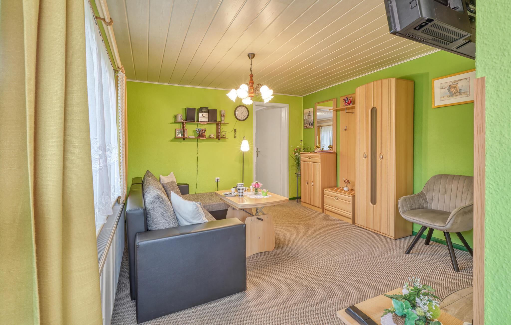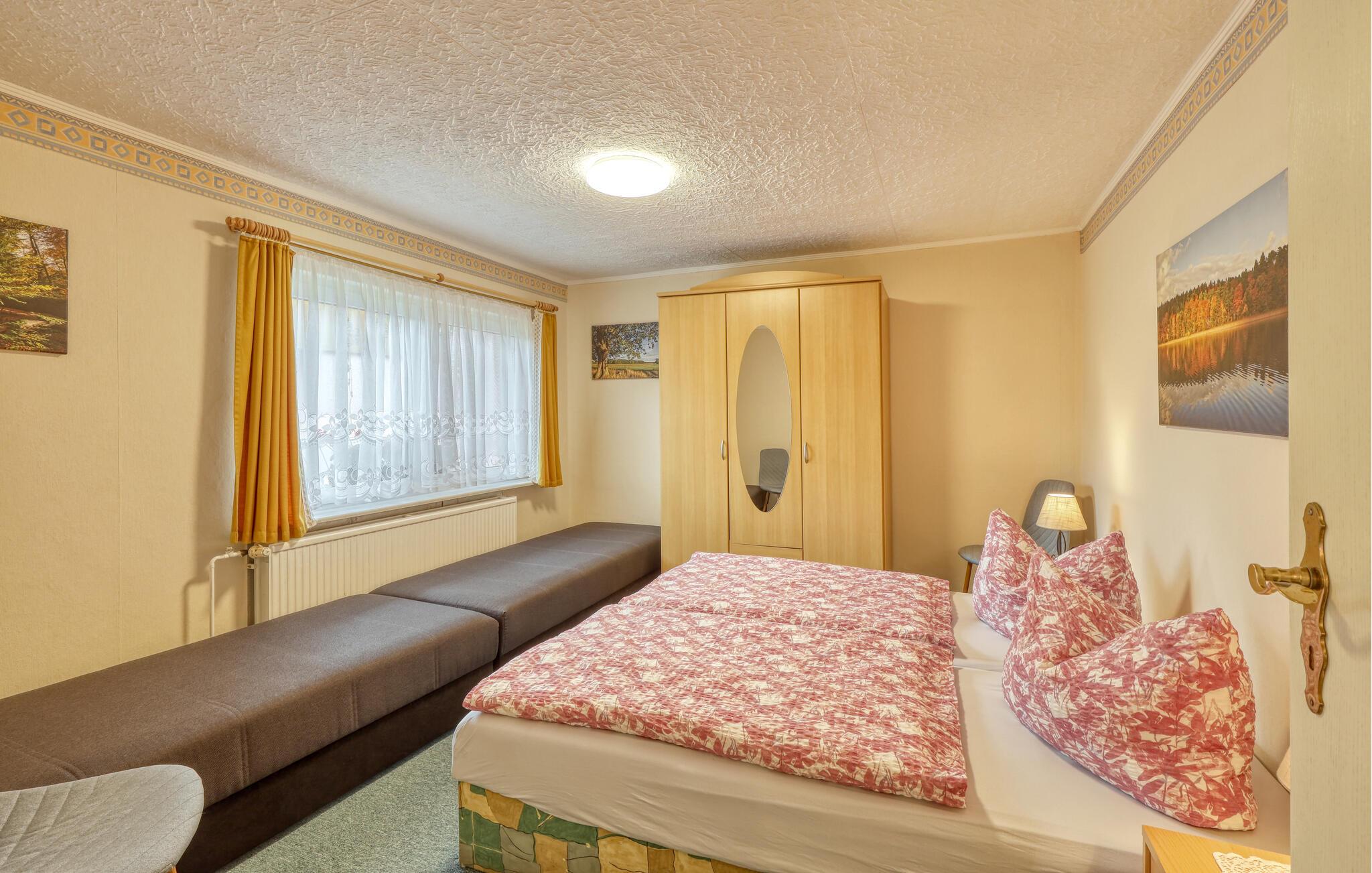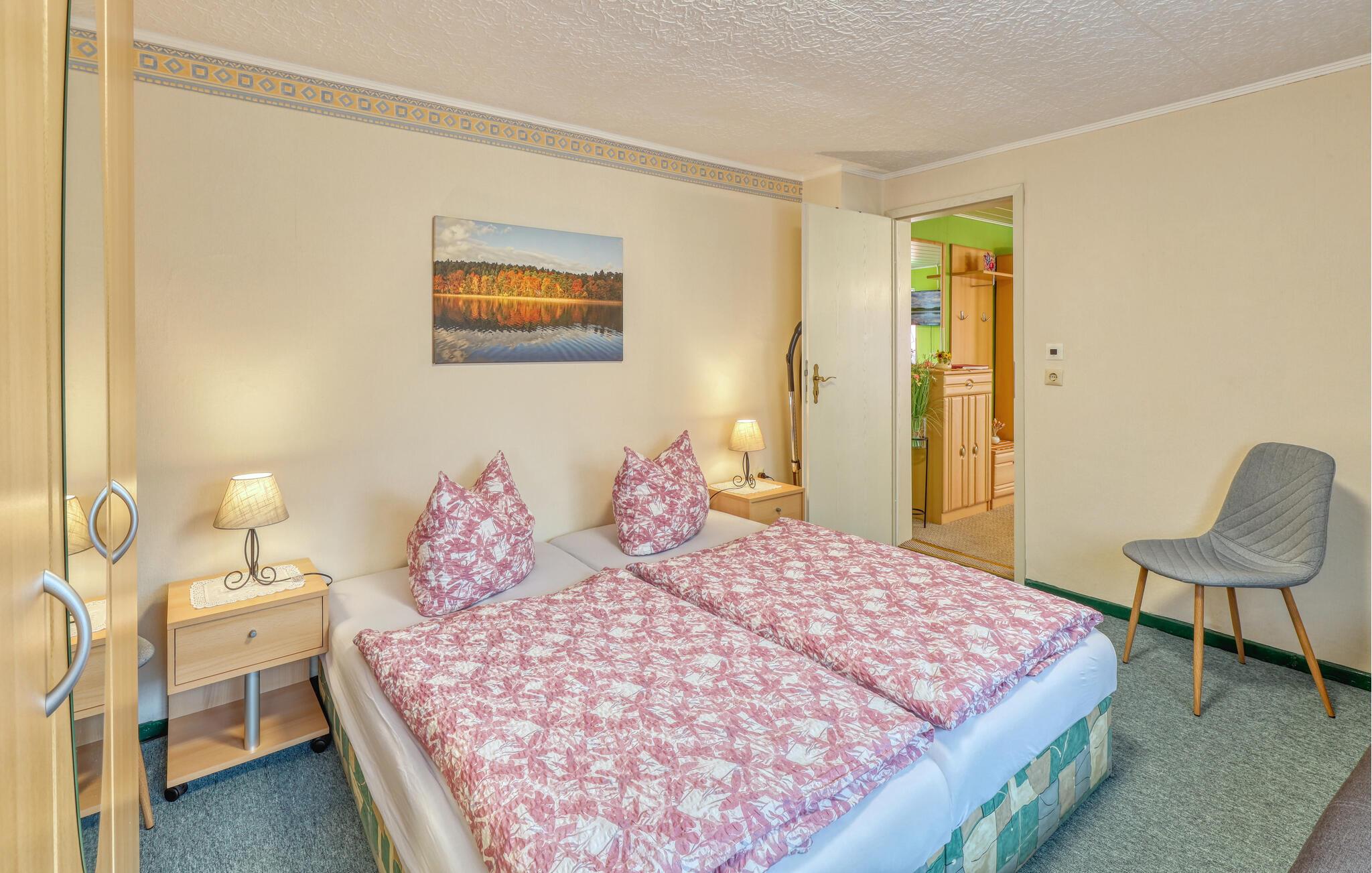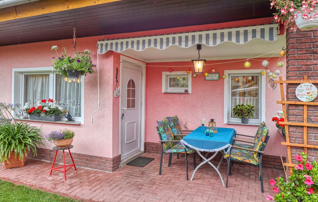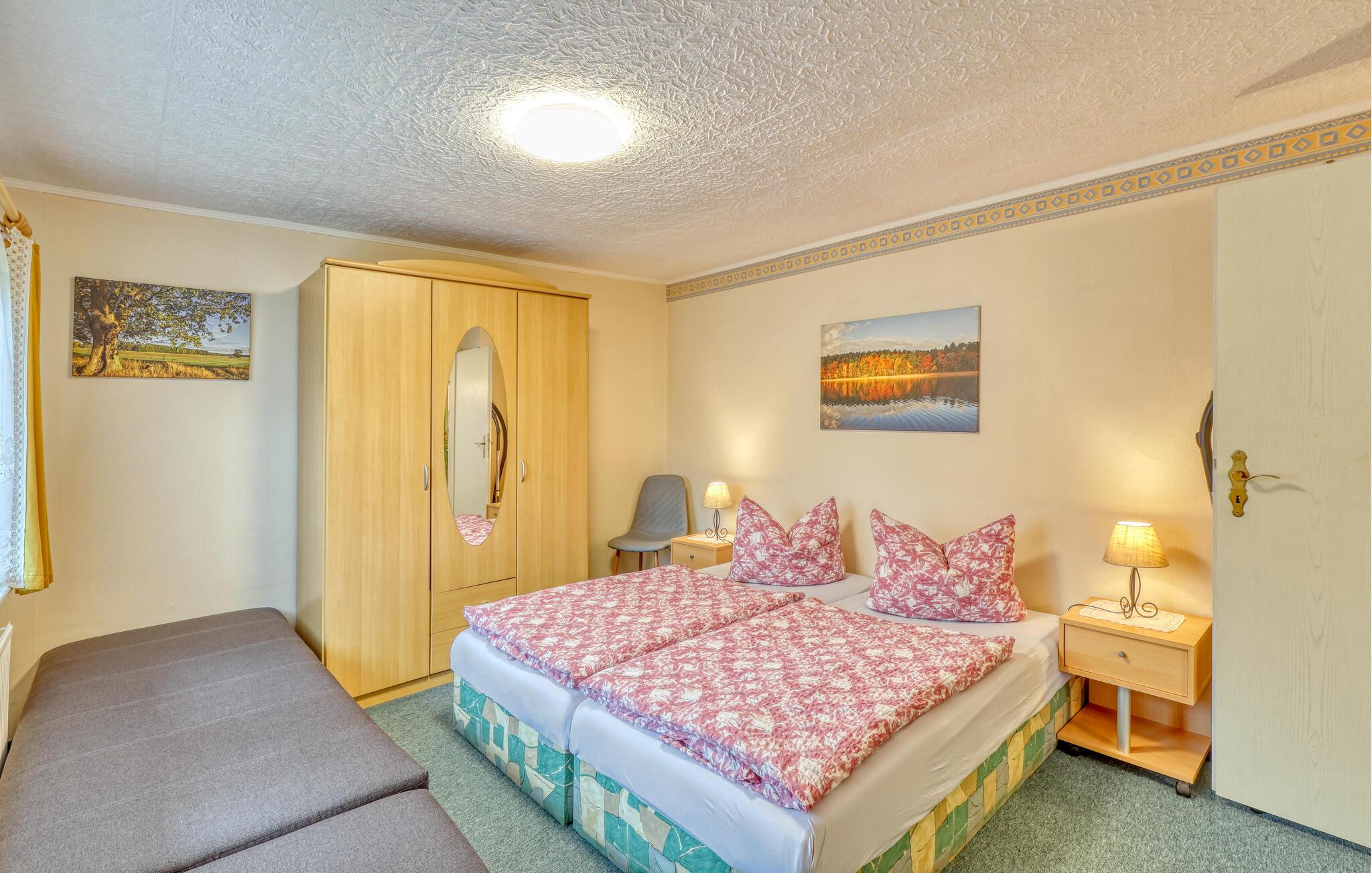 Kun ca. 100 m fra Globsowsøen ligger de to sommerhuse på ejerens velholdte beboelsesejendom. Badepladsen ligger cirka 200 m væk. Dette hus er udstyret med en stue (polstrede møbler, satellit-tv, radio), et soveværelse (1 dobbeltseng, 2 polstrede liggestole), et åbent tekøkken (elkomfur med ovn, køleskab, diverse køkkenmaskiner) og et badeværelse med bad/toilet. Boligen kan opvarmes centralt. WiFi er også tilgængeligt. På det udendørs område er der møbleret terrasse, grill, diverse legeredskaber, parkeringsplads og robåd til fri afbenyttelse. Den samlede pris inkluderer slutrengøring, sengelinned, håndklæder, vand og energi. Altglobsow er en lille landsby i et smukt skovområde, cirka 9 km syd for Fürstenberg. Den lille by Rheinsberg ligger cirka 15 km væk. Globsowsee, en smuk bade- og fiskesø, ligger direkte i byen.