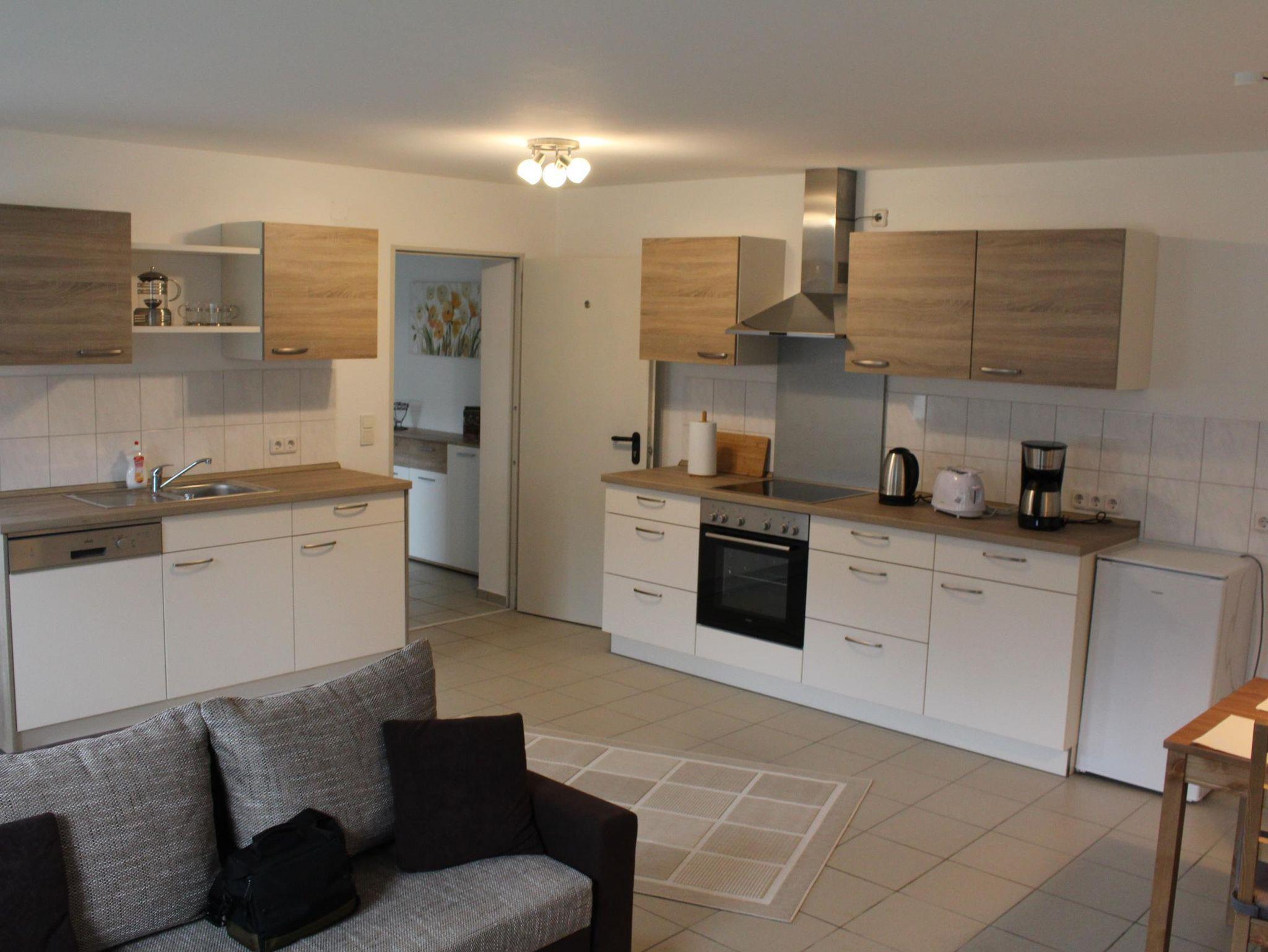 Die FeWo hat einen offenen Küche-/Ess-/Wohnbereich, ein Bad mit Dusche und ein Schlafzimmer mit Doppelbett (180x200). Die neue, moderne Küche ist ausgestattet mit Ceranfeld und Backofen, einer Spülmaschine, Kaffeemaschine, Wasserkocher, Toaster und Kühlschrank.