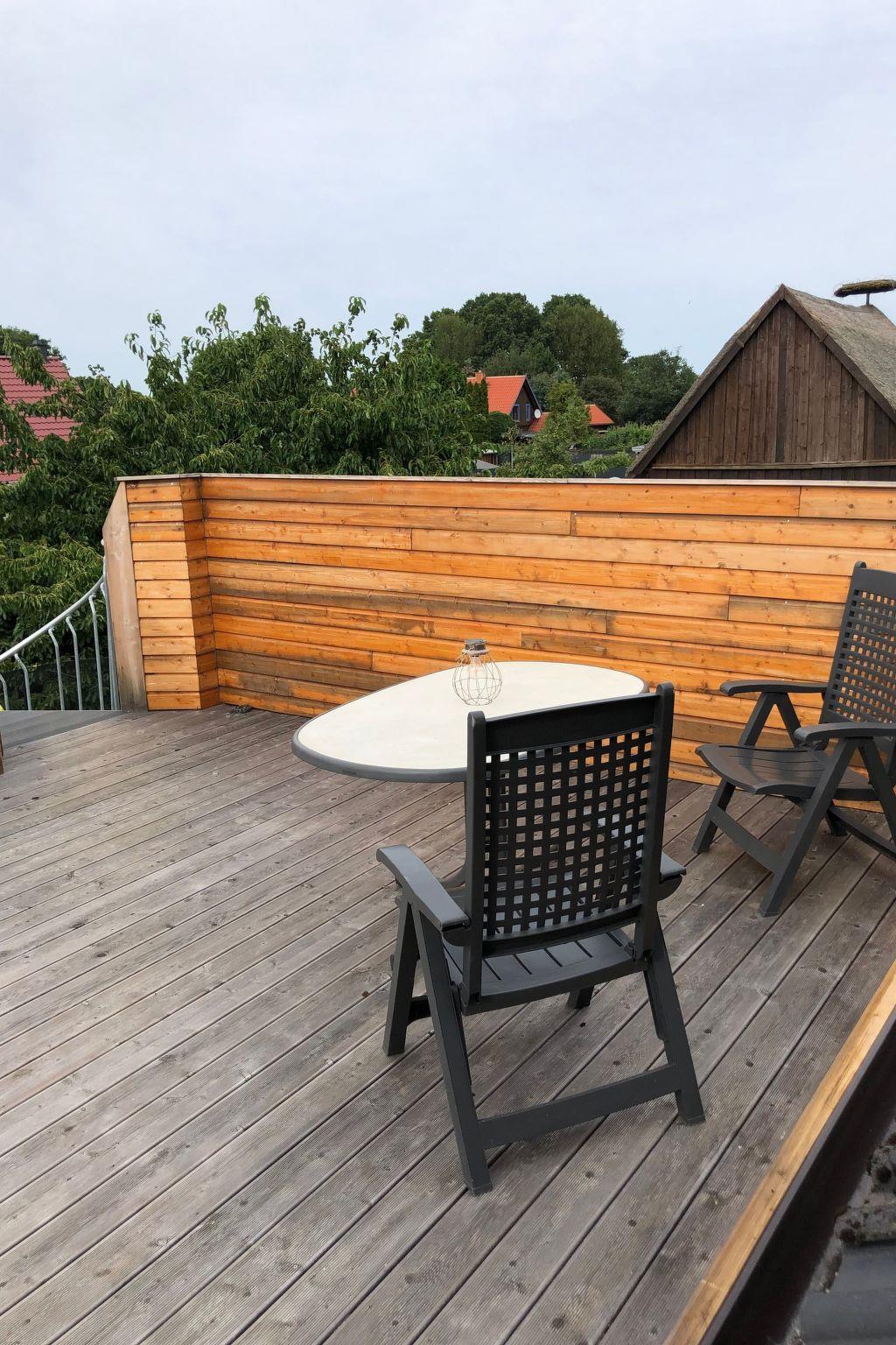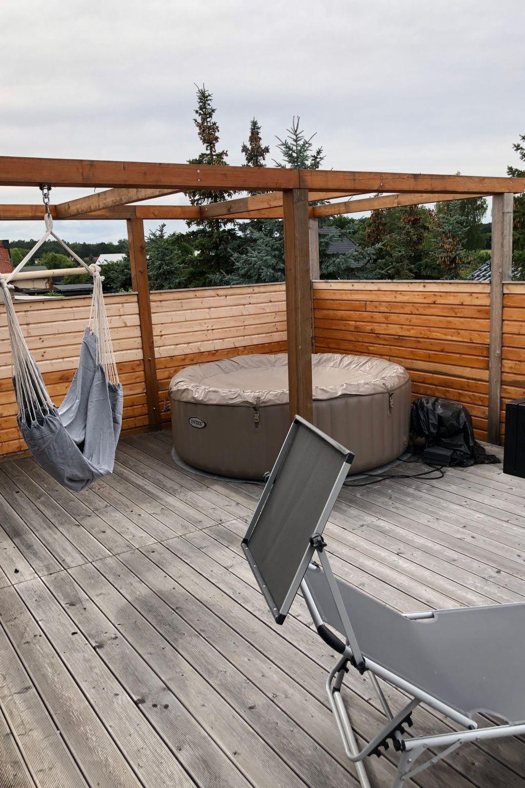 This wonderful new "Apartment am Stettiner Haff" is located on the top floor and can only be reached via a turning staircase for 2 to max. 3 persons. Enjoy a relaxing holiday in a modern, rustically furnished holiday home flat, which serves a comfortable holiday for 2 people (all points of a 3 star holiday flat are fulfilled). The living space in the upper flat is divided into a bed-sitting room with a spacious double bed (140 cm x 200 cm), surrounded by two bedside tables with reading lamps on both sides. There is a sideboard in front of the bed that offers plenty of storage space for your luggage. A high chair is available free of charge for very young guests. The centrepiece of the flat is the 36 m² living room and bedroom, with a 40 m² roof terrace to go out and soak up the sun, with an integrated kitchenette, a dining area and a comfortable pull-out sofa bed. Relax after a day out while the flat-screen TV with satellite TV and TV-USB connection provides entertainment. The open-plan kitchen allows you to cater for yourself with a four-zone hob, oven, fridge with freezer compartment and numerous small electrical appliances, from a toaster and kettle to a coffee machine. The turning staircase leads to the large roof terrace approx. 40 square metres, with hanging chair, whirlpool which can also be used on request (for a fee) and lounge furniture to sit on. We wish you a pleasant stay.
