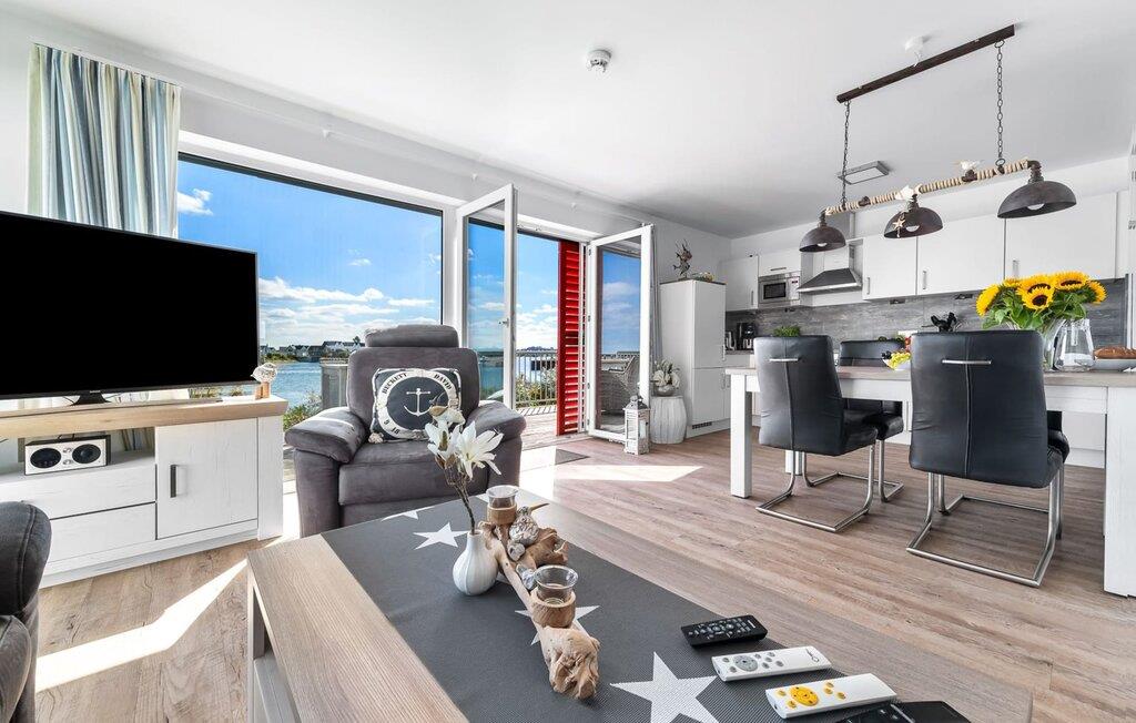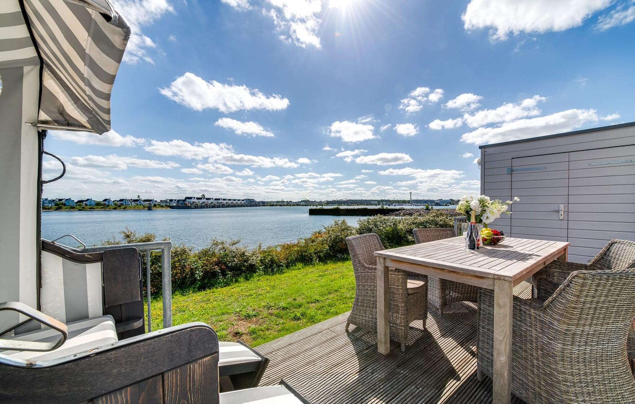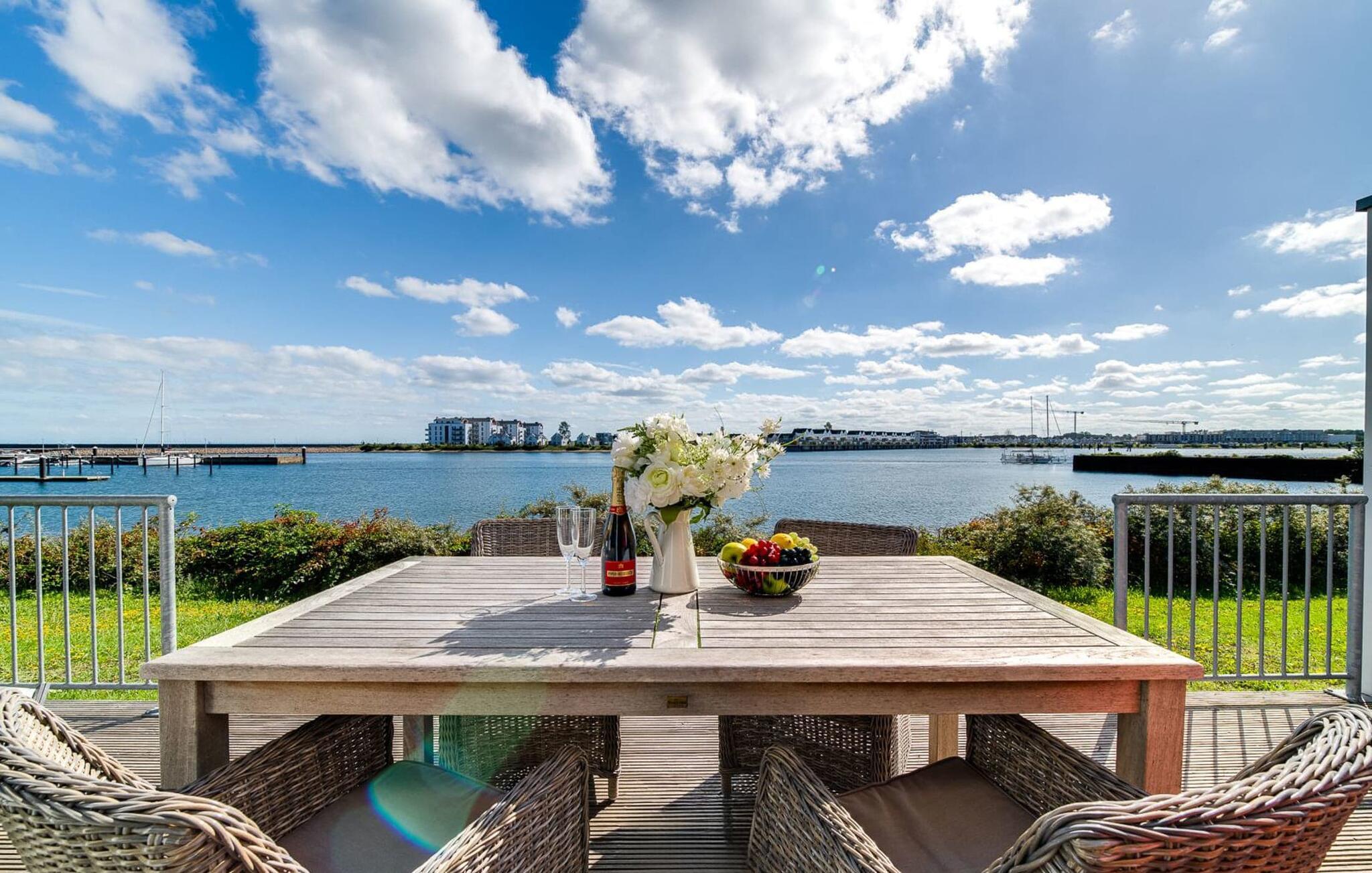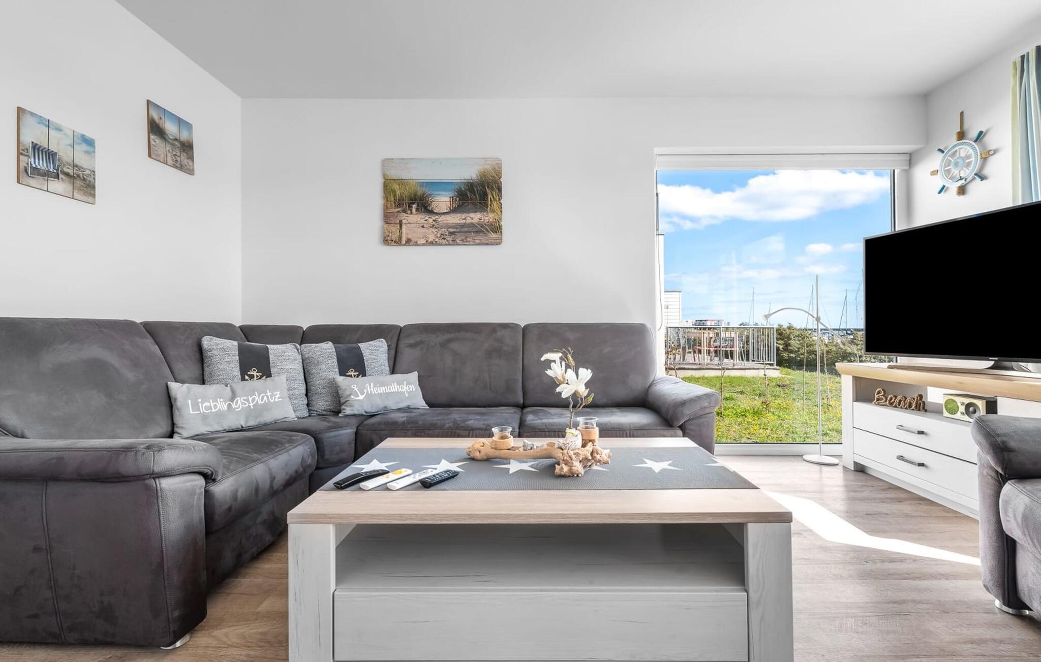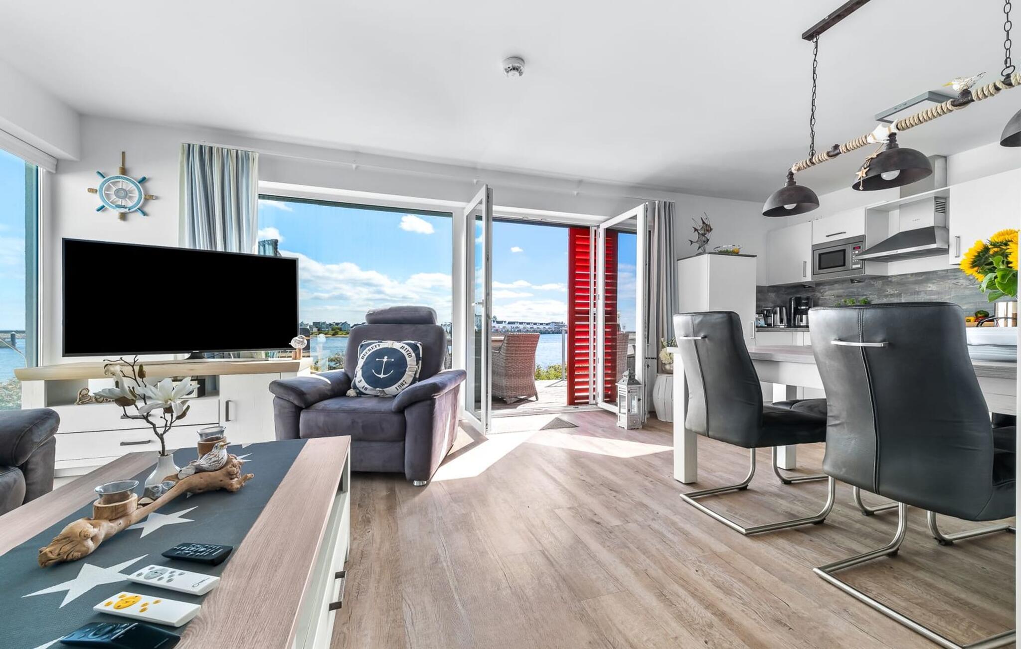 En fantastisk udsigt viser sig i opholdsområdet gennem gulv-til-loft vinduer ud over den tilstødende terrasse med udsigt over lystbådehavnen. Havnebiografen sørger for underholdning under en hyggelig grillaften eller en romantisk middag med levende lys.