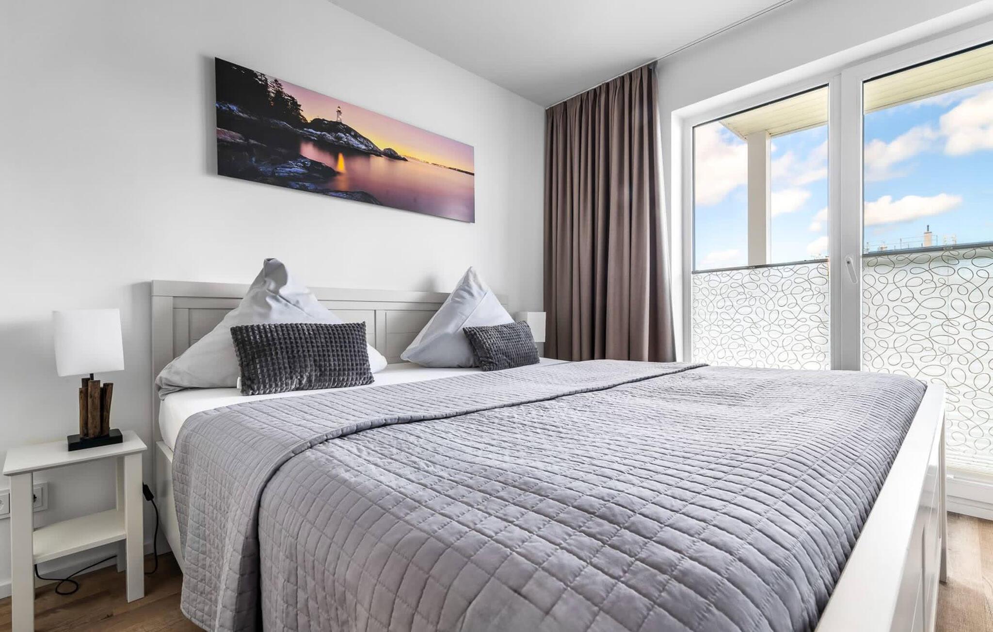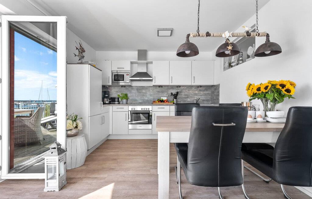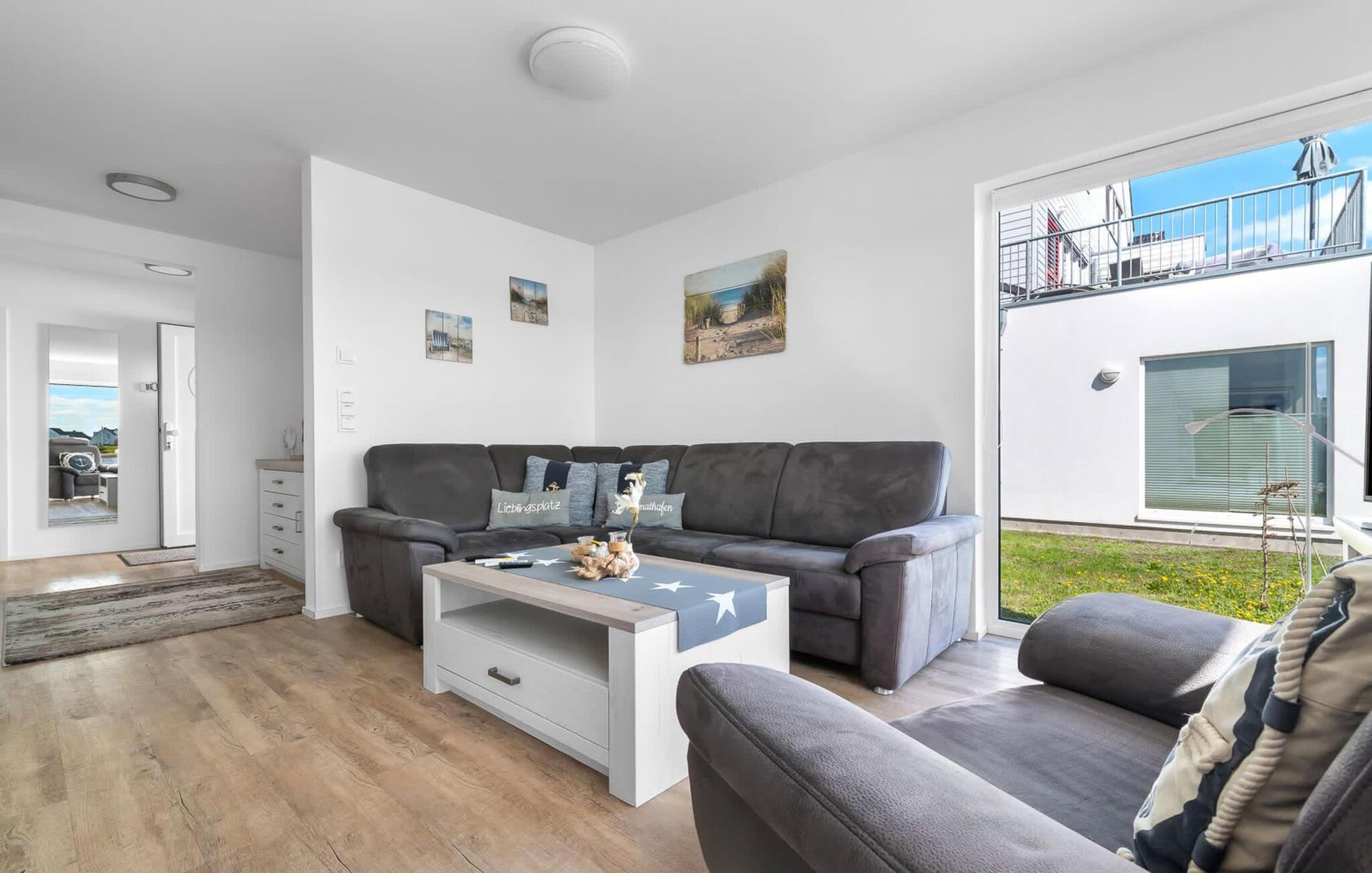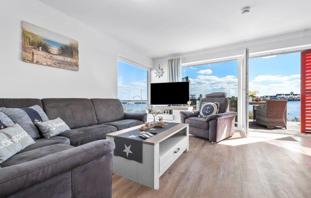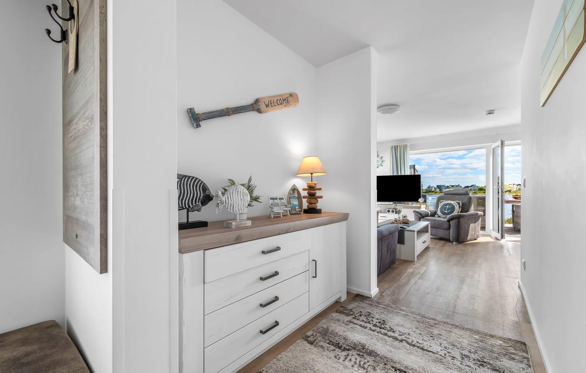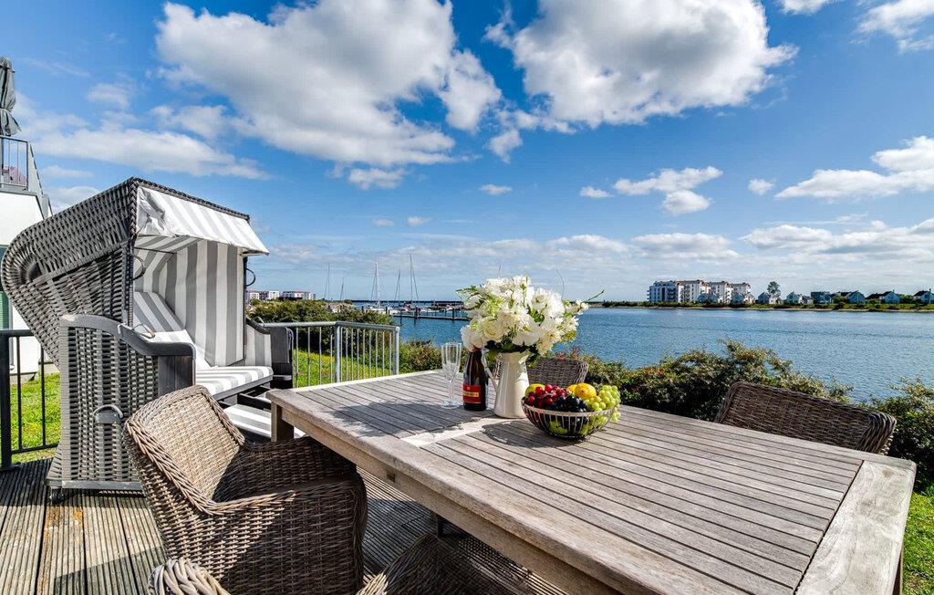 En fantastisk udsigt viser sig i opholdsområdet gennem gulv-til-loft vinduer ud over den tilstødende terrasse med udsigt over lystbådehavnen. Havnebiografen sørger for underholdning under en hyggelig grillaften eller en romantisk middag med levende lys.