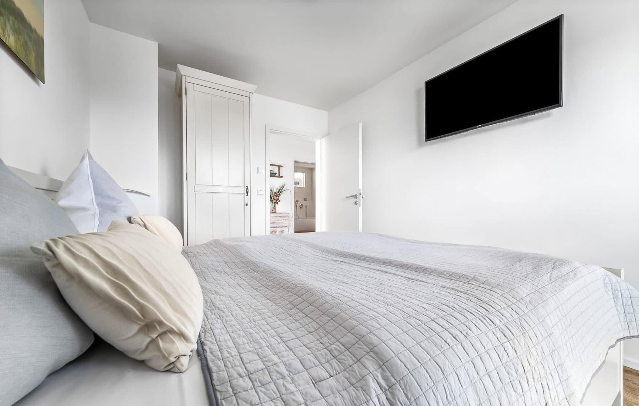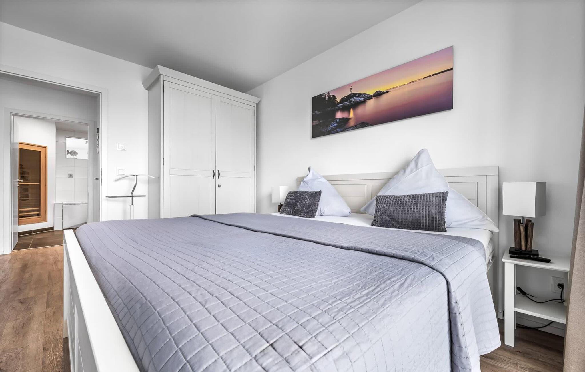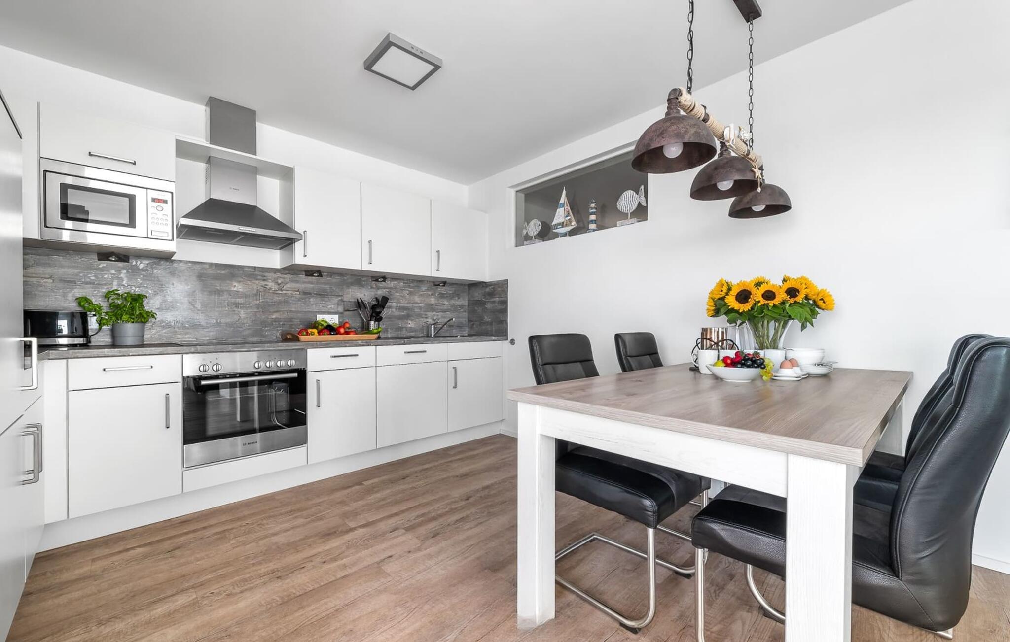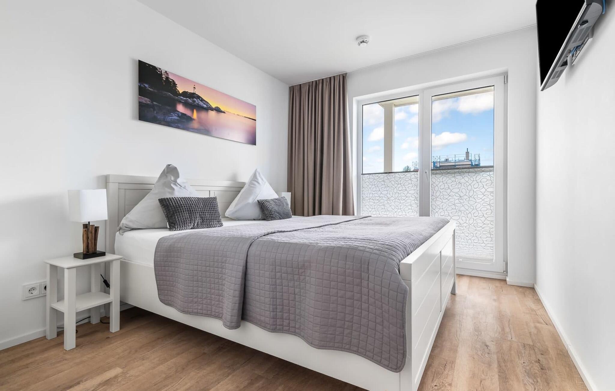 En fantastisk udsigt viser sig i opholdsområdet gennem gulv-til-loft vinduer ud over den tilstødende terrasse med udsigt over lystbådehavnen. Havnebiografen sørger for underholdning under en hyggelig grillaften eller en romantisk middag med levende lys.
