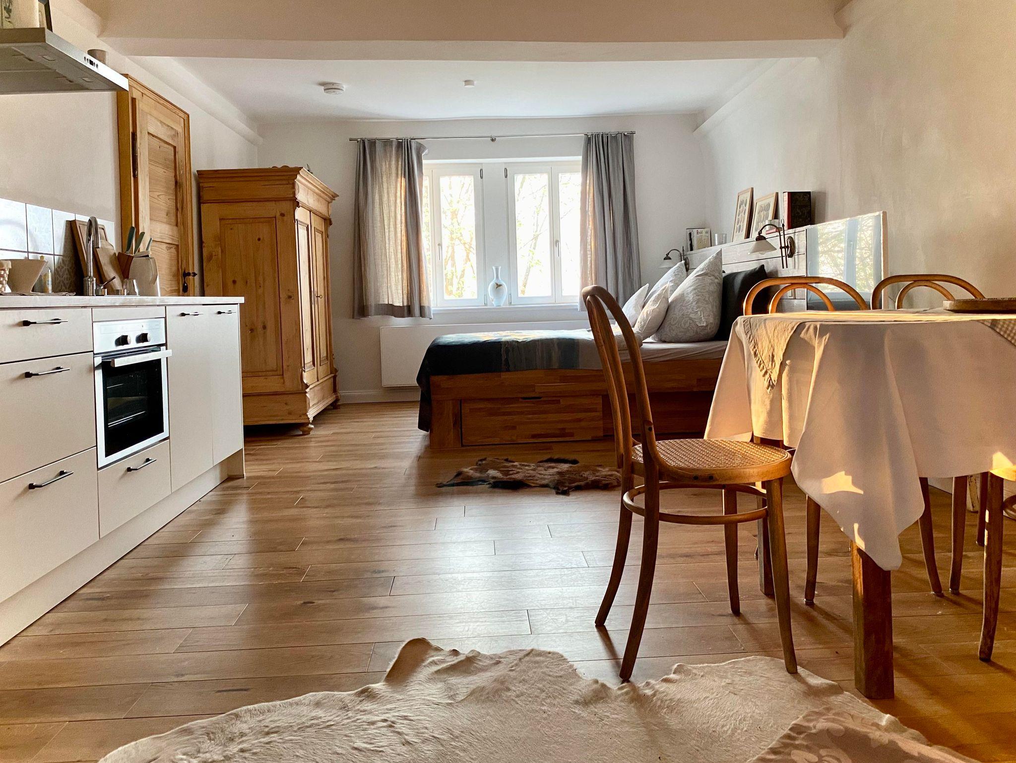 Das Wohnhaus wurde ca. 1775 errichtet, die benachbarte große Scheune mit beeindruckender Zimmermannskonstruktion 1886 beendet. Weitere Nebengebäude und Stallungen zeugen von der wechselvollen Geschichte des Hofes, der bis 2000 bewirtschaftet wurde. Die komplett sanierten und individuell mit einem hochwertigen Mix aus Alt und Neu ausgestatteten Wohnungen bieten bequeme Übernachtungsmöglichkeiten und Feriengenuss: komfortable Doppelbetten, eine großzügig ausgestattete Küchenzeile und ein modernes Bad/WC mit Dusche. Gemeinschaftsraum mit Waschmaschine und Trockner und ein abschließbarer Abstellraum stehen den Gästen zur Verfügung. Ein Wintergarten und die gesamte Hoffläche mit schattigen Plätzen laden zum Frühstück oder einem gemütlichen Sundowner ein.