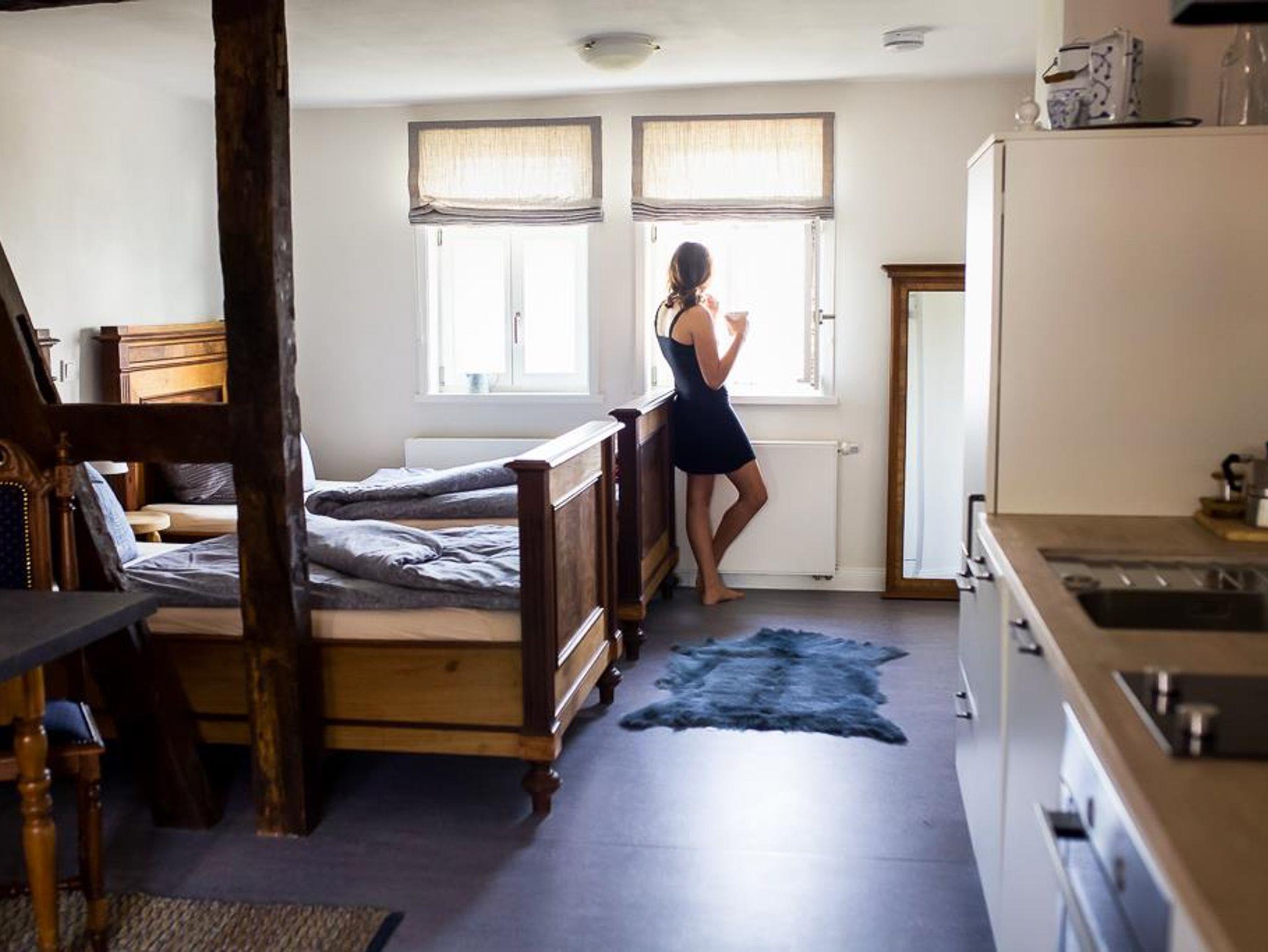 Das Wohnhaus wurde ca. 1775 errichtet, die benachbarte große Scheune mit beeindruckender Zimmermannskonstruktion 1886 beendet. Weitere Nebengebäude und Stallungen zeugen von der wechselvollen Geschichte des Hofes, der bis 2000 bewirtschaftet wurde. Die komplett sanierten und individuell mit einem hochwertigen Mix aus Alt und Neu ausgestatteten Wohnungen bieten bequeme Übernachtungsmöglichkeiten und Feriengenuss: komfortable Doppelbetten, eine großzügig ausgestattete Küchenzeile und ein modernes Bad/WC mit Dusche. Gemeinschaftsraum mit Waschmaschine und Trockner und ein abschließbarer Abstellraum stehen den Gästen zur Verfügung. Ein Wintergarten und die gesamte Hoffläche mit schattigen Plätzen laden zum Frühstück oder einem gemütlichen Sundowner ein.