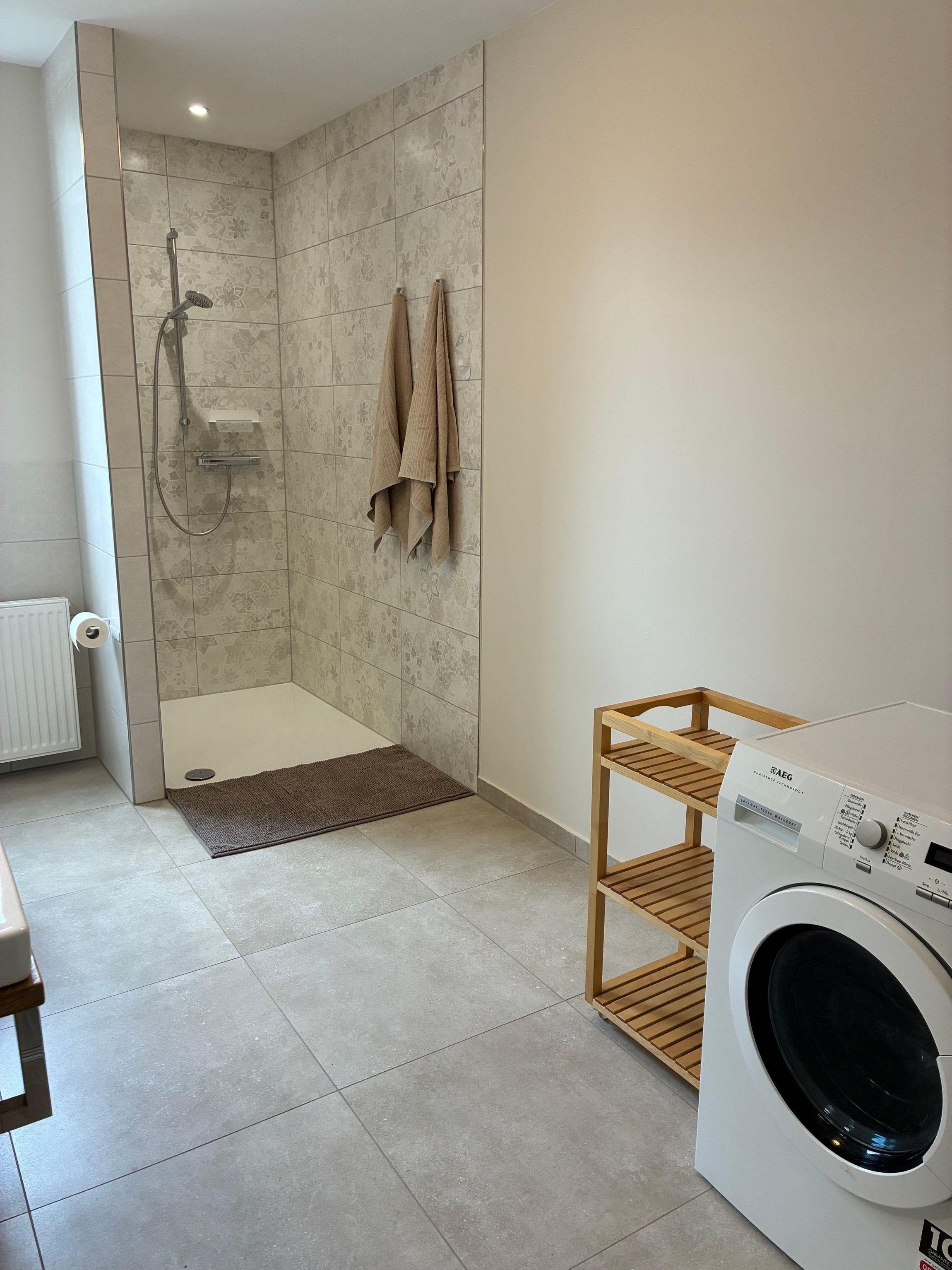 Kernsaniertes Bad mit einer großzügigen Dusche, WC, zwei Waschbecken, Spiegel und einem Fenster. Ein Waschtrockner steht kostenlos zur Verfügung.