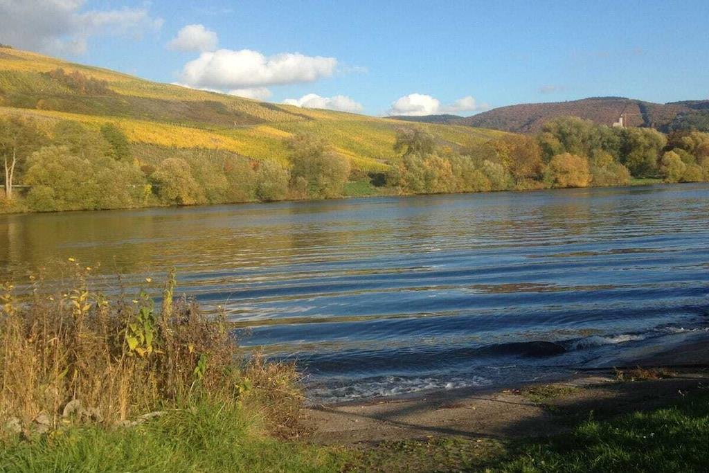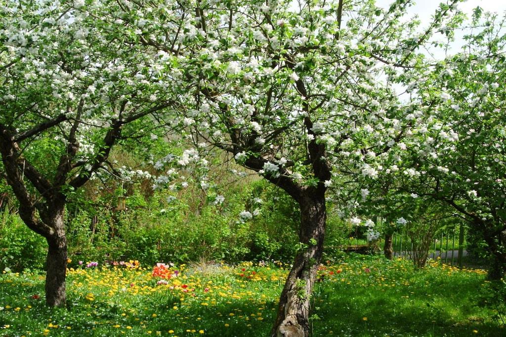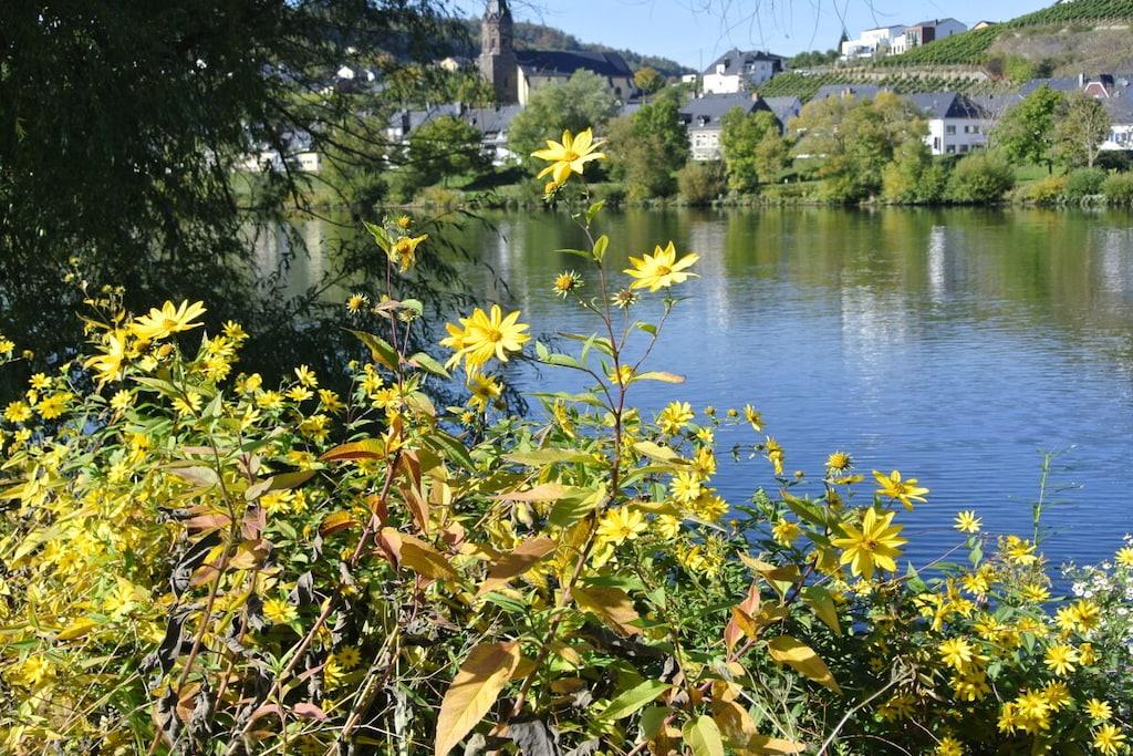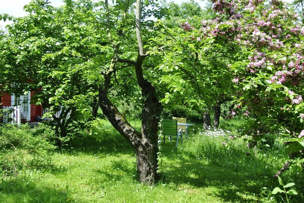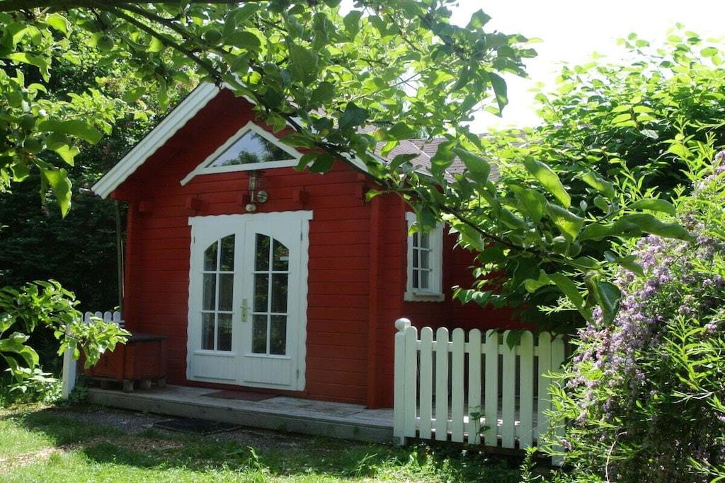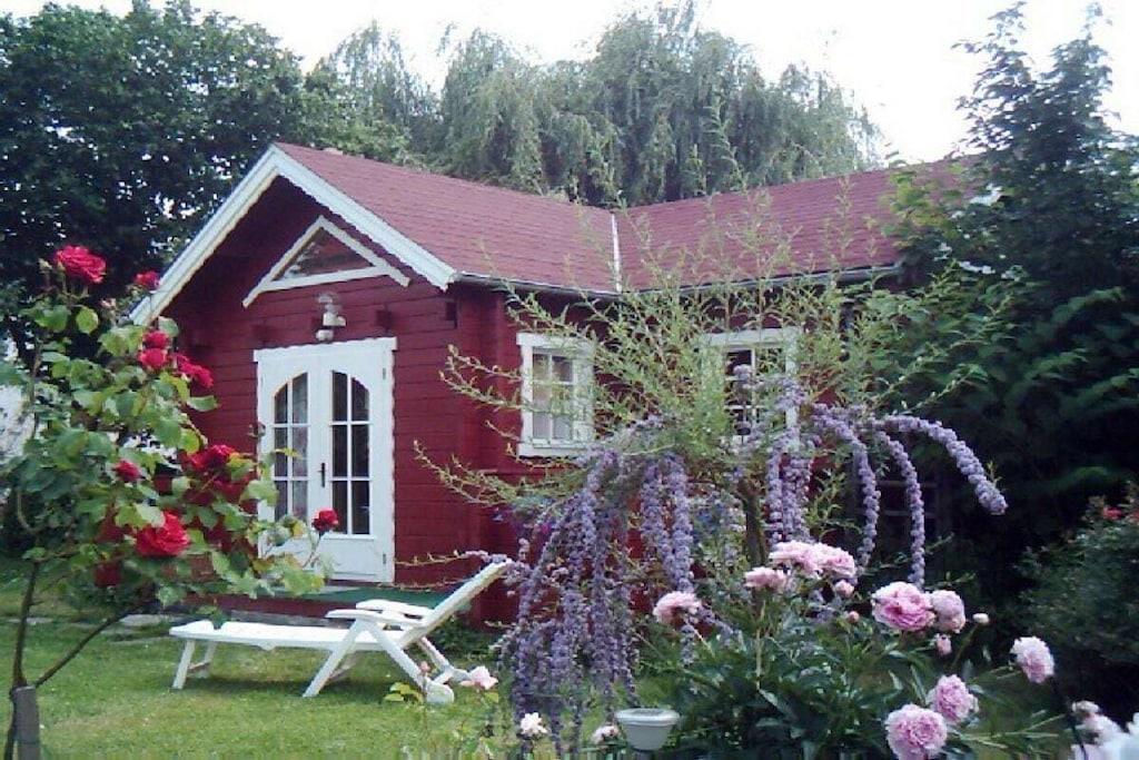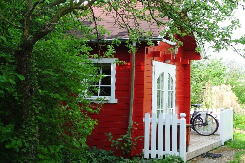Unique red wooden house in the middle of a garden with flowers and trees, here you can look forward to spring. On the banks of the Moselle and close to the cycle path.