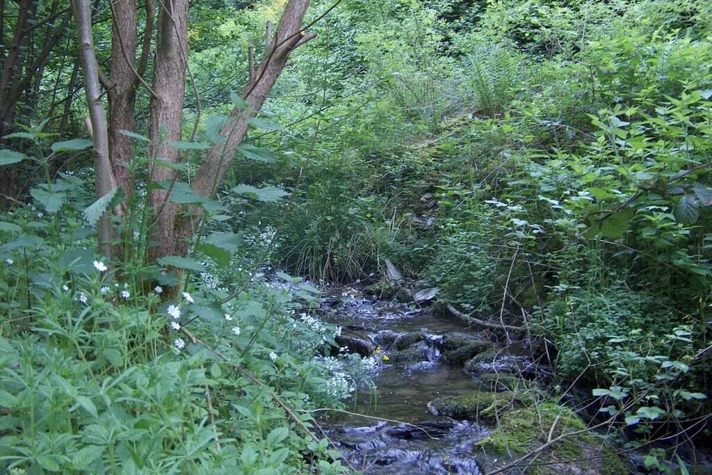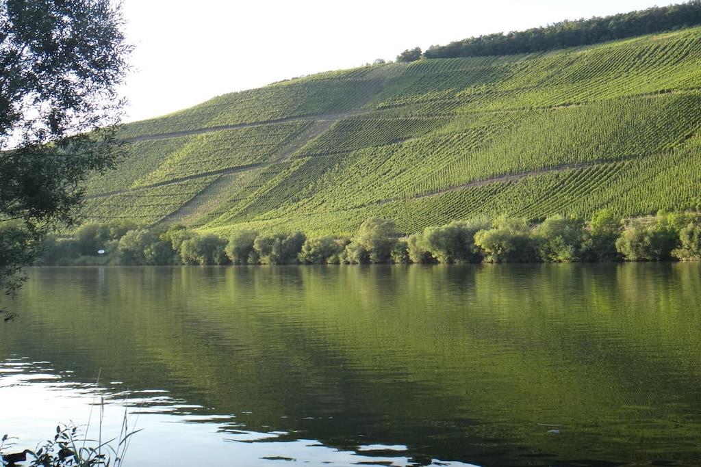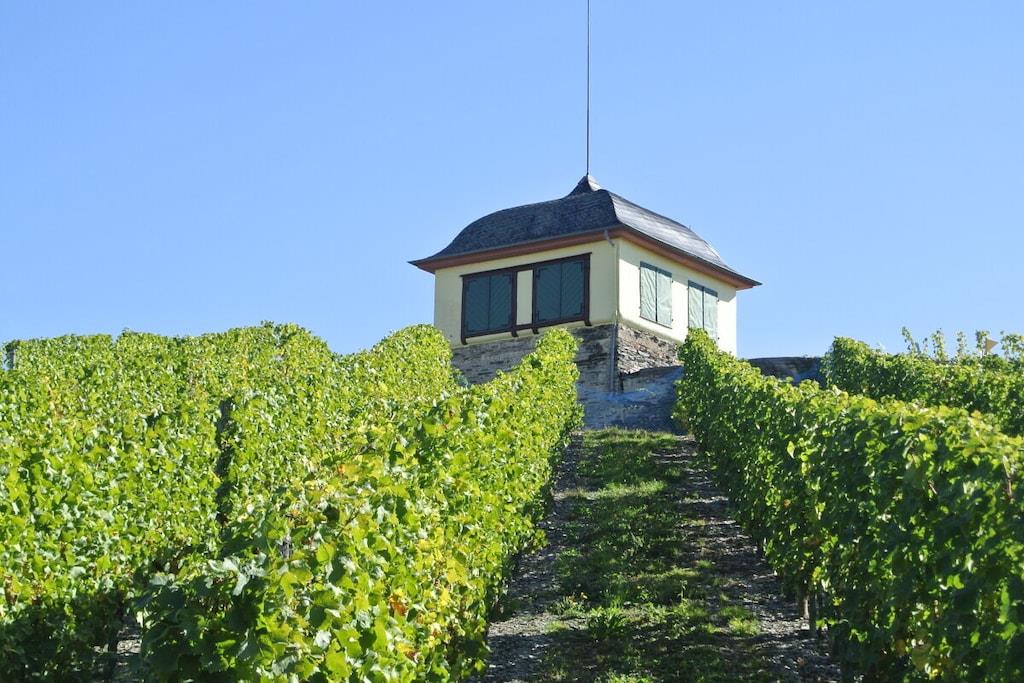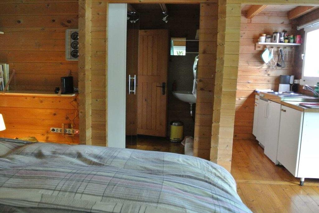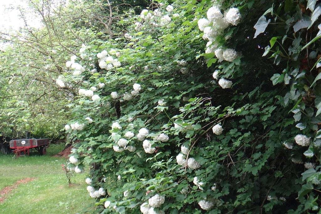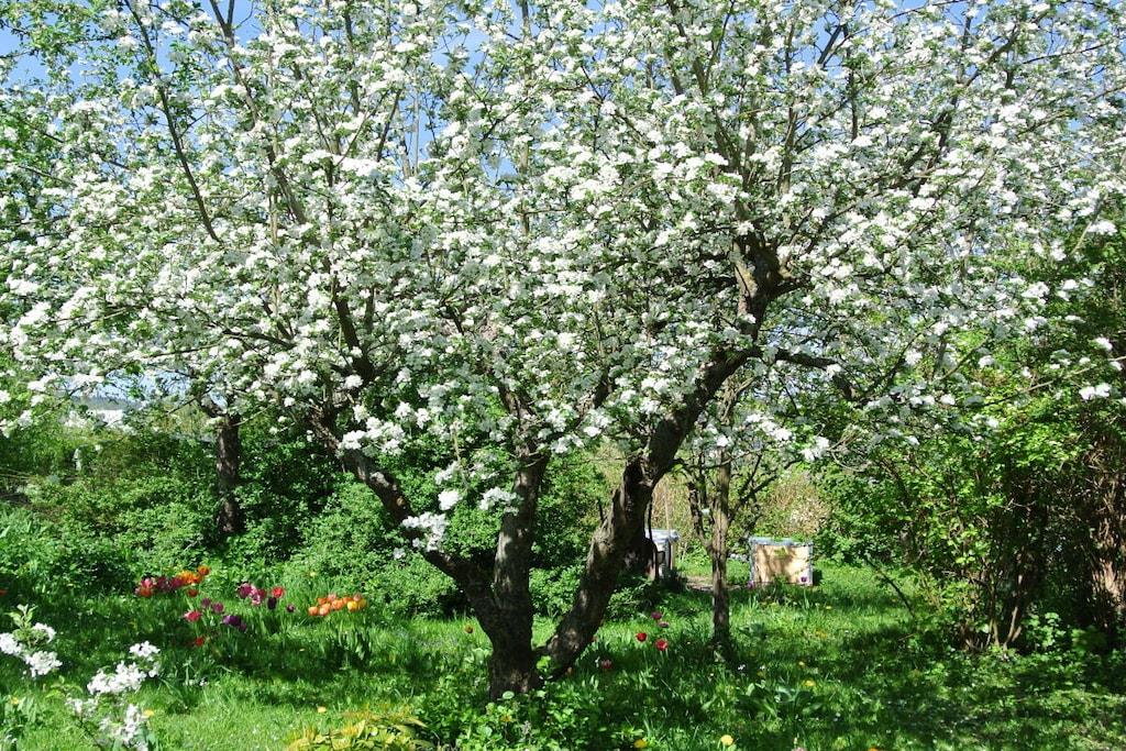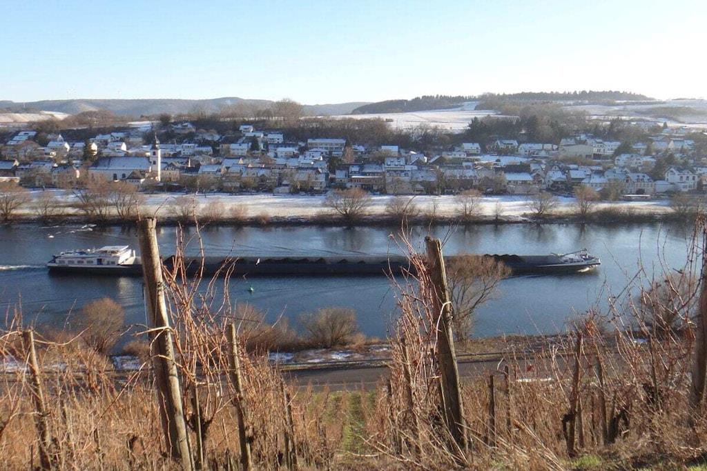 Unique red wooden house in the middle of a garden with flowers and trees, here you can look forward to spring. On the banks of the Moselle and close to the cycle path.