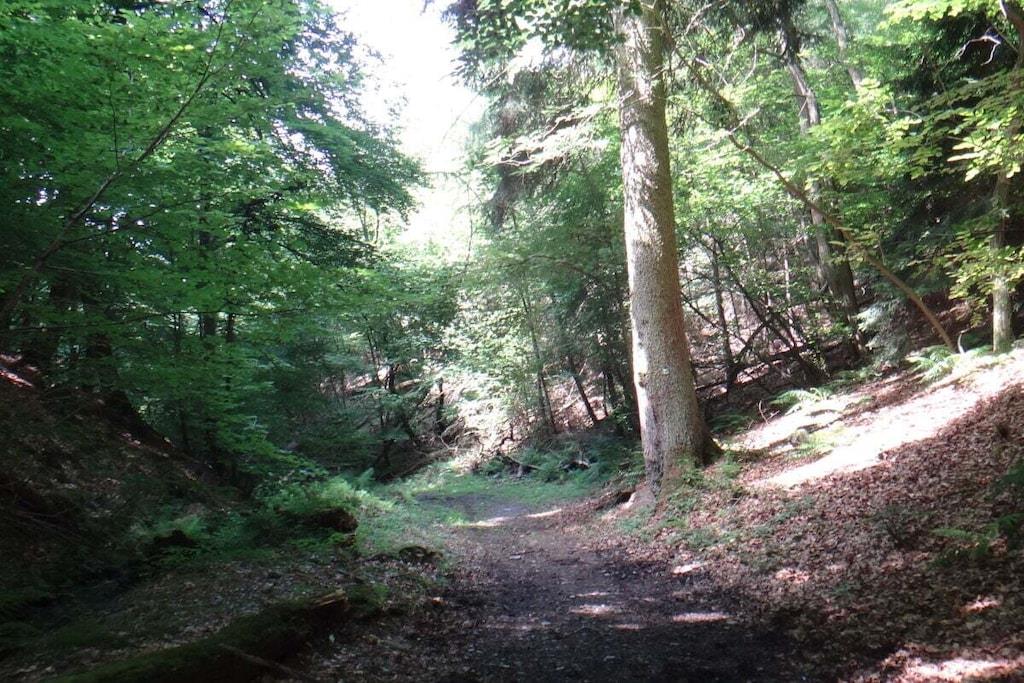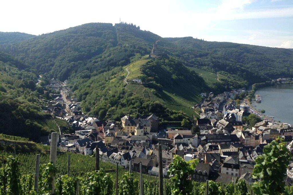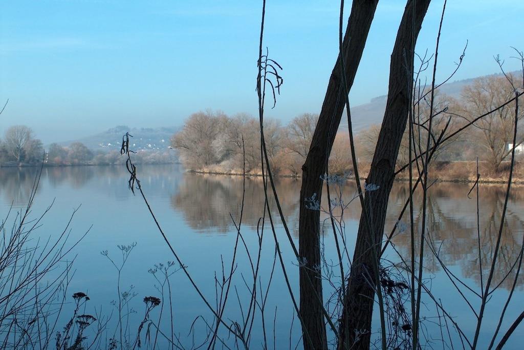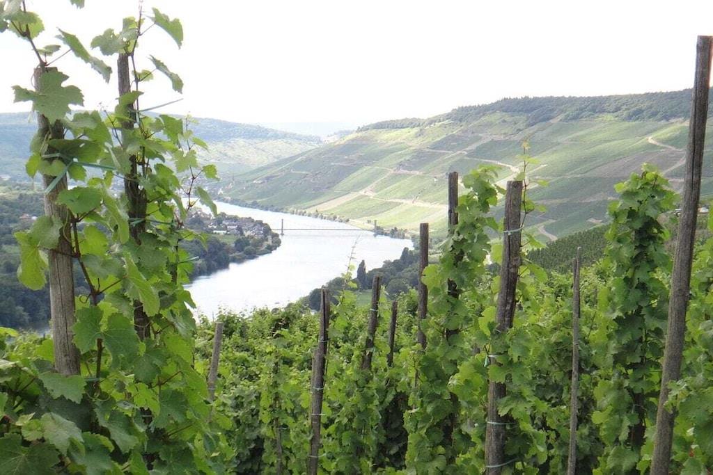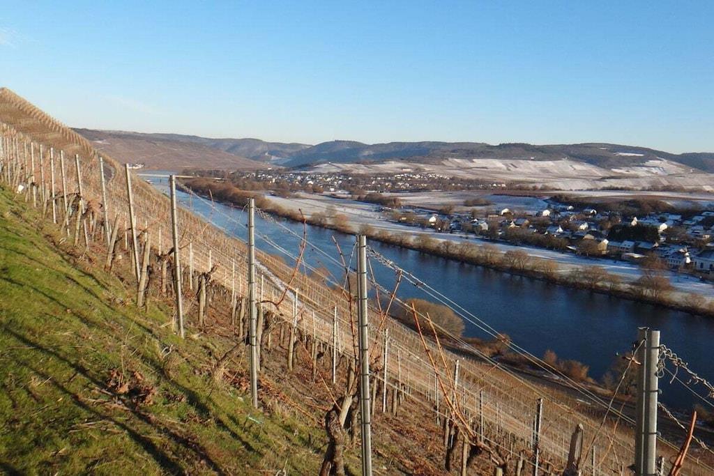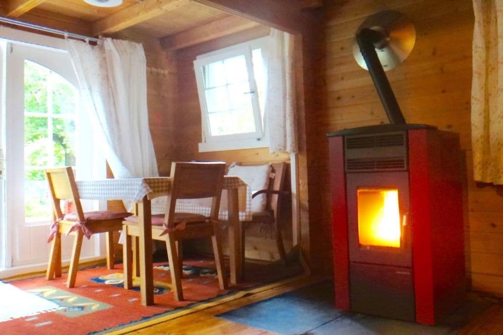 Unique red wooden house in the middle of a garden with flowers and trees, here you can look forward to spring. On the banks of the Moselle and close to the cycle path.