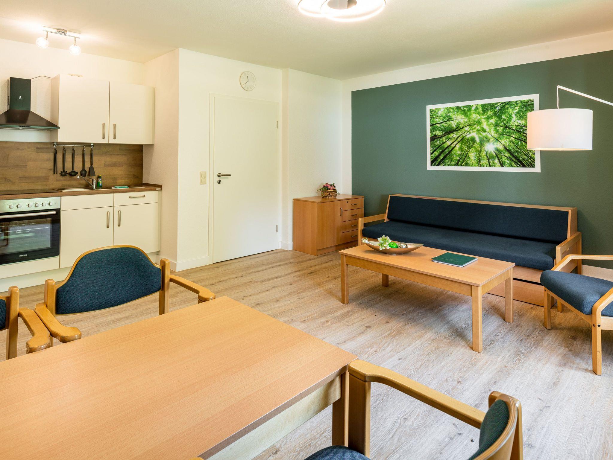 Jedes Ferienhaus ist modern eingerichtet und voll ausgestattet mit einer Einbauküche, barrierefreiem* Badezimmer, TV sowie in der Regel schadstoffarmen Möbeln und Bodenbelägen (Parkett / Linoleum). Besteht während des Aufenthalts im Ferienhaus die Notwendigkeit, Ihre Wäsche zu erledigen, so stehen hierfür auf dem IDA Gelände natürlich auch Waschmaschinen und Trockner zur Verfügung.