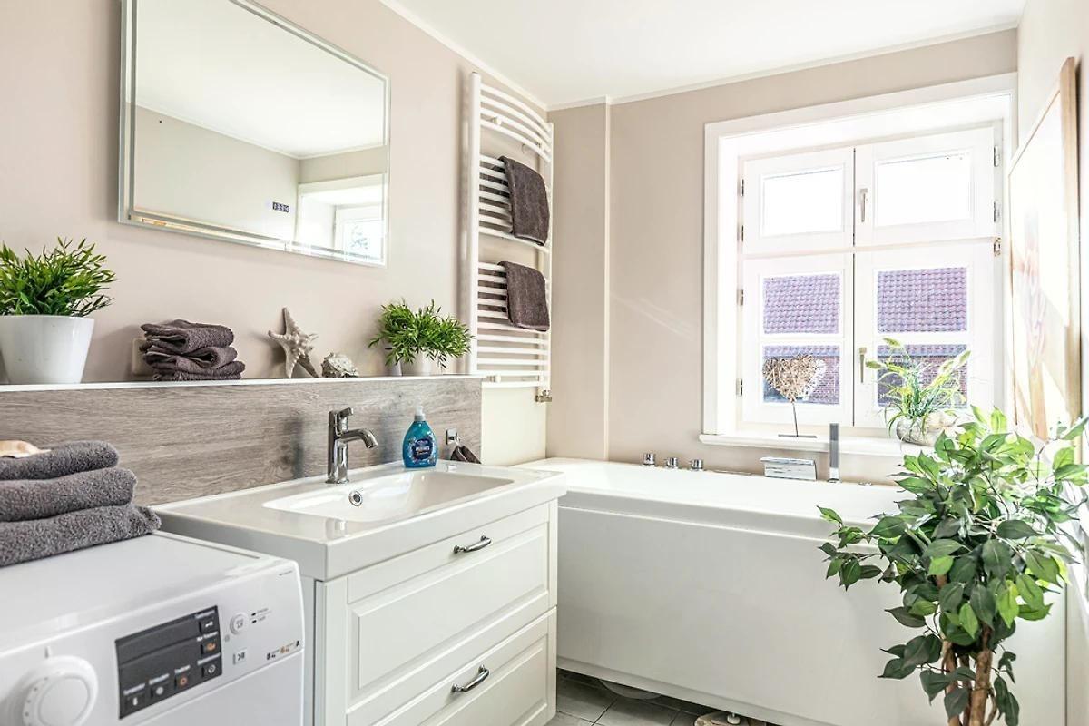 Im Badezimmer ist eine große Dusche, ein Waschtisch, eine Waschmaschine und eine luxus Whirlpool Badewanne mit Whirl- Air- und Farblichttherapie in der man so richtig entspannen kann.