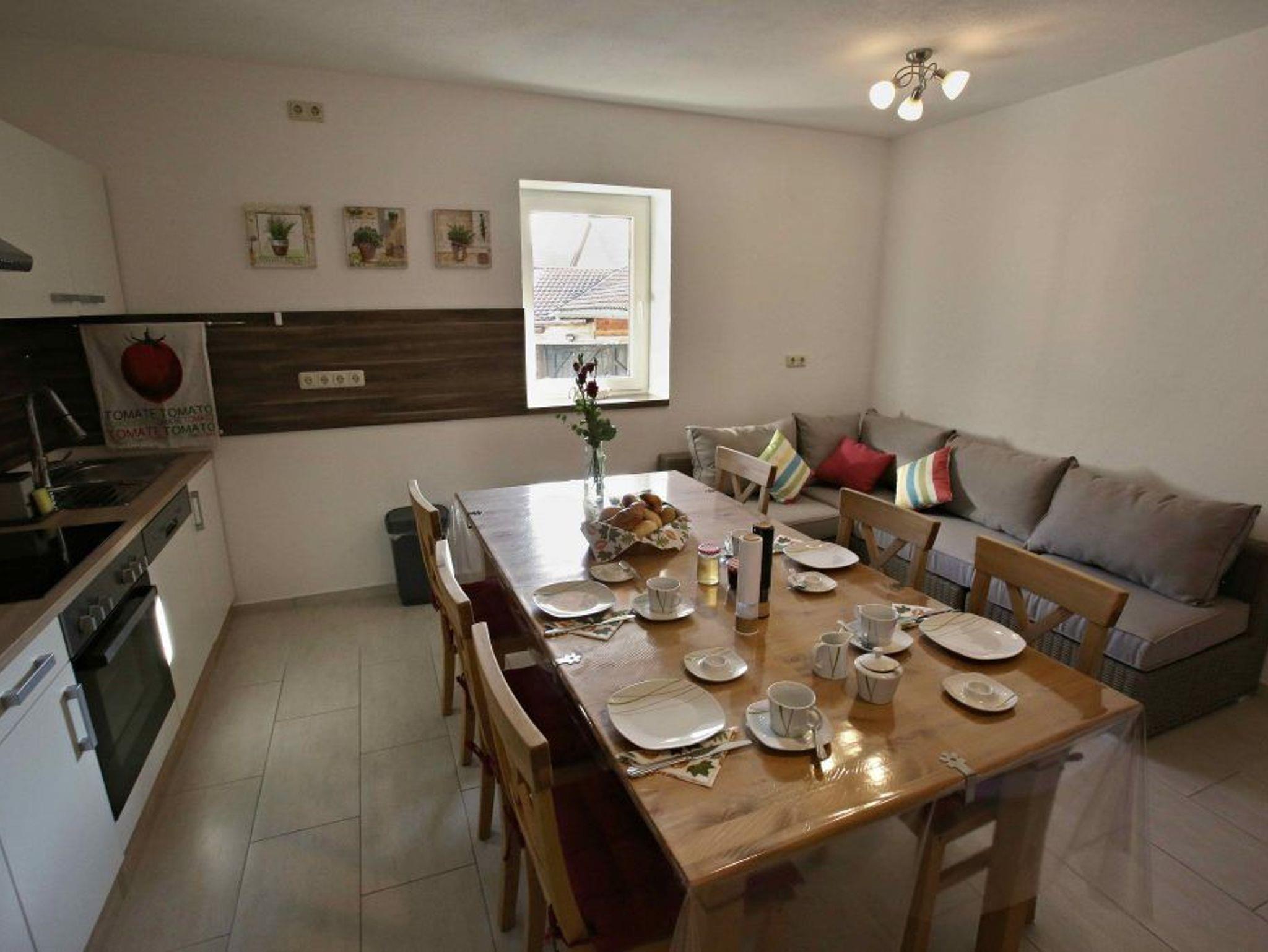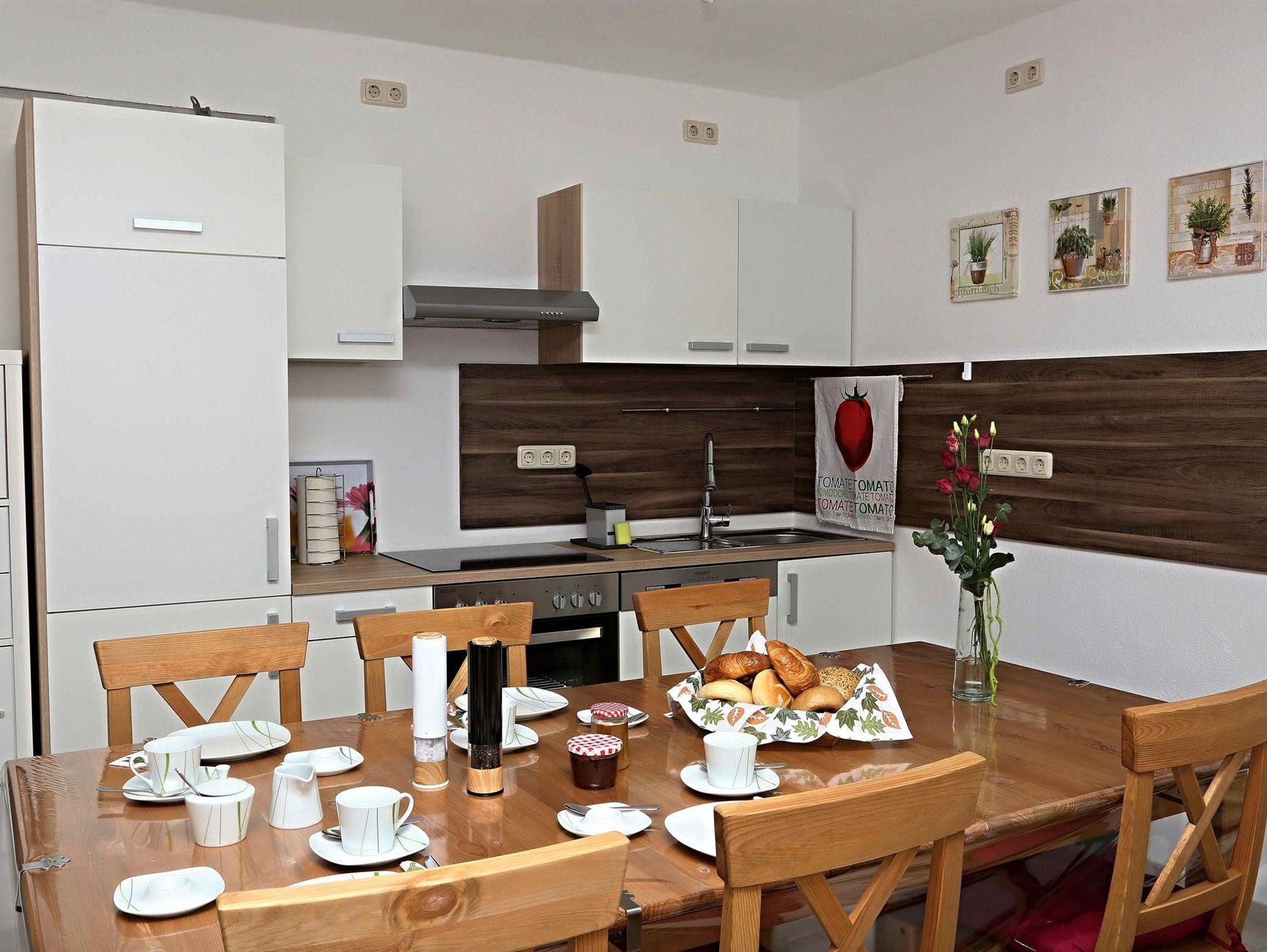 Einrichtung: Küchenzeile, Herd, Abzugshaube, Backofen, Kühlschrank, Geschirrspülmaschine, komplett ausgestattet mit neuen Tellern, Schüsseln, Besteck, scharfen Messern, Schneidebrett, Töpfen, Gläsern, Kaffeemaschine, Toaster, Wasserkocher, Eierkocher, TV, großer Tisch mit 6 Stühlen, Sofa, ein paar Kissen und freiem W-Lan Anschluss.