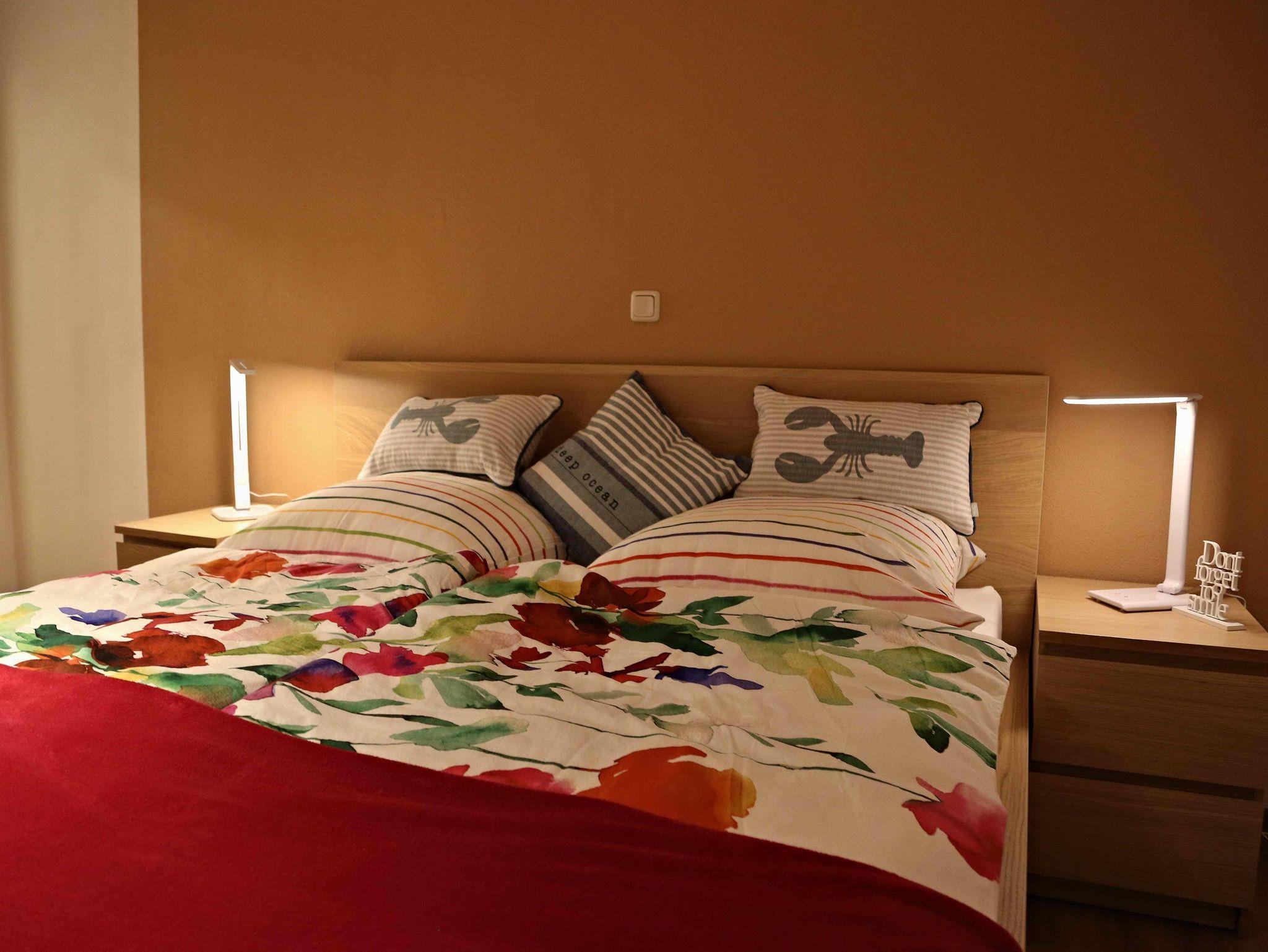 5. Zimmer: Extra großes Schlafzimmer mit Doppelbett, 2x Nachttische, 2x Nachttischlampen dimmbar mit jeweils einer Ladestation für einen USB Port, 2x Matratzen, 2x Decken, 2x Kopfkissen, 2x Zusatzdecken, extra Kissen wenn gewünscht, alles neu