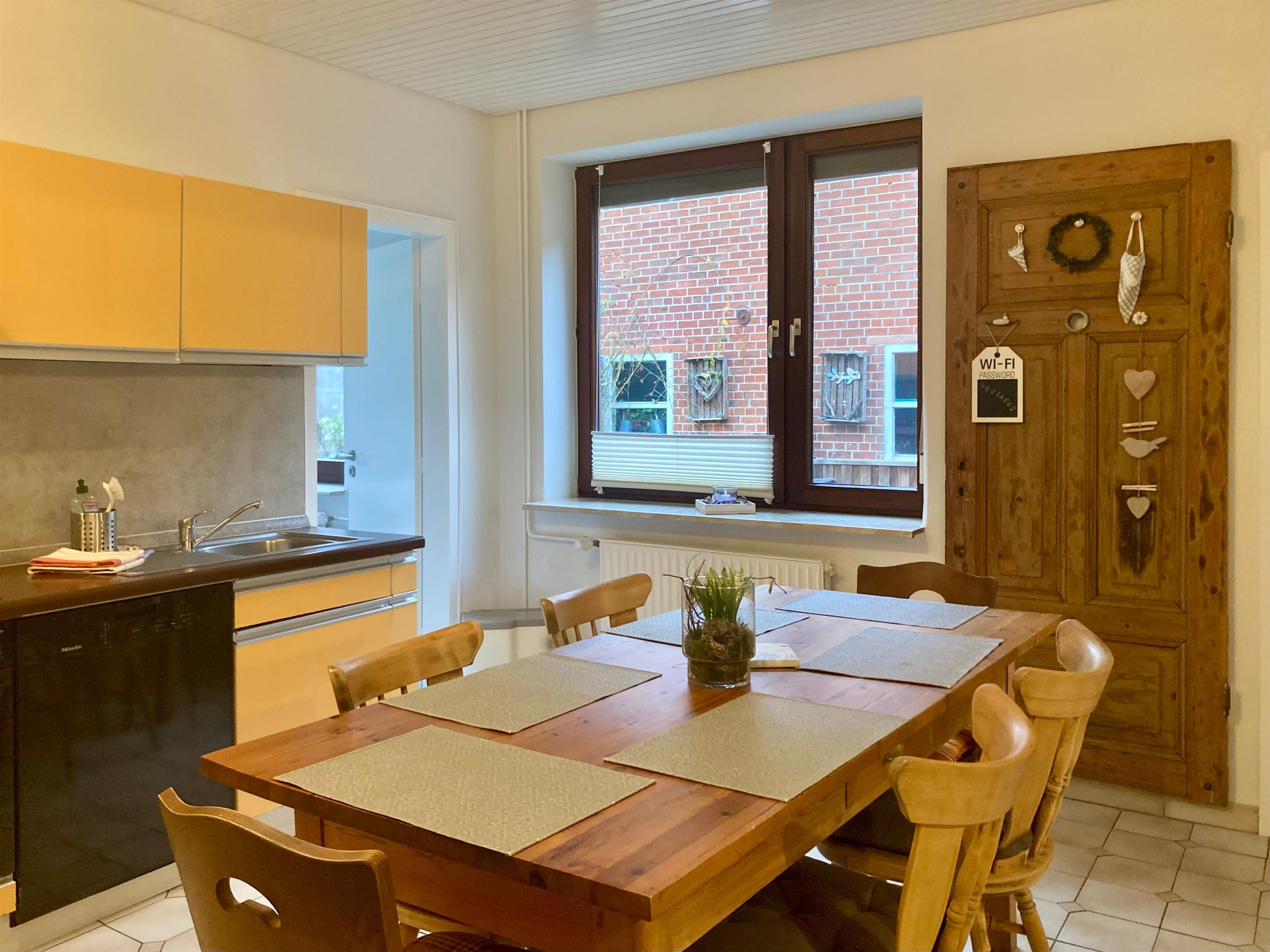 WING140: Freundlich-helle, großzügig geschnittene Ferienwohnung mit rund 100m² Wohnfläche. Eingang über den Hof ins Erdgeschoß: Wohnflur mit Ausgang zur Terrasse. Wohnraum mit Sitzgruppe, Sat-TV, W-LAN und Radio, offener Übergang zu abgeteiltem Essbereich. Separate Küche mit Einbauherd (4 Ceranfelder, Backofen), Mikrowelle, Geschirrspüler, Kühl-/Gefrierkombination, Kaffeemaschine, Wasserkocher, Toaster und weiterem Essplatz. Doppelzimmer mit Sat-TV. Schlafzimmer mit franz. Bett (1,40m breit) und Einzelbett. Dusche/WC mit Fußbodenheizung , Waschmaschine und Fön.