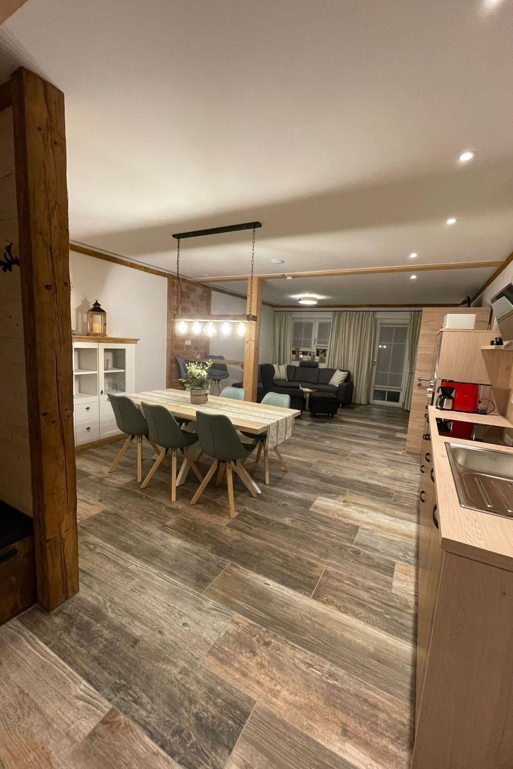 Have fun in this stylish accommodation, whether as a family, with friends or just the two of you, if you prefer large rooms and two bedrooms. The flat is called "Zirbe" because it is furnished with Swiss stone pine wood in the bedrooms, the perfect basis for a dreamy sleeping environment. A private infrared sauna and a whirlpool bath also ensure a wellness holiday and stress relief within your own four walls! We have furnished this flat with lots of love and wood in a traditional Bavarian modern style with matching furniture, crockery and accessories. The open-plan living room is furnished with a comfortable pull-out sofa, wing chair and footstool, a cosy reading corner by the electric fireplace, a 65-inch flat-screen TV and a bar where you can also work with your laptop. The cosy dining area is furnished with a large dining table, 6 chairs and a display cabinet filled with crockery and glasses. A modern kitchenette fully equipped with pots and pans and appliances is of course also included. Both bedrooms have direct access to their own bathrooms. One bathroom is equipped with a whirlpool bath, shower, washbasin and WC. The other bathroom has a large walk-in shower, washbasin and WC. Each bathroom is equipped with a hairdryer, towels, bath towels and small toiletries for first-time use. In one bedroom there is a motorised adjustable double box-spring bed and a carpenter-made loft bed measuring 80x190cm. The second bedroom has two single box-spring beds, an additional 55-inch flat-screen TV and space for a king-size bed. Everything is provided in this flat, you only need your personal belongings, nothing else. - Bread roll service - Check in from 14.00h - Check out until 10.00h - Key handover on site Up to 2 dogs per accommodation unit are welcome!