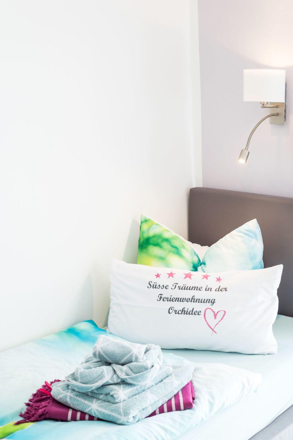 Have fun with the whole family or with friends in this stylish accommodation. The 5*star Orchidee holiday flat offers beds for 4 people and a comfortable pull-out sofa in the living room when needed. For your little ones, two ready-made travel cots measuring 60x120cm can be placed in the bedrooms and are provided free of charge. Of course, a high chair is also provided. There are also 2 bathrooms, 2 bedrooms, a private infrared sauna and a bathtub with an air bubble massage mat. A modern kitchen fully equipped with crockery, glasses and appliances. The double bed is a motorised adjustable box-spring bed, the single beds are normal box-spring beds. All beds are already made up when you arrive. Shower and hand towels, toilet paper and tea towels are also provided. The flat is fully equipped and you only need your personal belongings, nothing else. The coffee machine is a Senseo Twist which you can use either with ground coffee or coffee pods. In addition, the bedroom with the single beds has its own TV with internet connection. An electric fireplace in the living room provides additional cosy warmth on cold days in the transitional period, or you can just enjoy the visual flames :-)