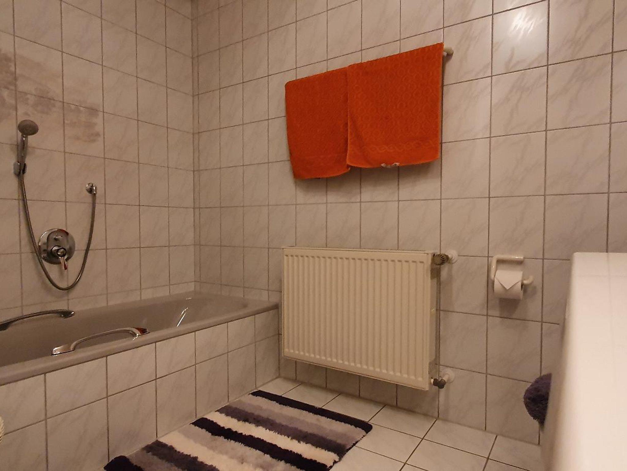 Das geräumige Bad verfügut über Dusche/ WC, Badewanne und einen Fön.