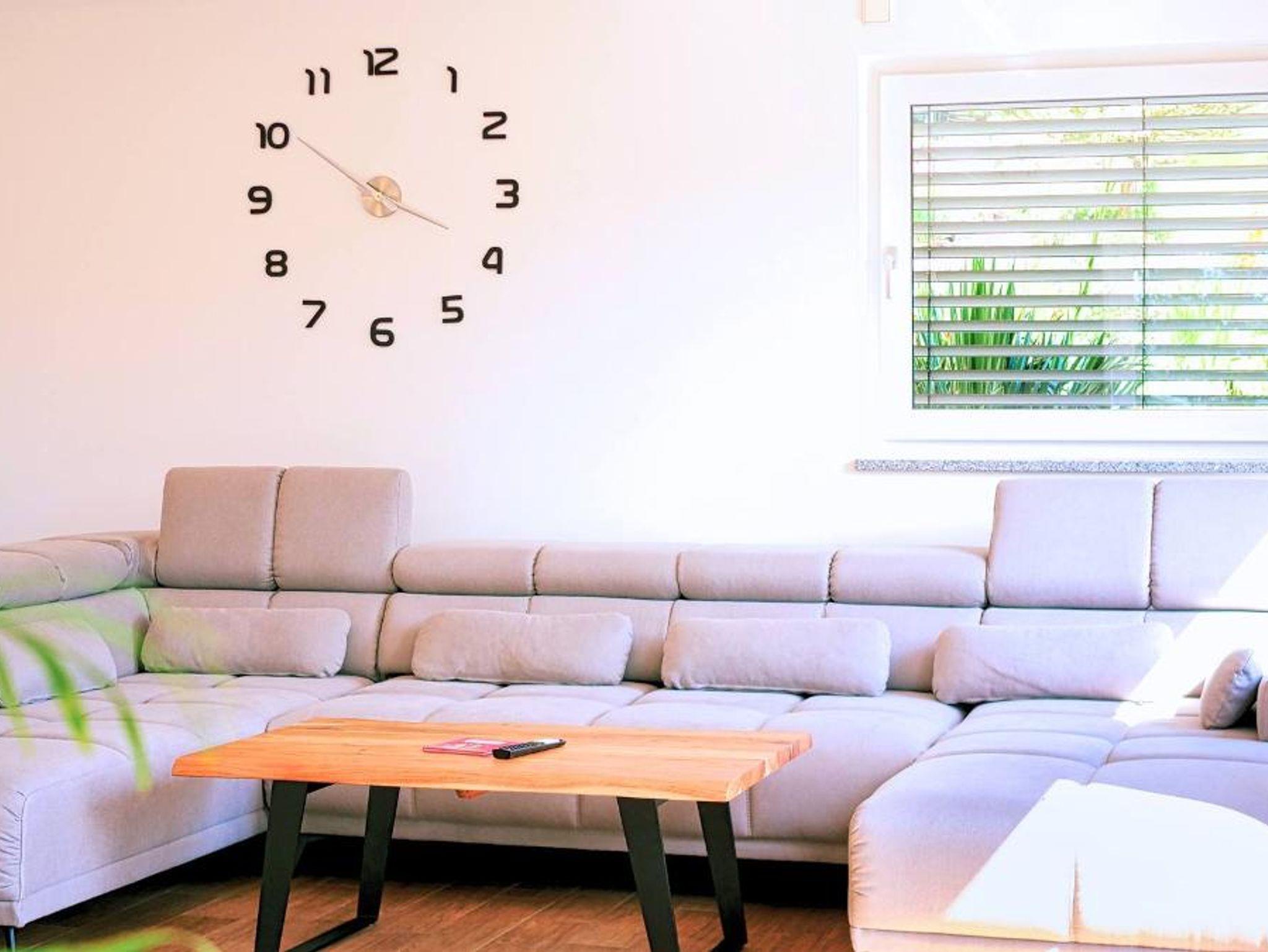 Wohnzimmer: Couchlandschaft, Echtholztisch und großer LED-TV