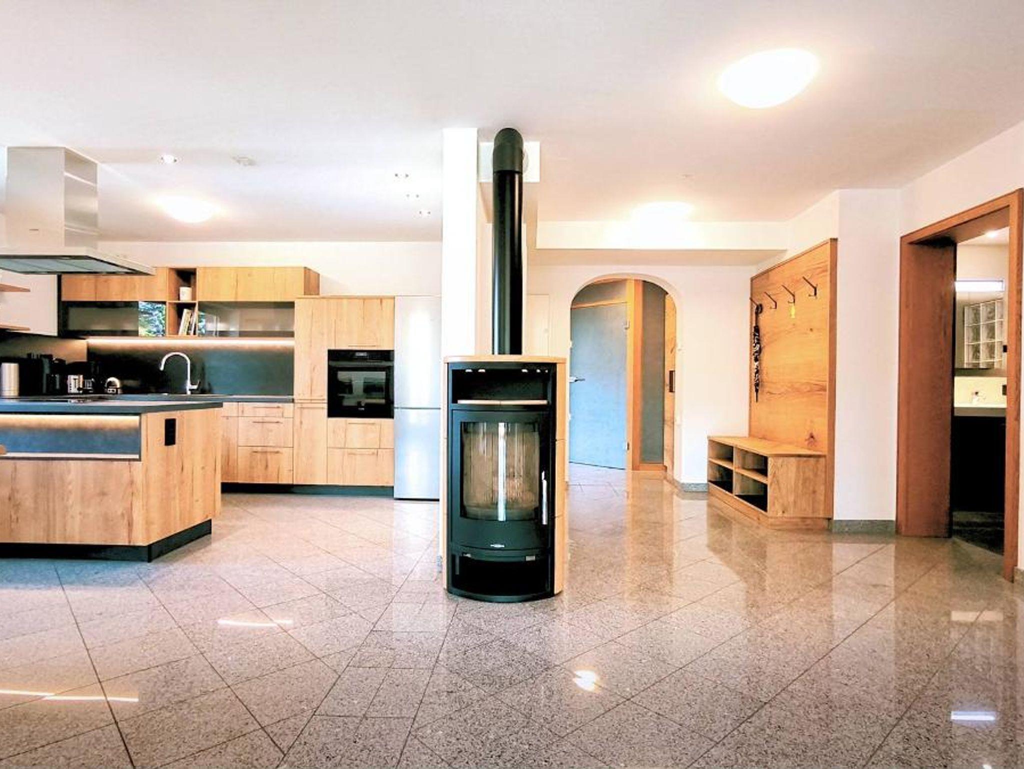 Küche: Exklusive Küche mit hochwertigen Elektrogeräten, Schwedenofen, Esstisch “wie der Baum gewachsen ist”, dazu bequeme rückengerechte Schwingstühle.
