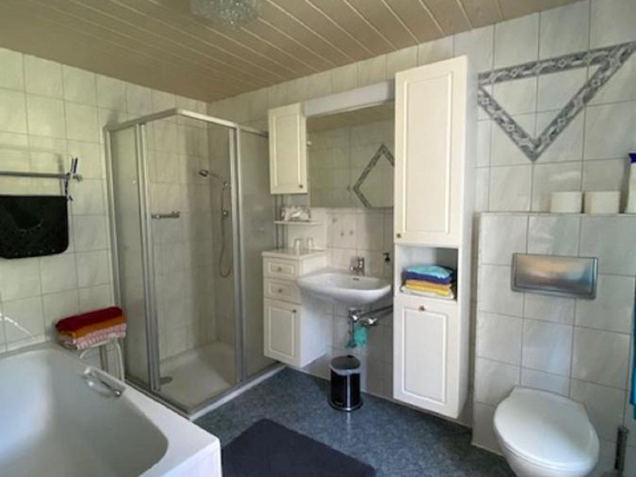 Bad mit Badewanne und Dusche, große Terrasse mit Sitzgelegenheiten und Grillanlage;