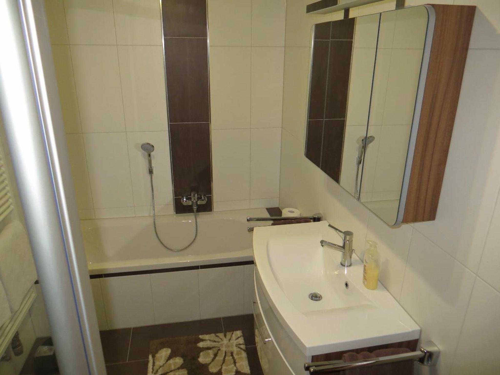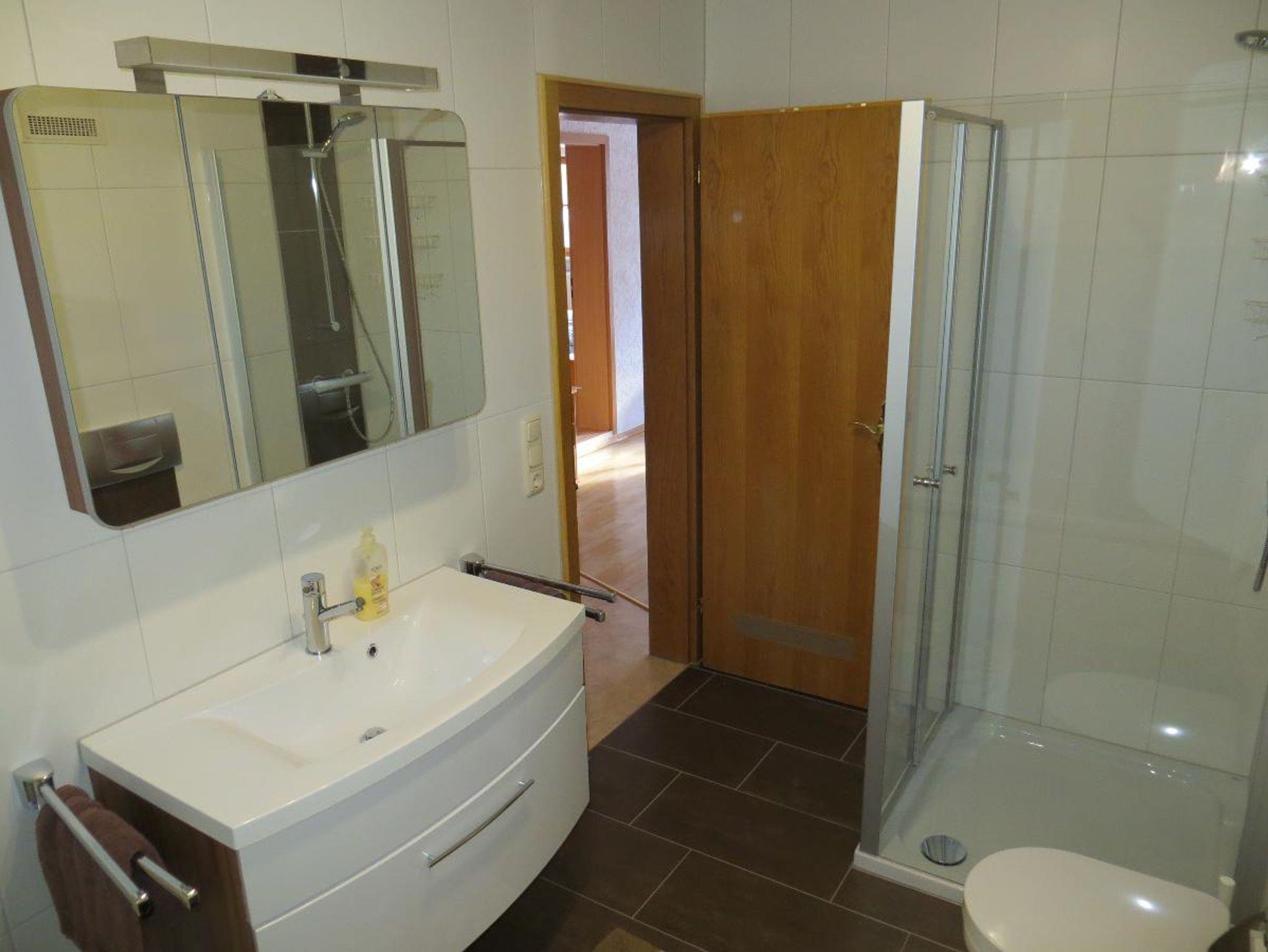 Das Bad verfügt über eine nahezu ebenerdigen Dusche, einer Badewanne, WC und einem Spiegelschrank. Ein Fön ist ebenfalls vorhanden.