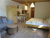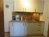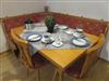 Die Wohnküche besteht aus einer komplett eingerichteten Küchenzeile, einer gemütlichen Essecke und einem Wohnbereich mit Ecksofa. Im Wohnbereich befindet sich ein Flachbildfernsehgerät.